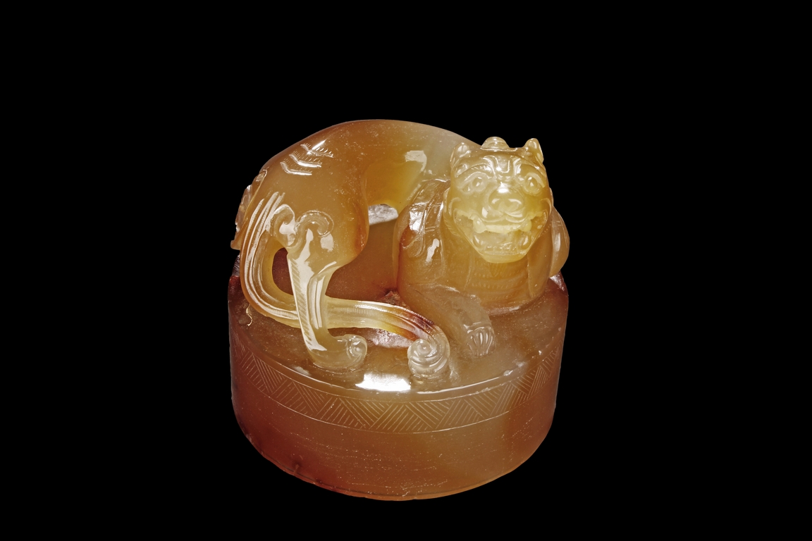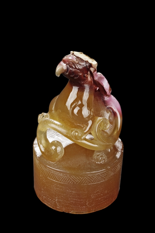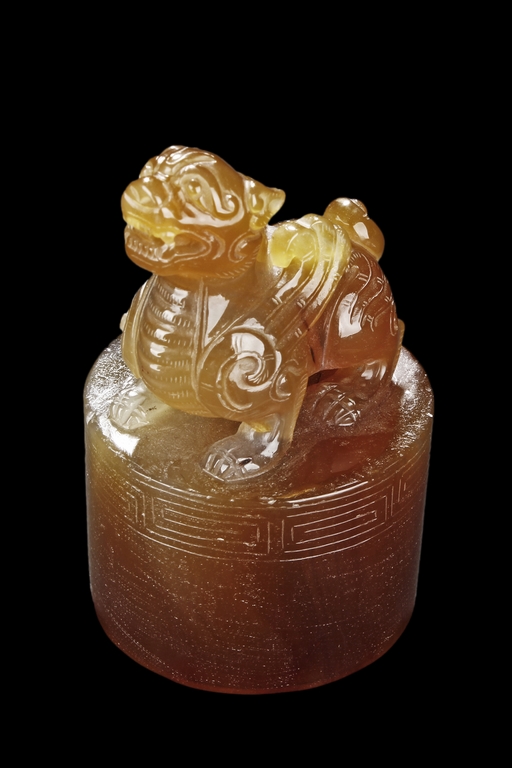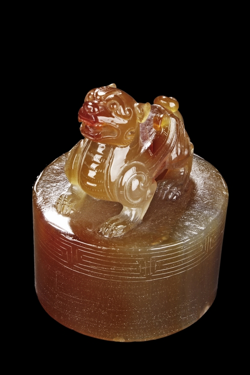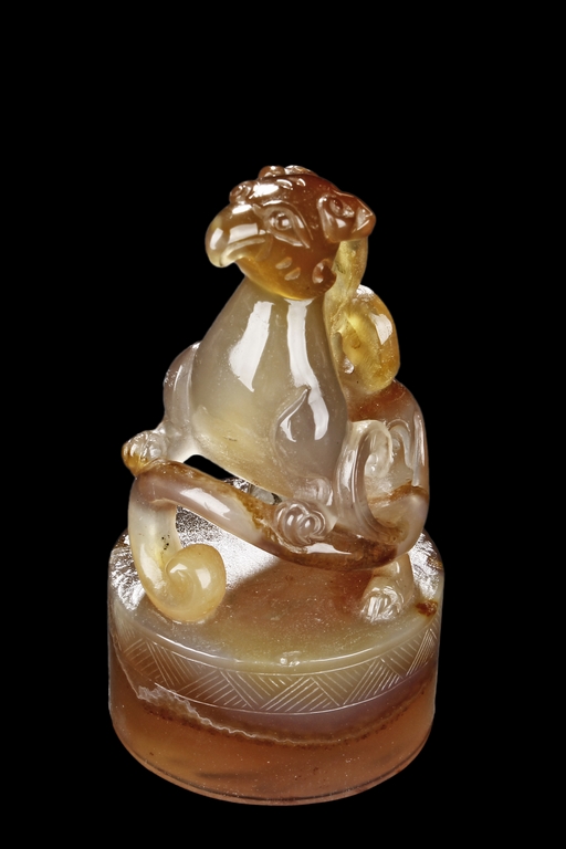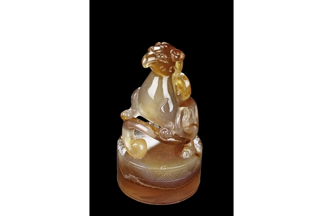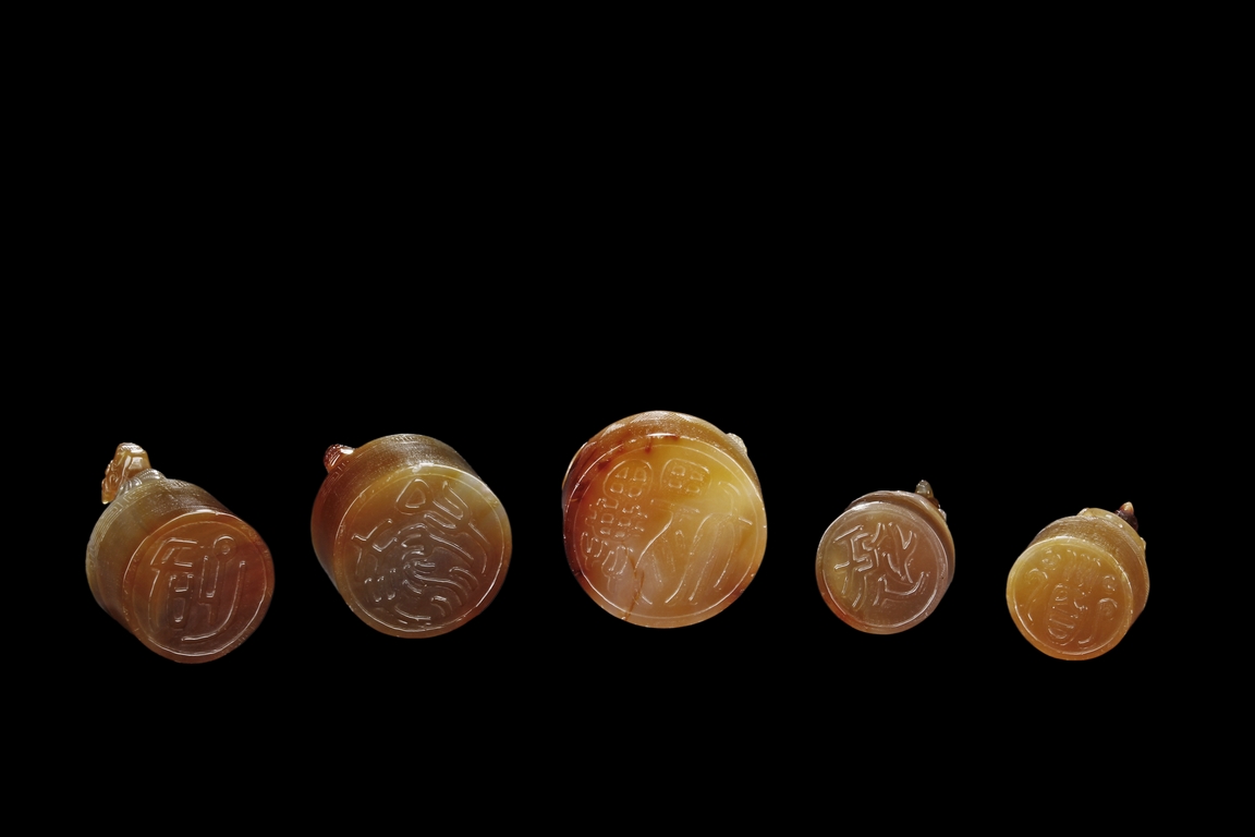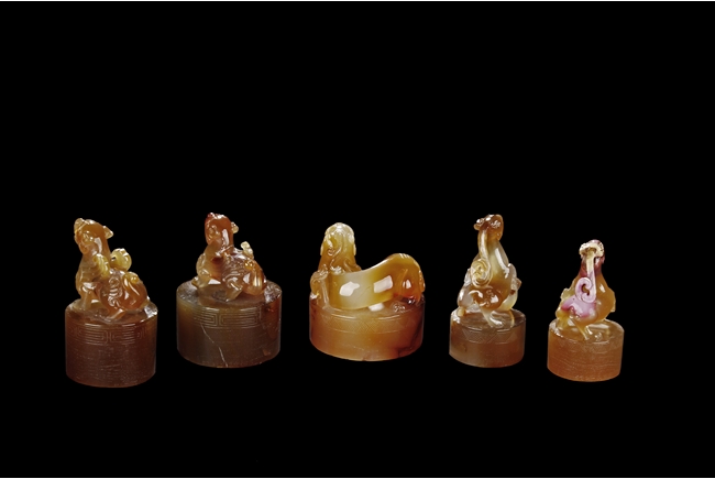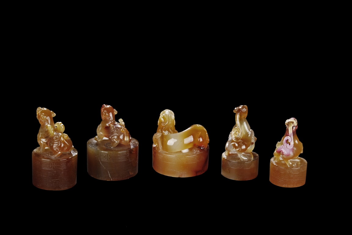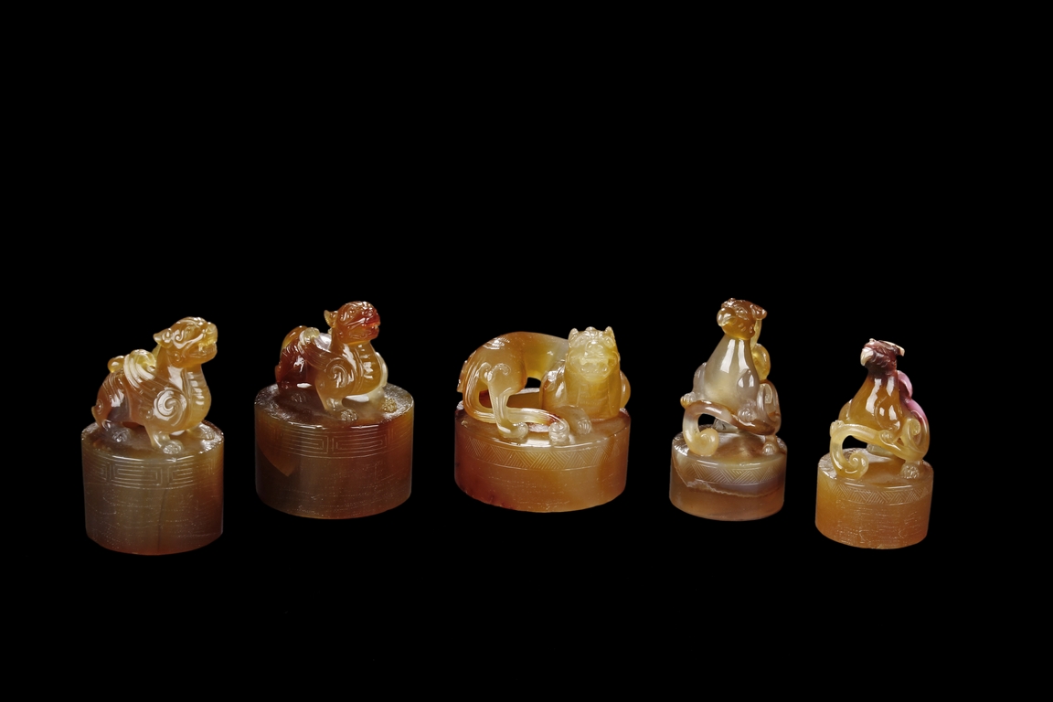 This set consists of five agate seals, including two seals surmounted with model of Bixie standing foursquare, two seals surmounted with model of phoenix, and one seal surmounted with a recumbent Bixie figure, all in the form of short cylindrical shape.