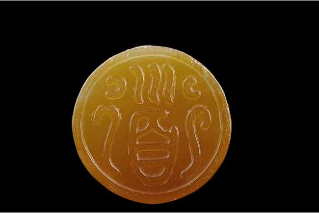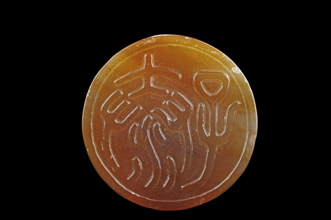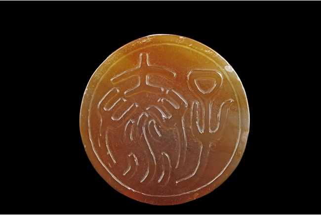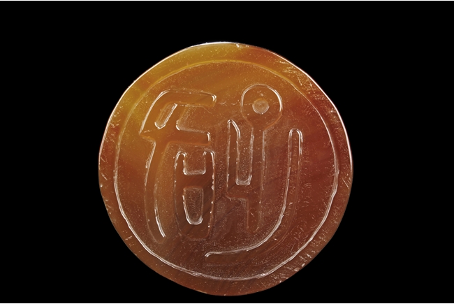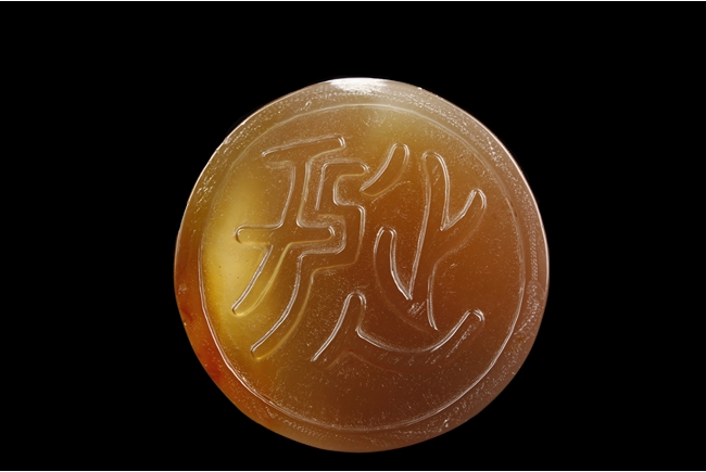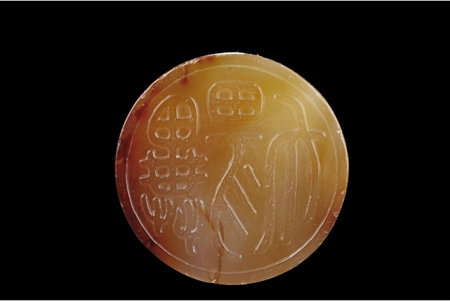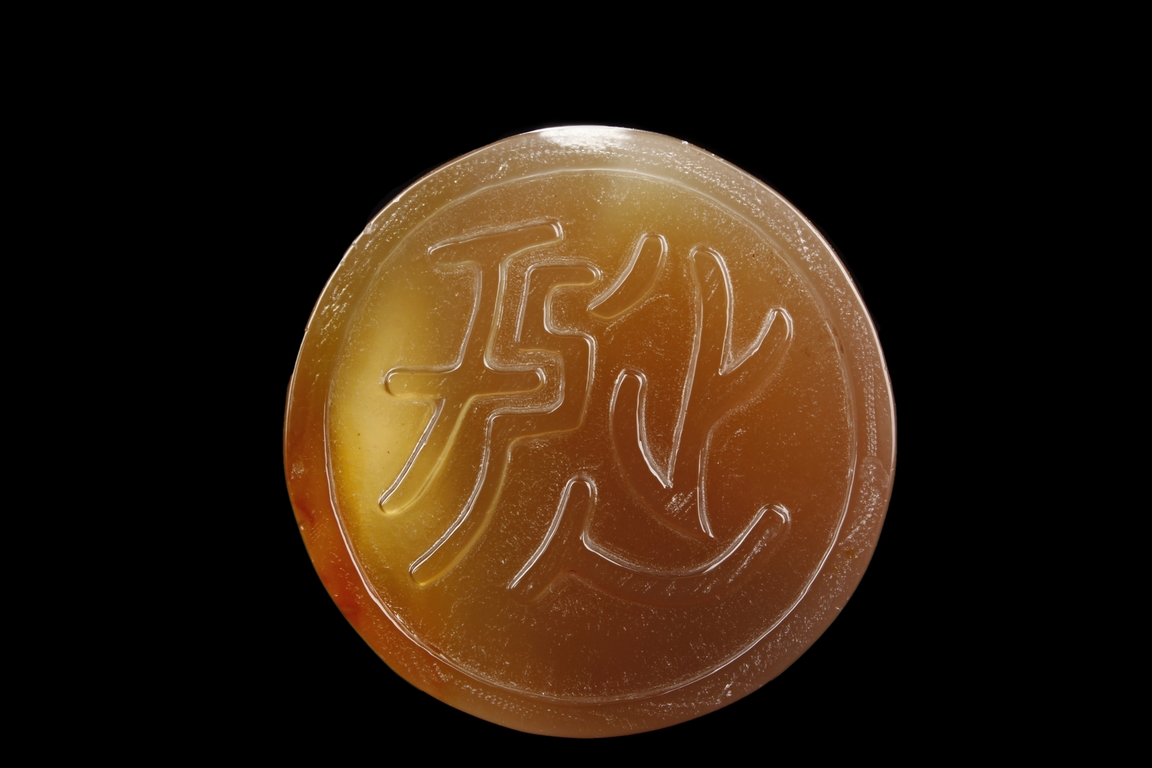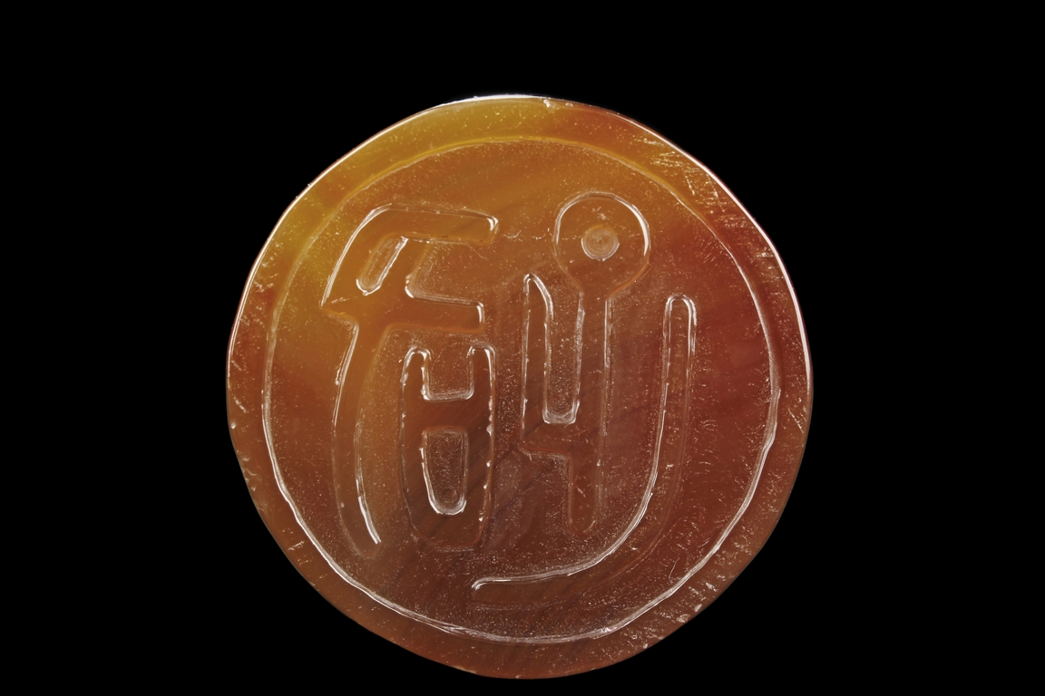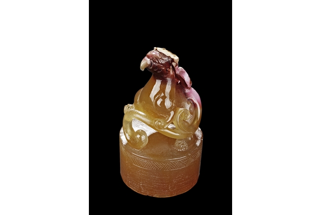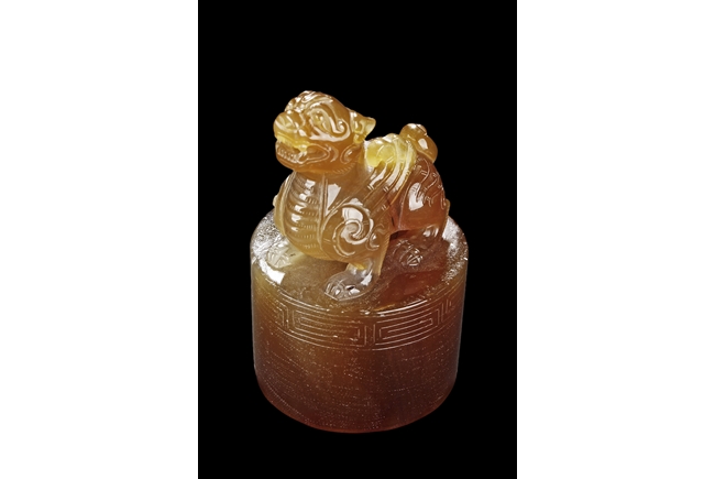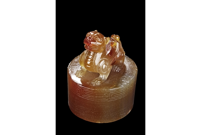 This set consists of five agate seals, including two seals surmounted with model of Bixie standing foursquare, two seals surmounted with model of phoenix, and one seal surmounted with a recumbent Bixie figure, all in the form of short cylindrical shape.