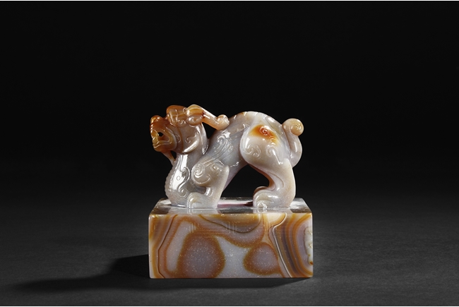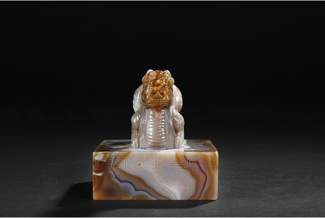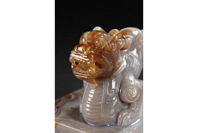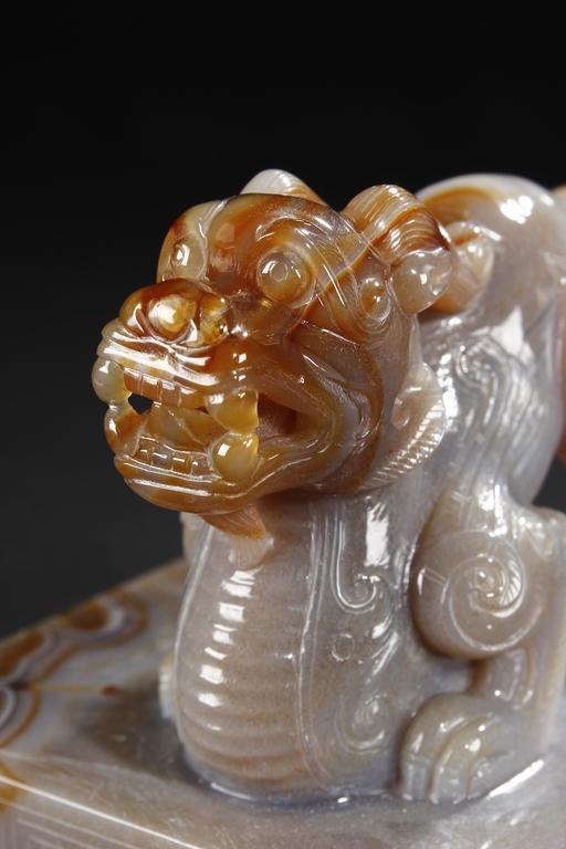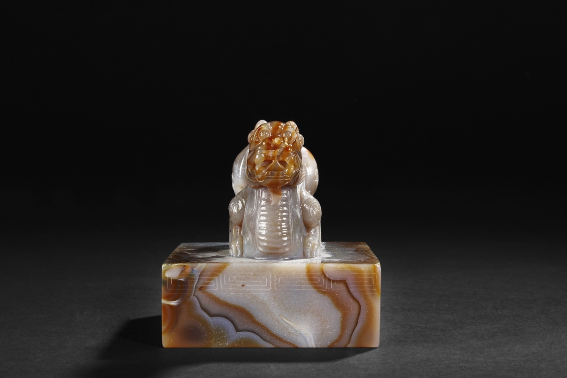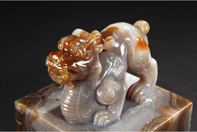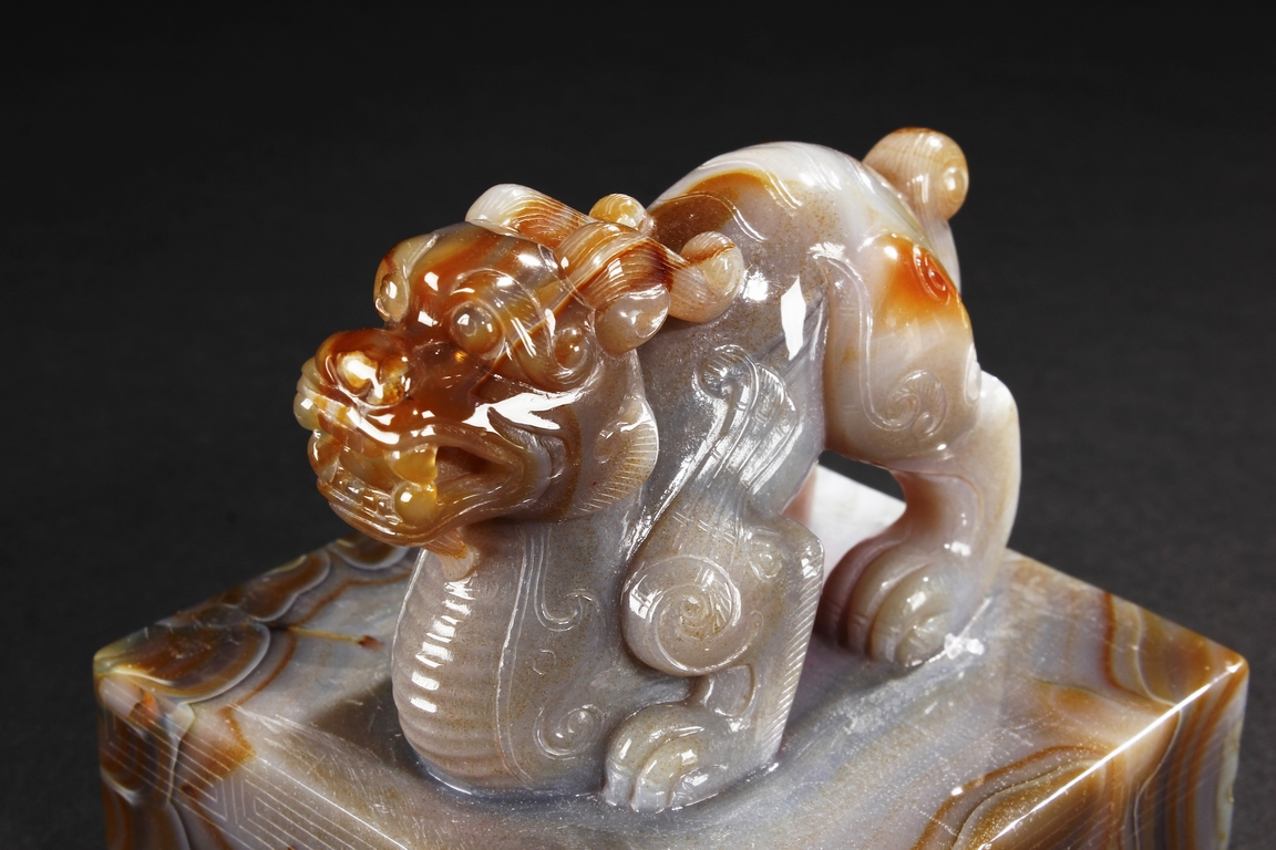 The seal is of rectangular form, the sides carved with scrolling key-fret patterns, the top carved with a mythical beast Qilin standing on four legs, bulging eyes, open mouth, two horns towards the back, and wings close to body. The agate stone has natural patterns and colors.