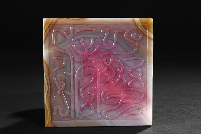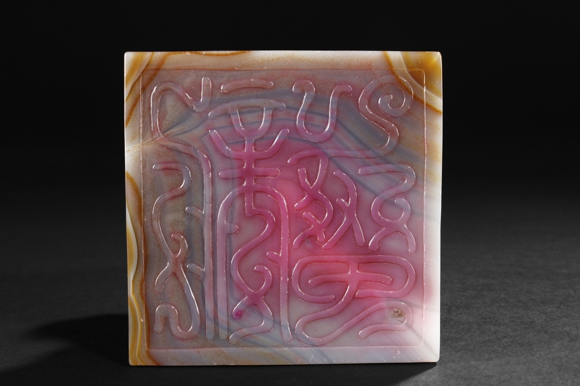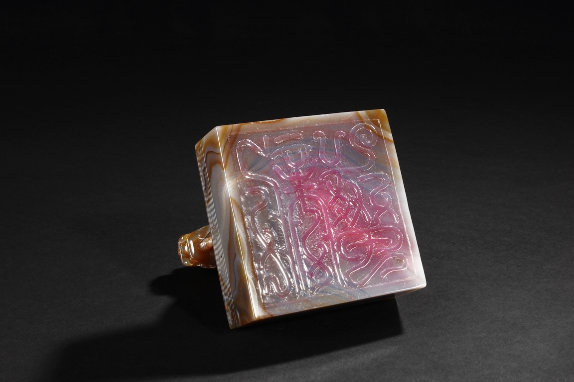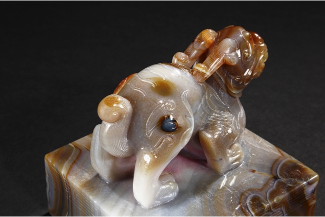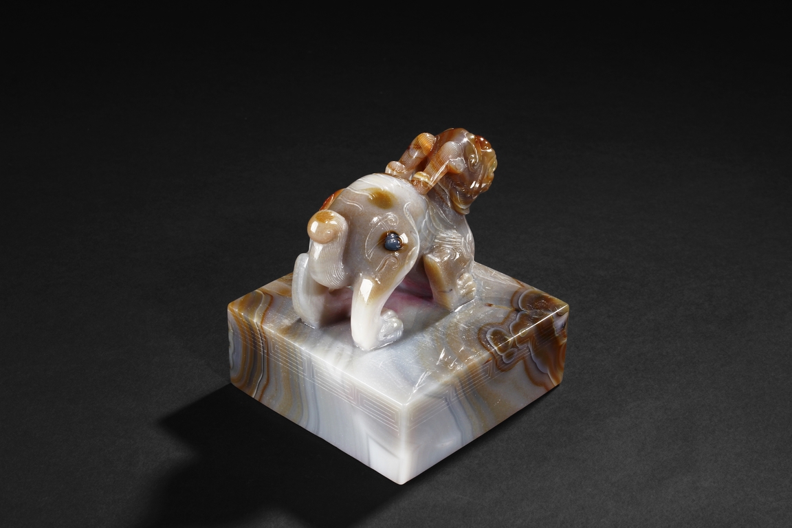 The seal is of rectangular form, the sides carved with scrolling key-fret patterns, the top carved with a mythical beast Qilin standing on four legs, bulging eyes, open mouth, two horns towards the back, and wings close to body. The agate stone has natural patterns and colors.
