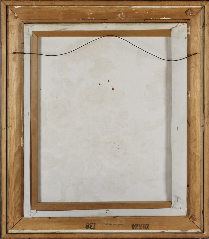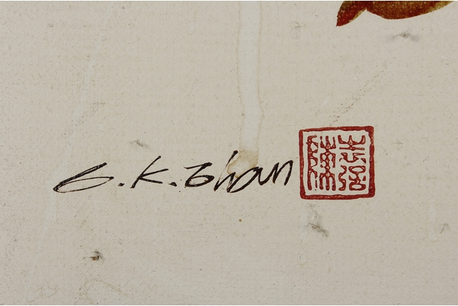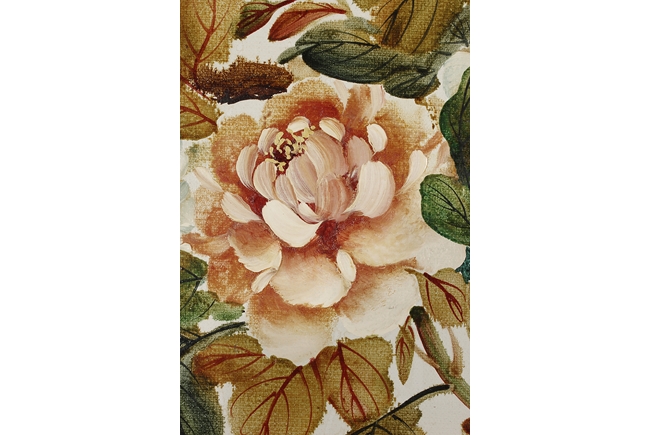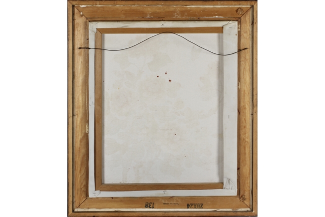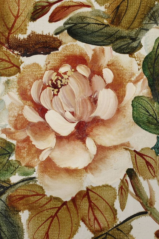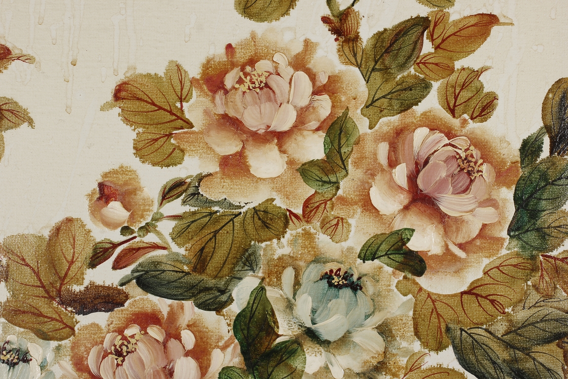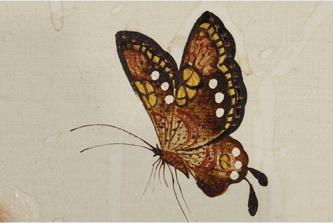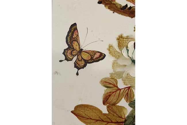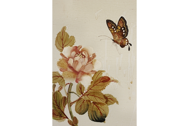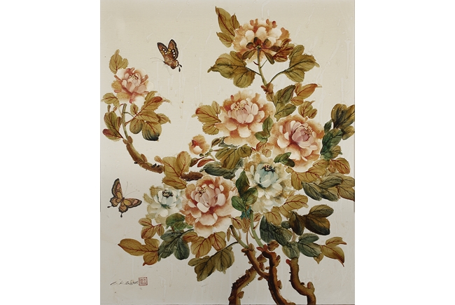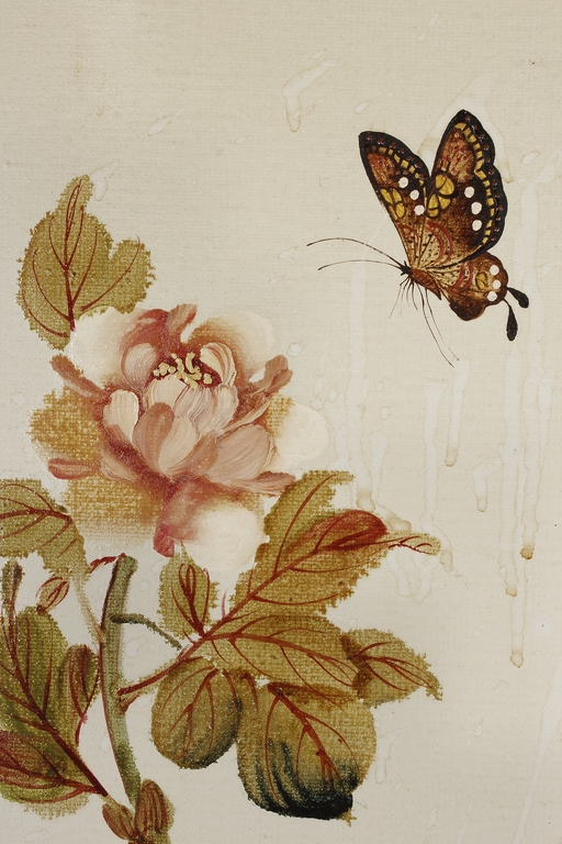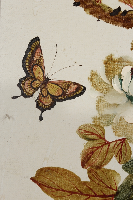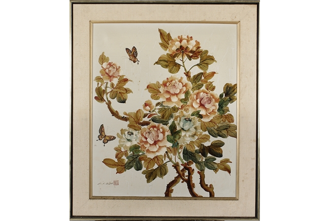 The framed oil painting depicts colorful flowers blossoming in all directions, with two butterflies flying nearby. Artist signature and mark on bottom left.