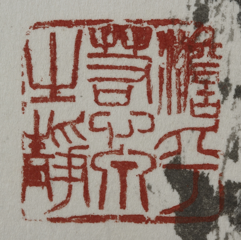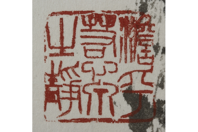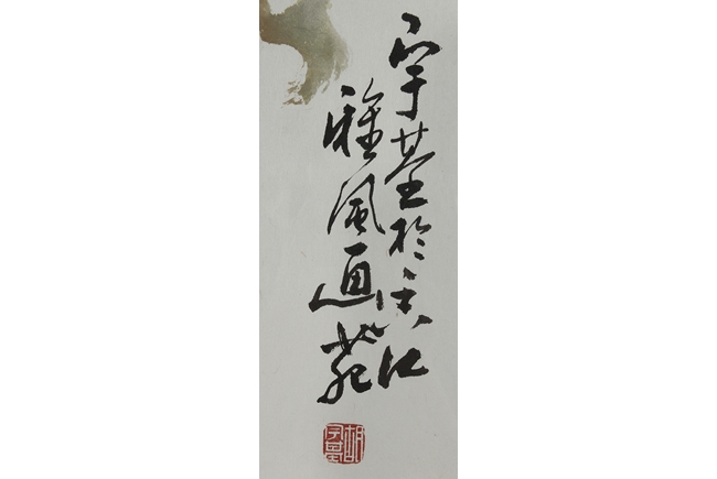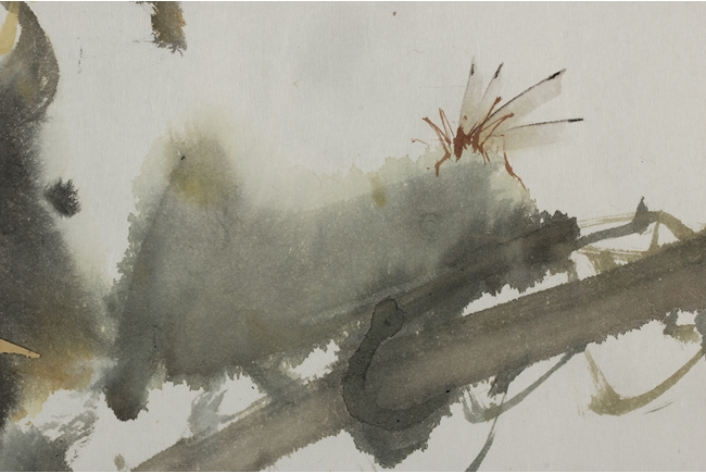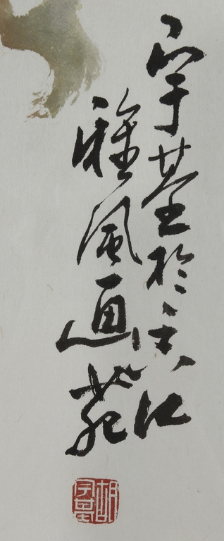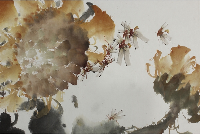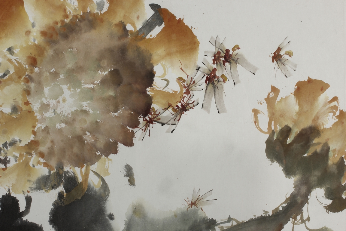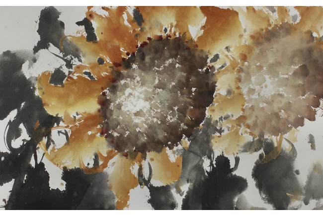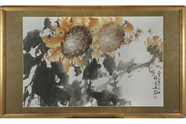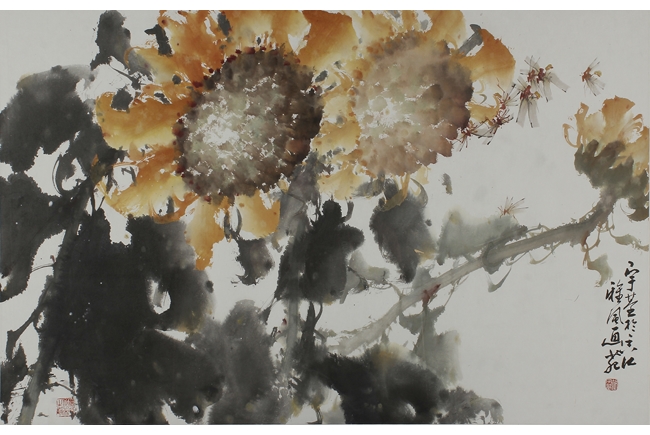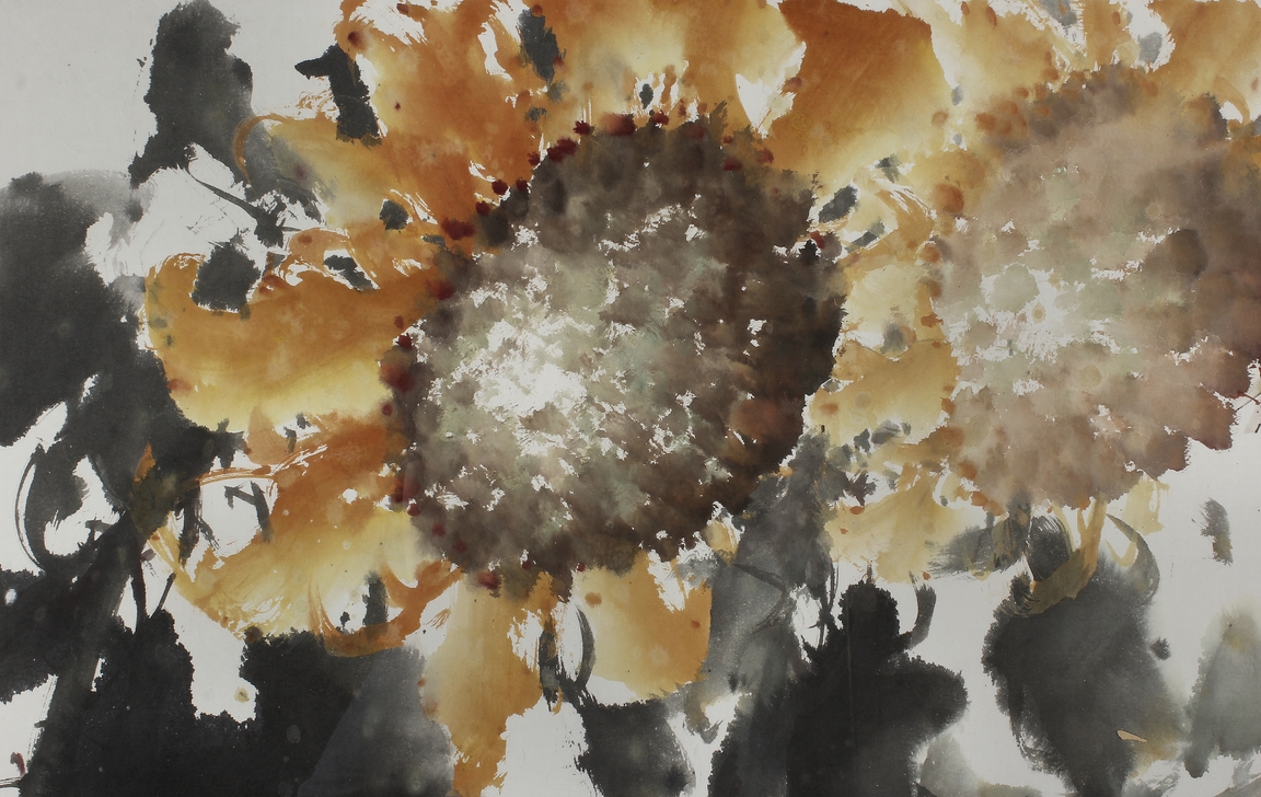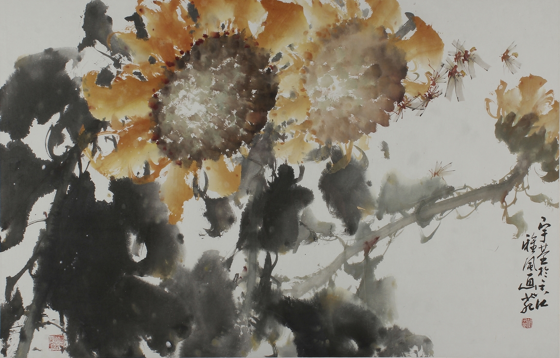 Colored splash painting on paper, the painting depict blossoming sunflowers, the leaves and branches mostly in monochrome color. Artist colophon, signature, and mark on the bottom right, additional mark on the bottom left.