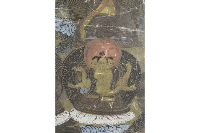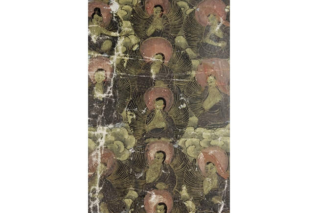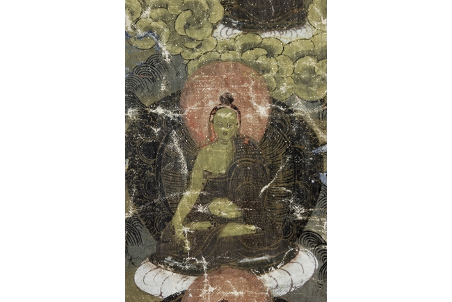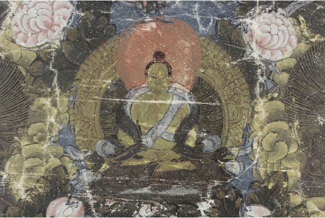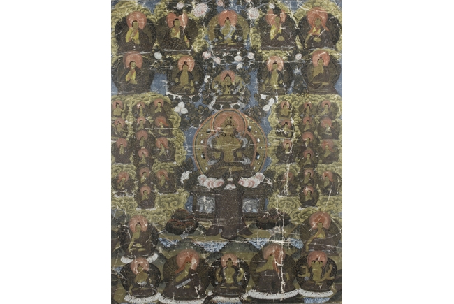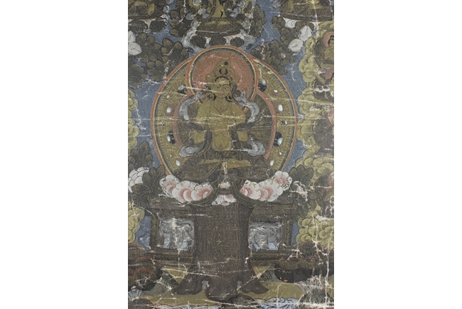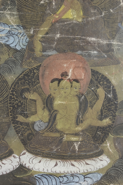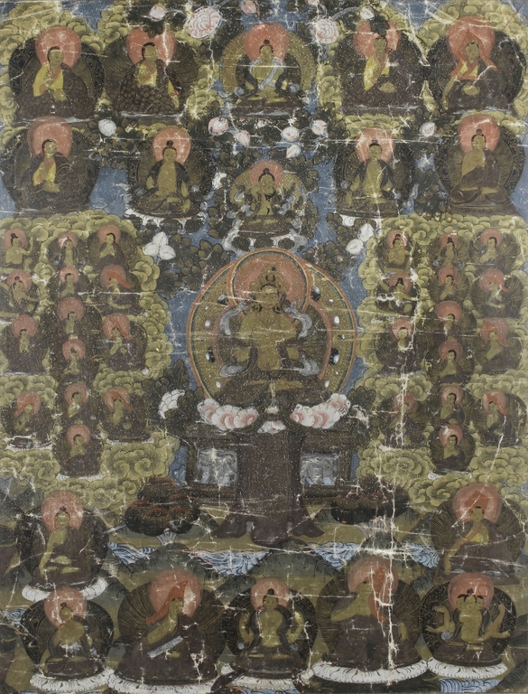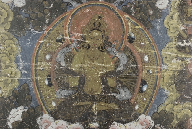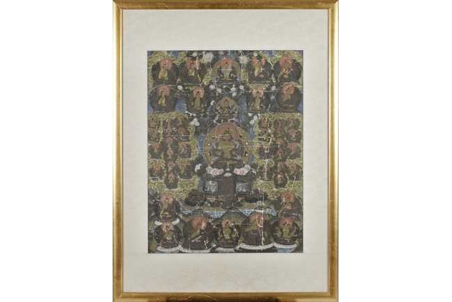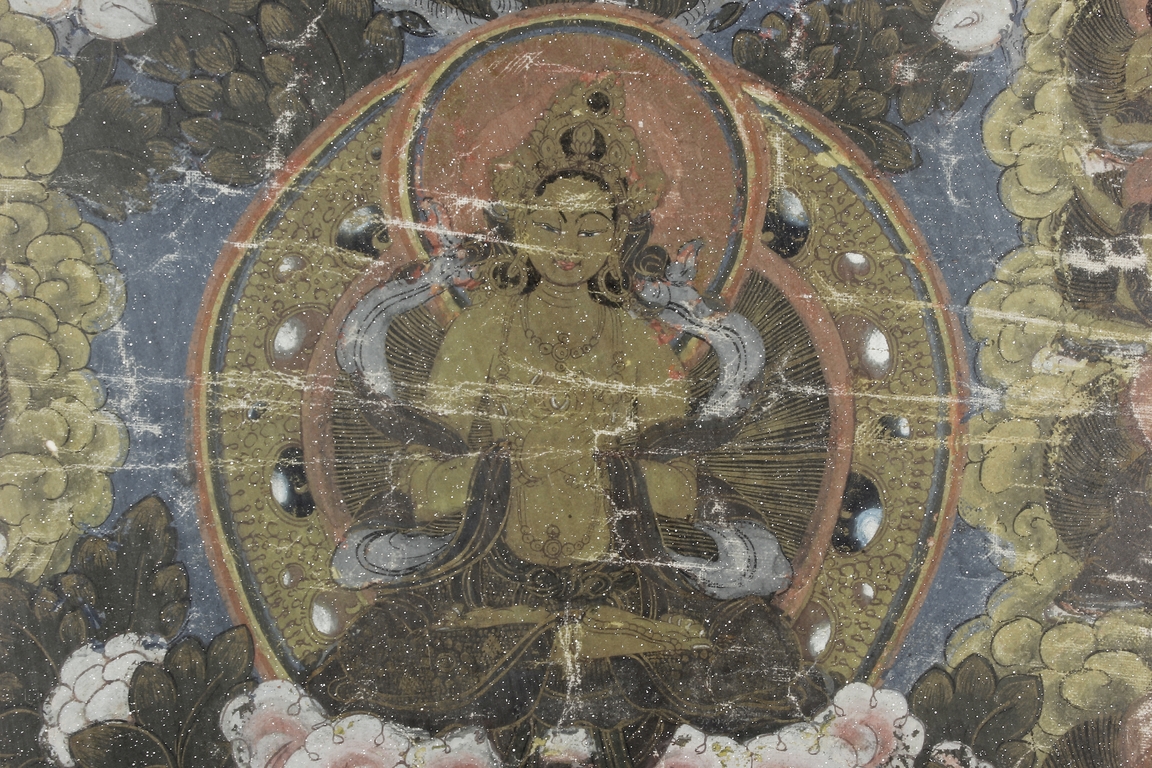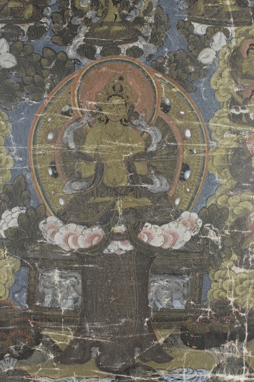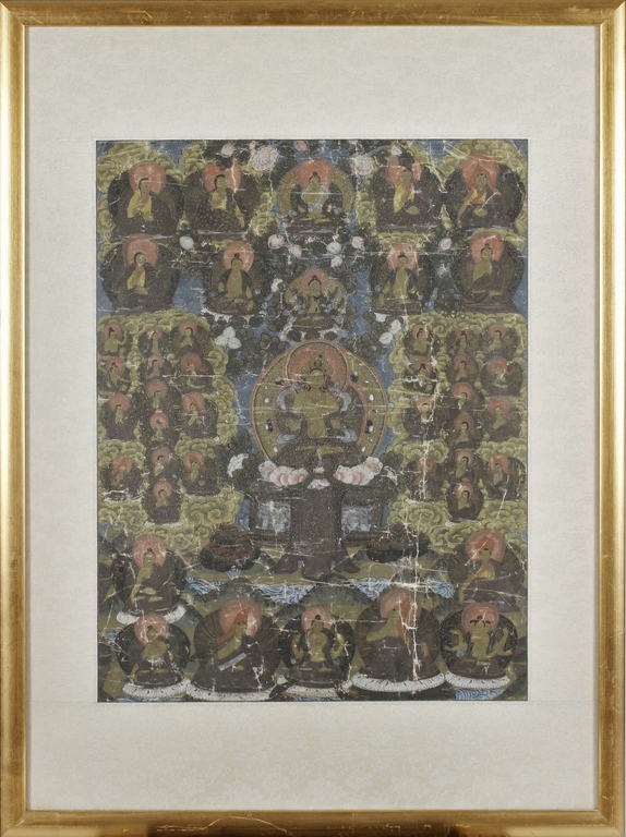 With the Bodhisattva seated on the center, wearing a loose robe with billowing ribbon his face is shown with a benevolent expression and backed by nimbus and circular aureole, along with various Buddhas and Bodhisattva's set amidst clouds, all backed by circular aureole. Qing Dynasty period.