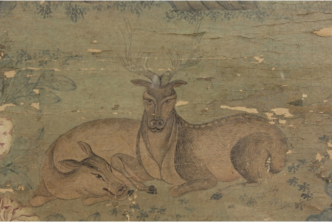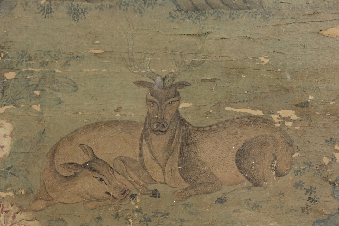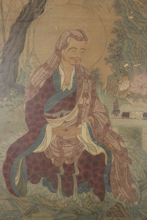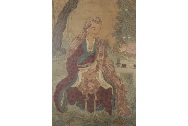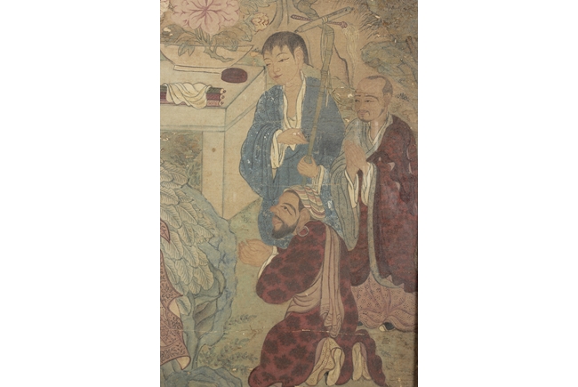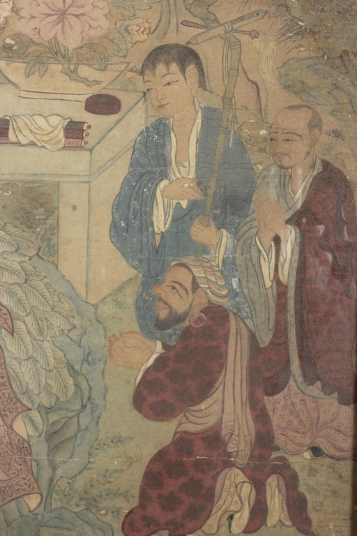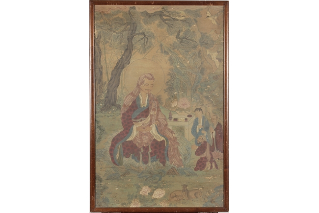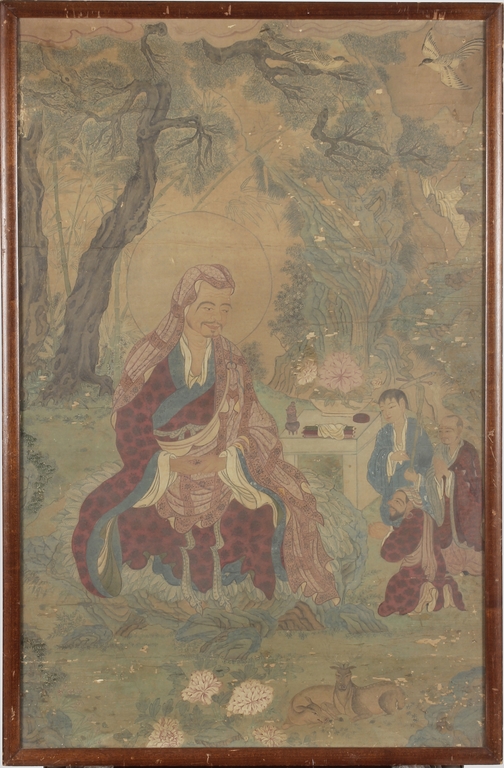 The framed colored painting depicts three worshippers praying to the deity in a forest setting, with animals, trees, and birds in the background.