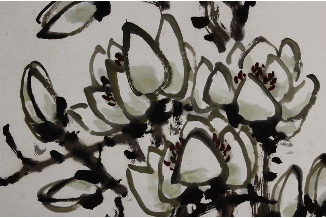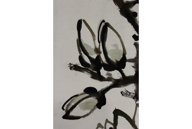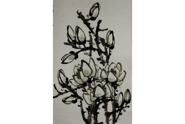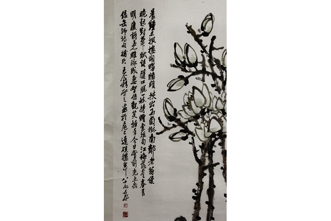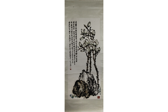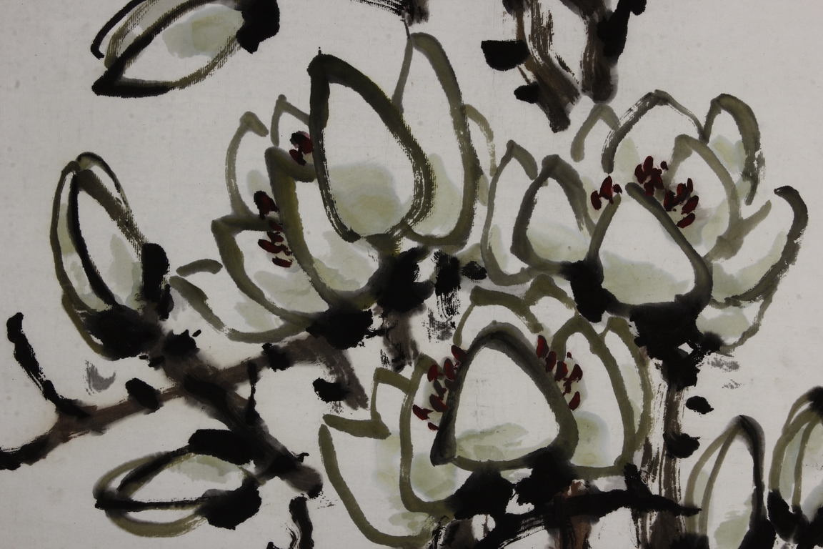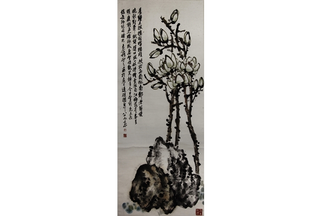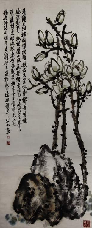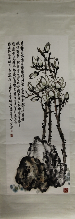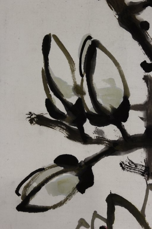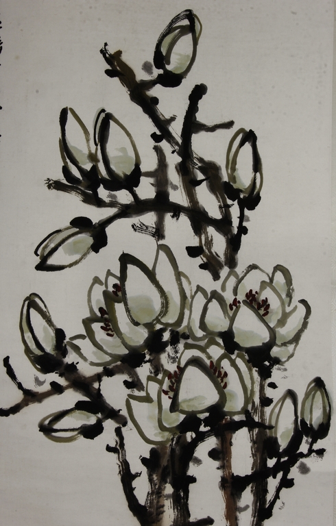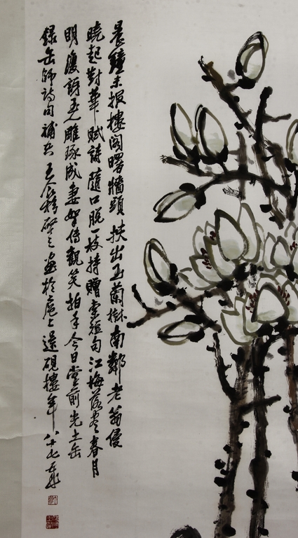 A color and ink painting, vertical scroll. The painting depicts three branches of magnolia flowers, some blossomed and some still in bulb form. Colophon, artist signature and mark on the left side, additional mark on bottom right.