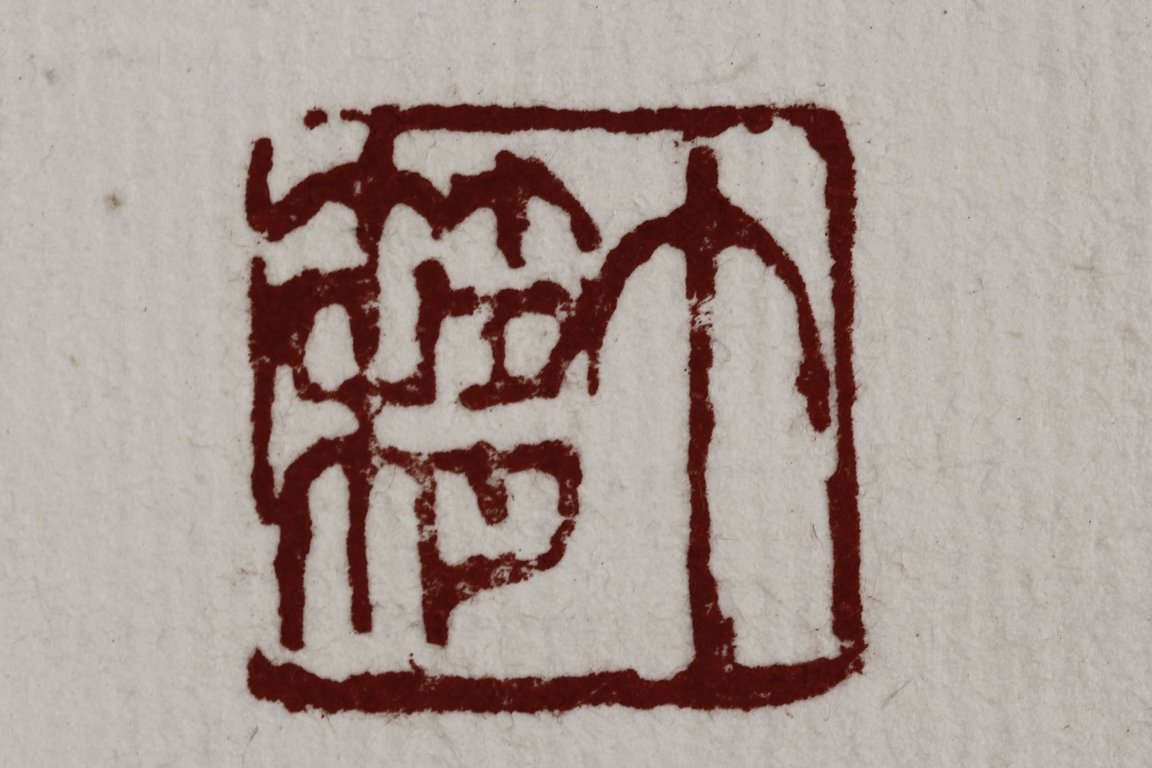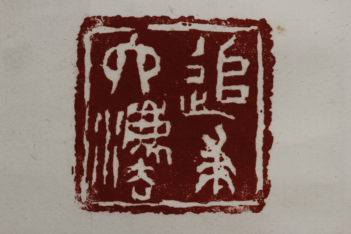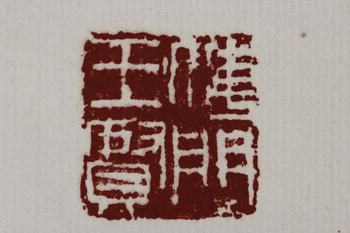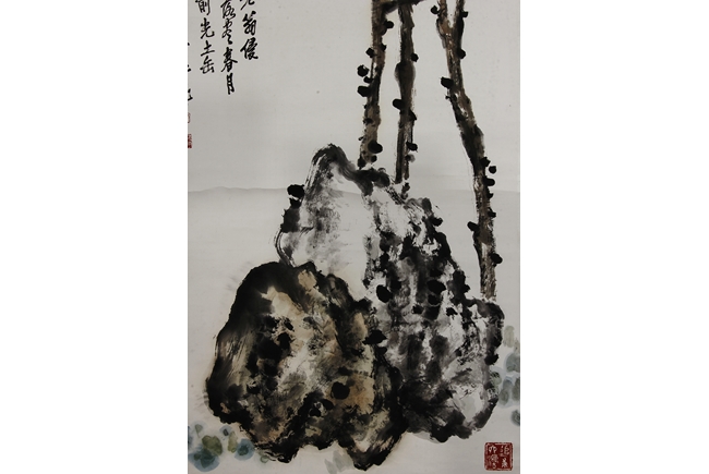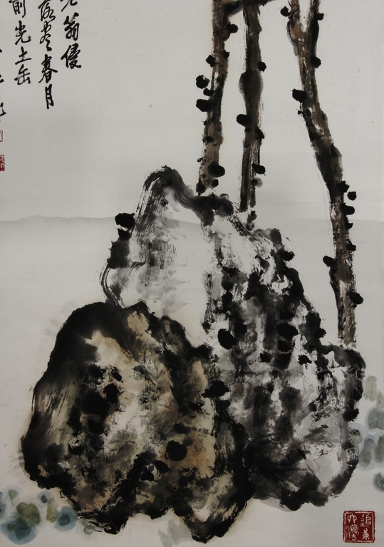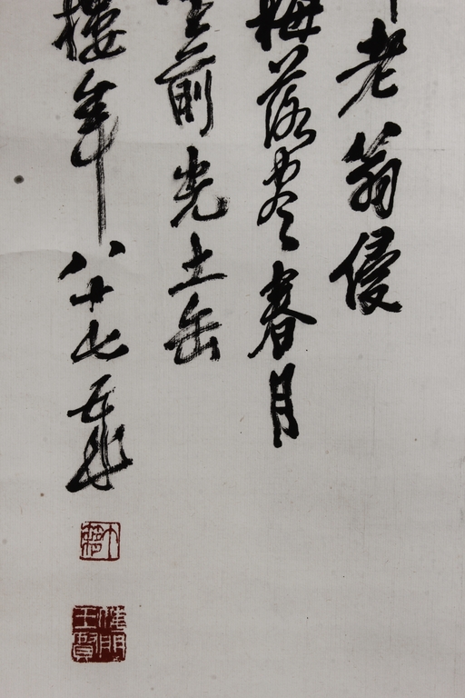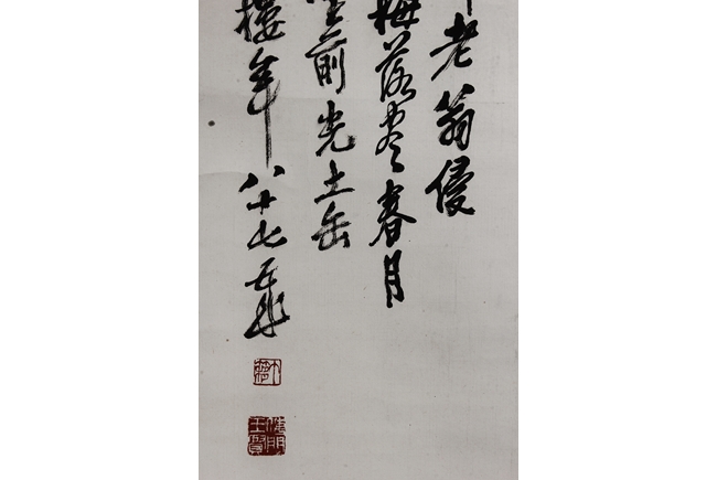 A color and ink painting, vertical scroll. The painting depicts three branches of magnolia flowers, some blossomed and some still in bulb form. Colophon, artist signature and mark on the left side, additional mark on bottom right.