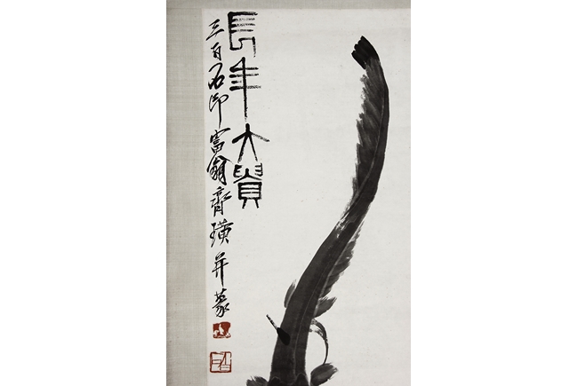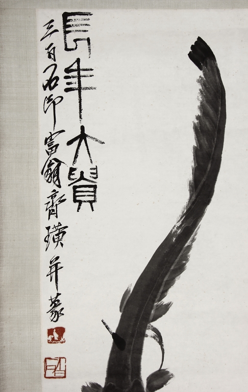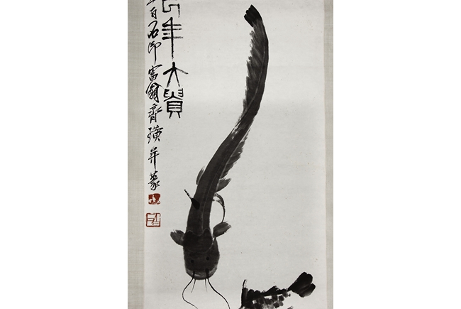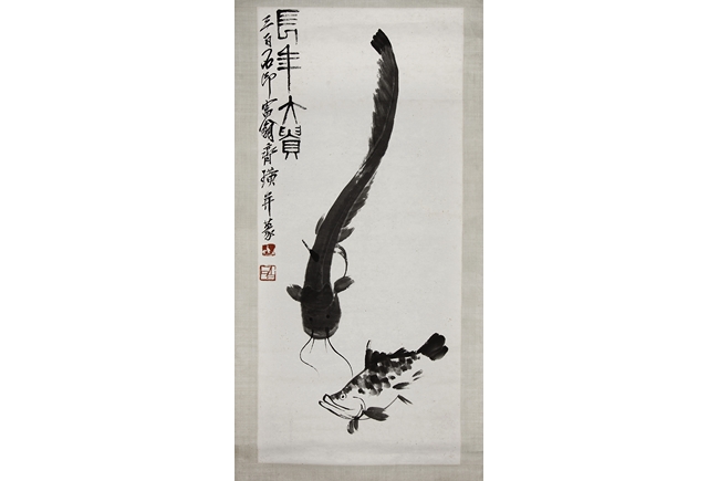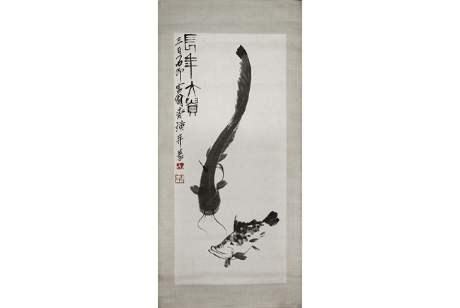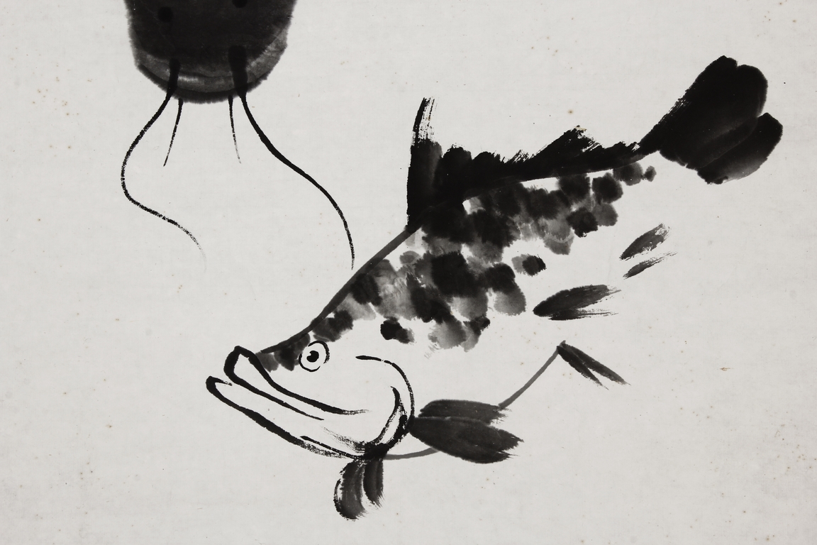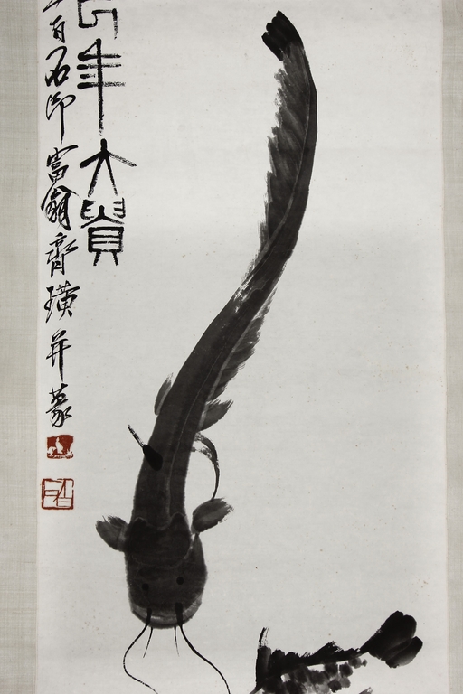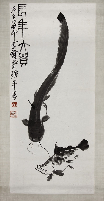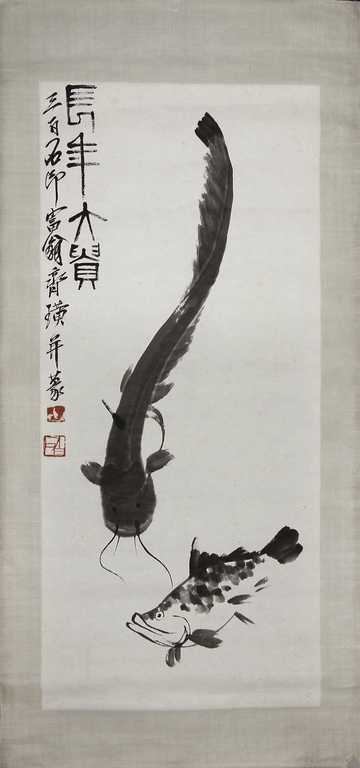 Ink on paper, scroll. The painting depicts a carp and catfish swimming. Chinese inscription and author's seal marks on the top left side.