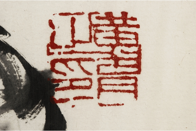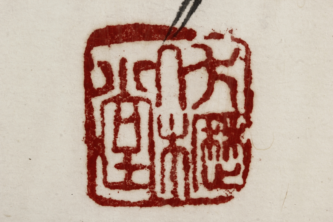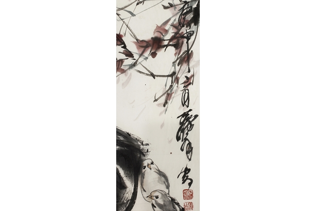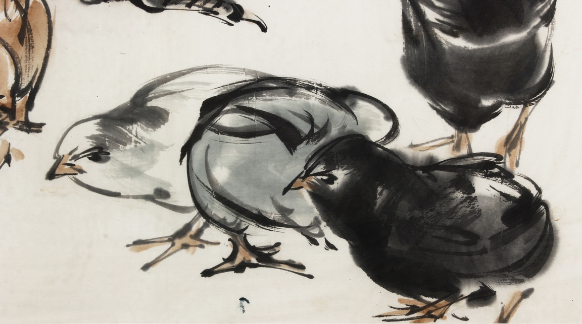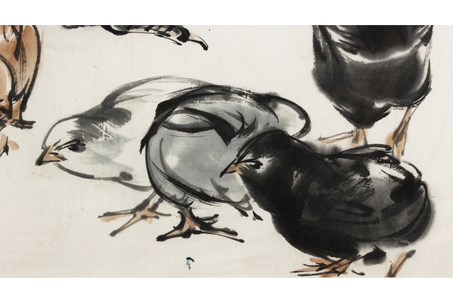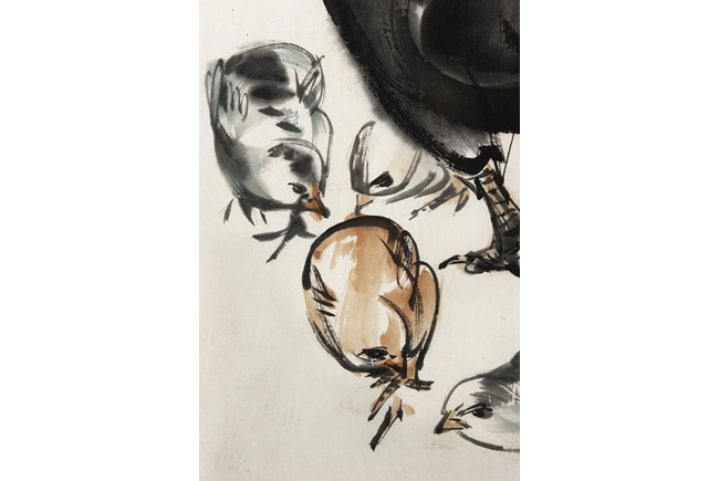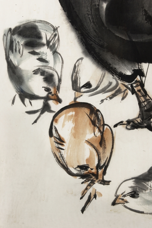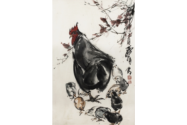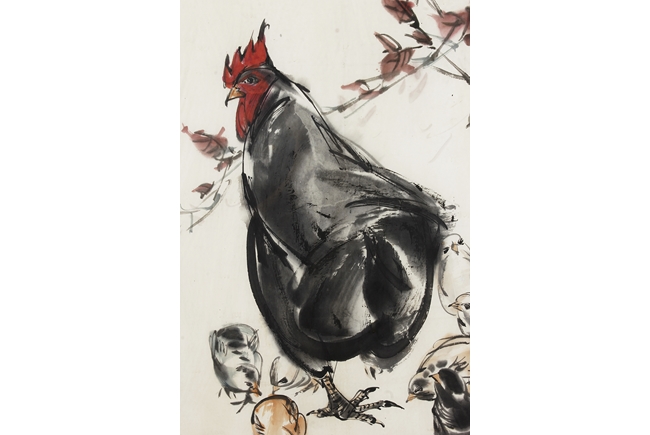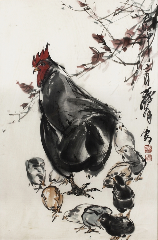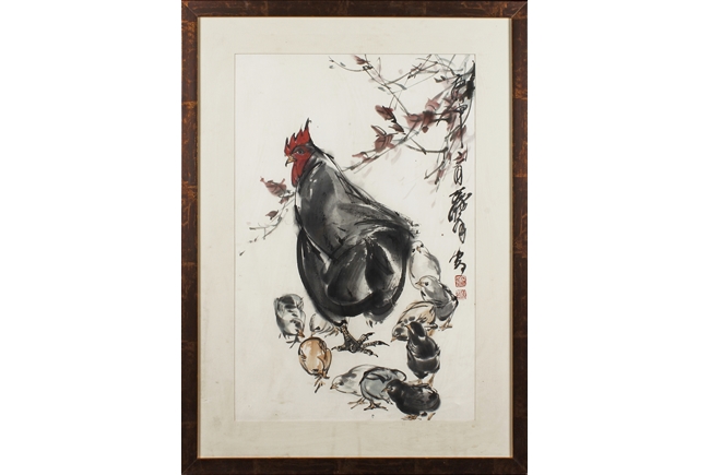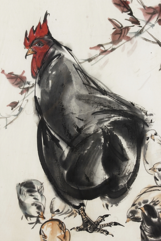 Color and ink on paper painting. Framed and mounted. The painting depicts a rooster and a group of chicks. Inscription and two seal marks on the right side.