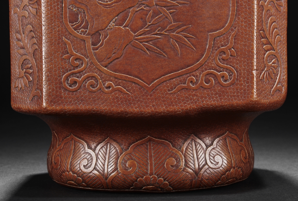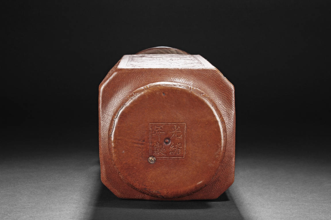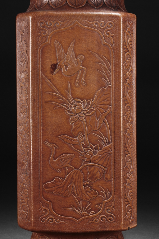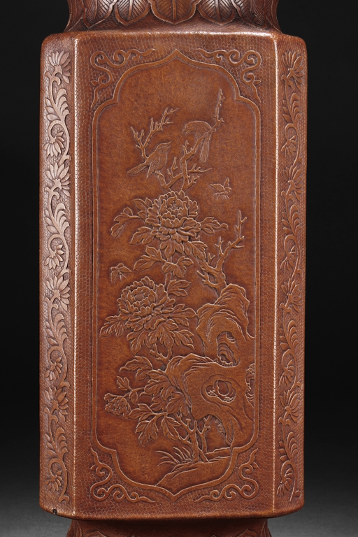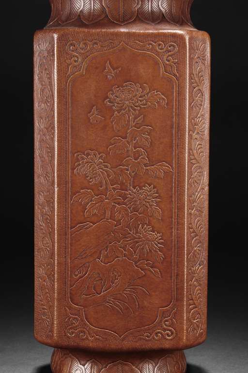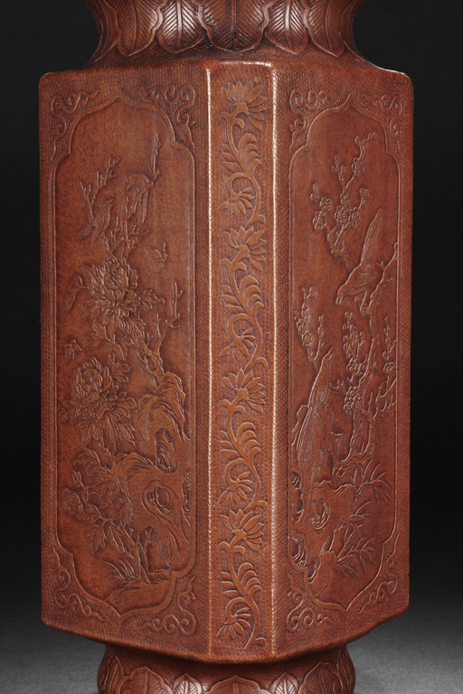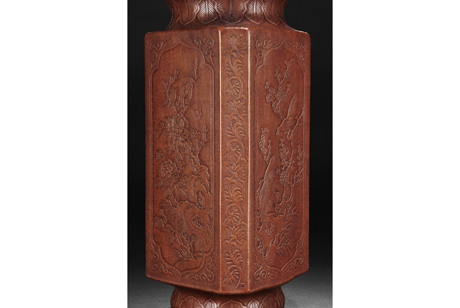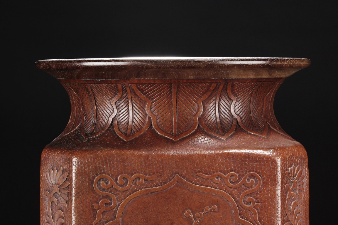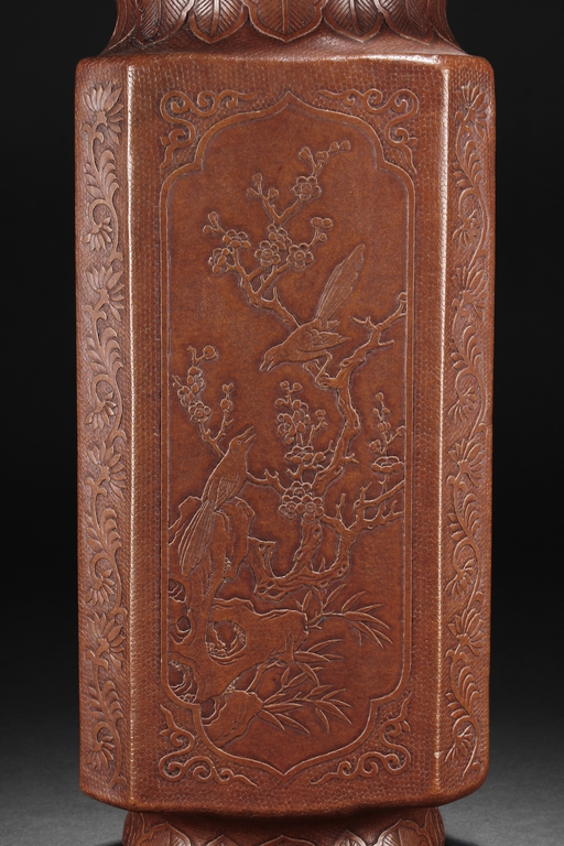 The gourd vase is of rectangular form, with rounded foot ring, rim, and neck, the body carved with four sections of flowers and birds, decorated with vine and banana leaf patterns, the bottom bears four character "GUANGXU NIANZHI" mark. Qing Dynasty period.