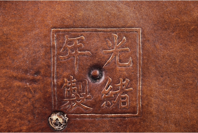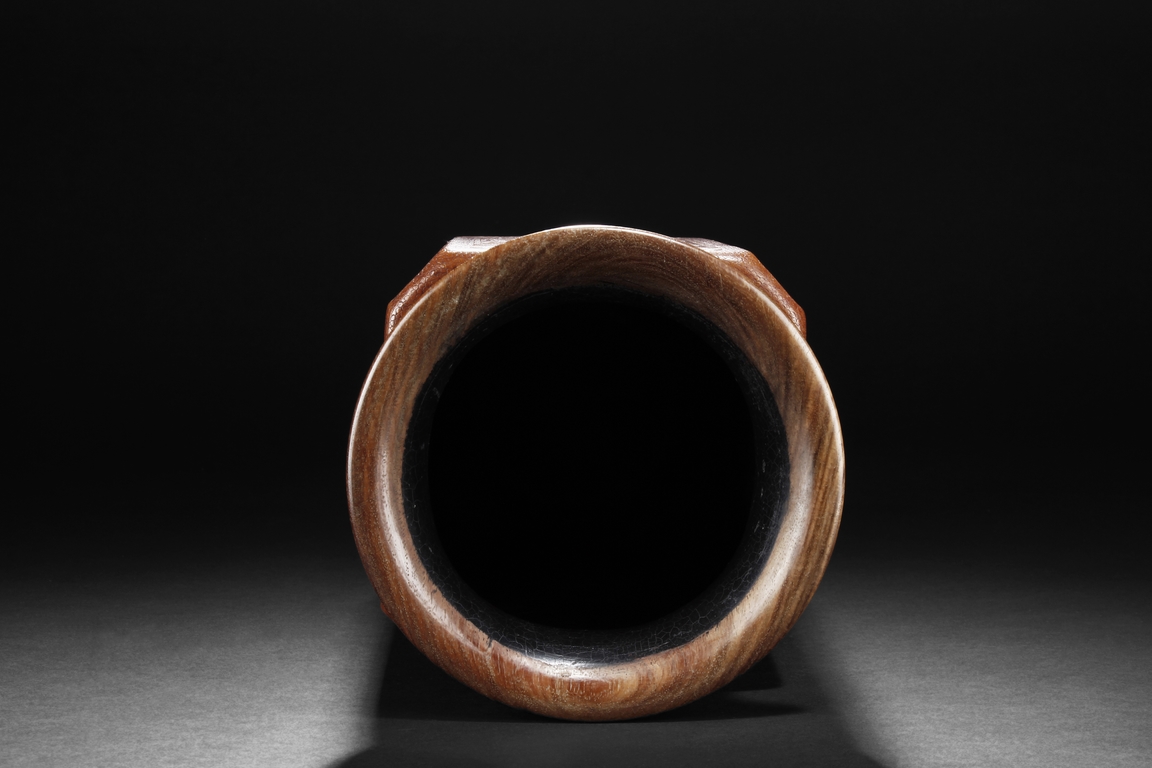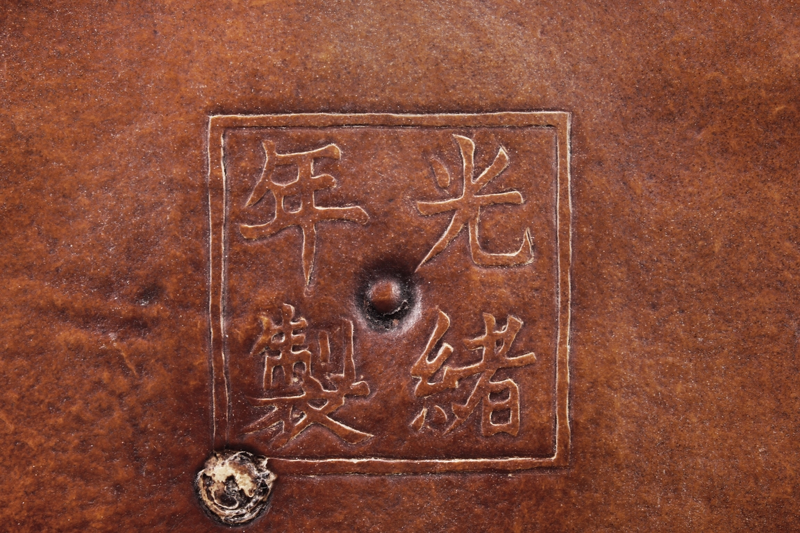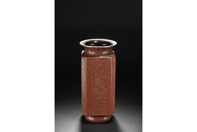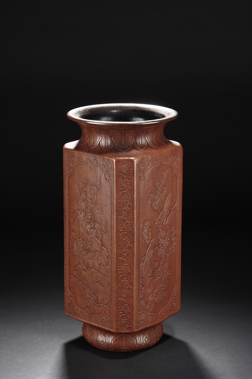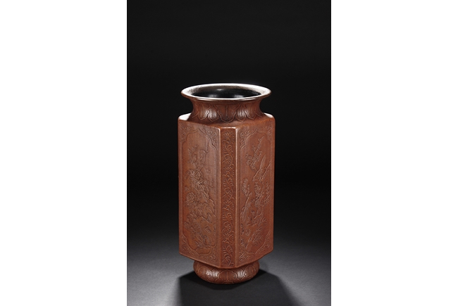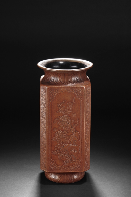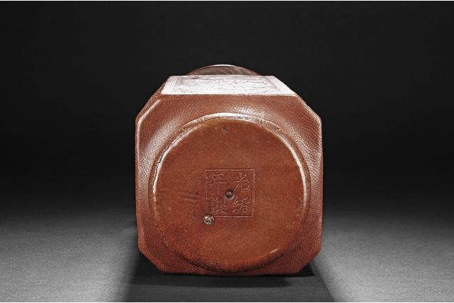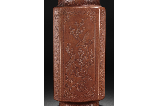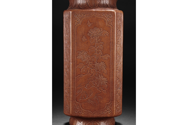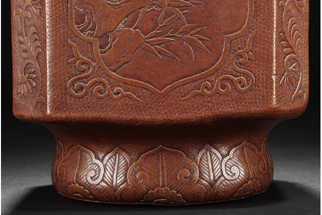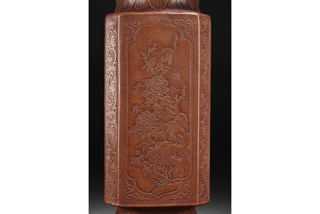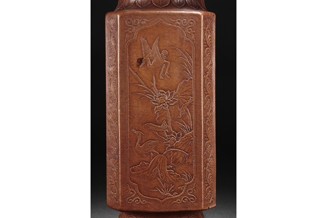 The gourd vase is of rectangular form, with rounded foot ring, rim, and neck, the body carved with four sections of flowers and birds, decorated with vine and banana leaf patterns, the bottom bears four character "GUANGXU NIANZHI" mark. Qing Dynasty period.