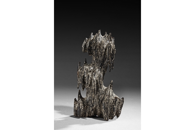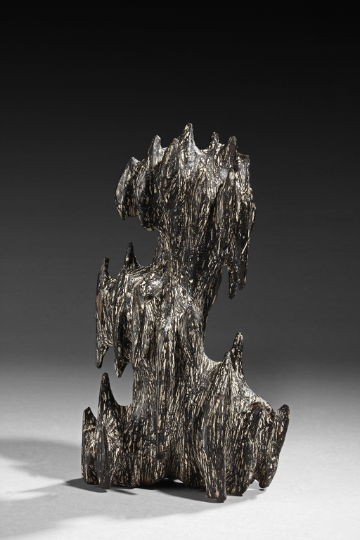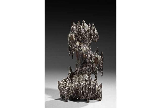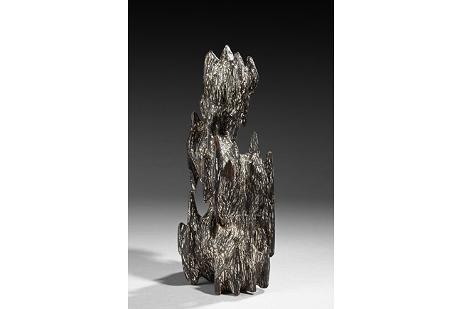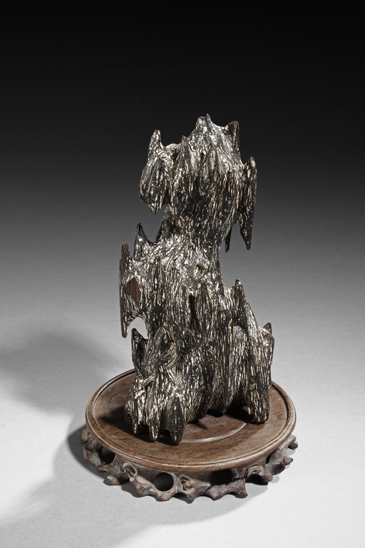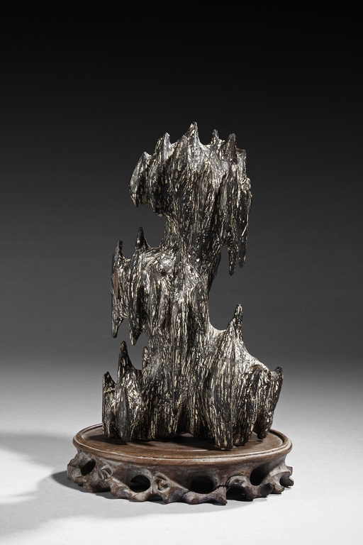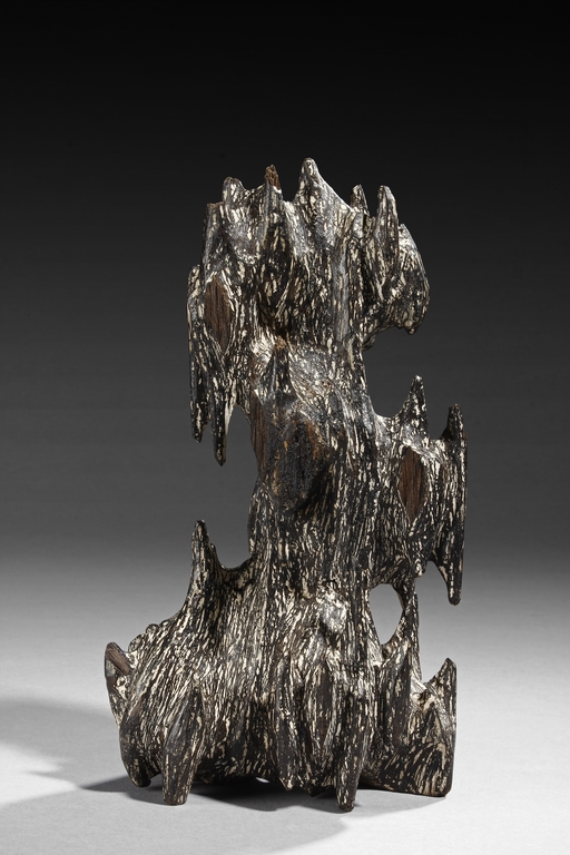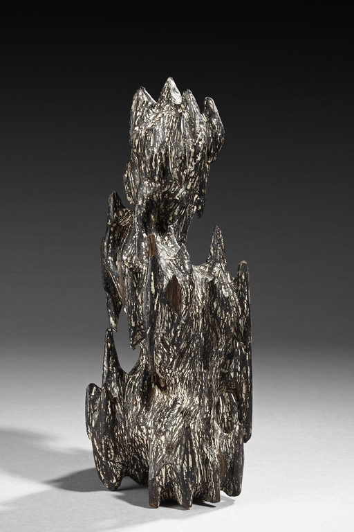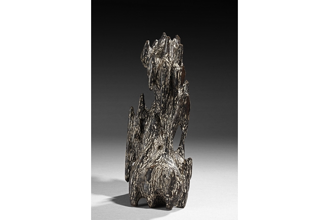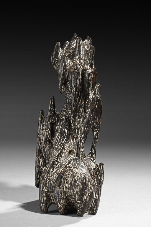 The figure was sculpted and painted in naturalistic fashion, with intricate designs overall on the agarwood, includes stand. Some chipping damage on the figure.