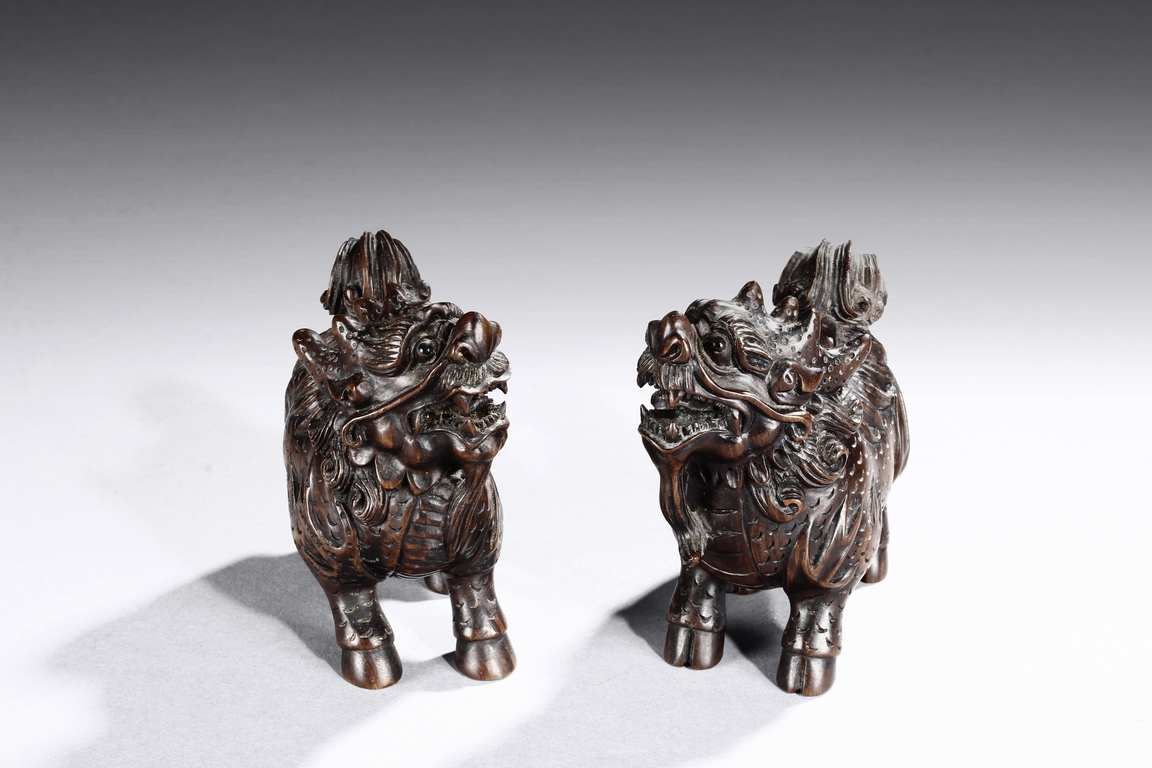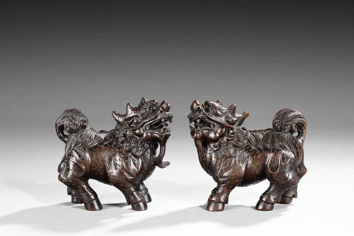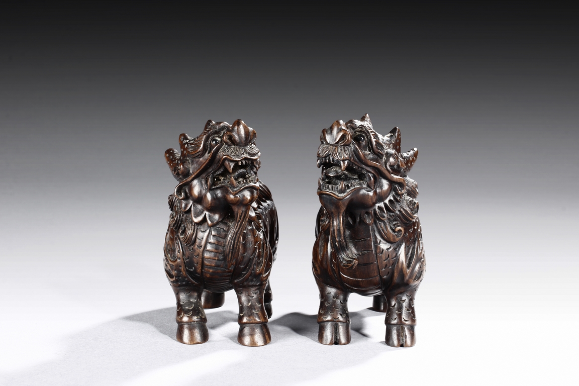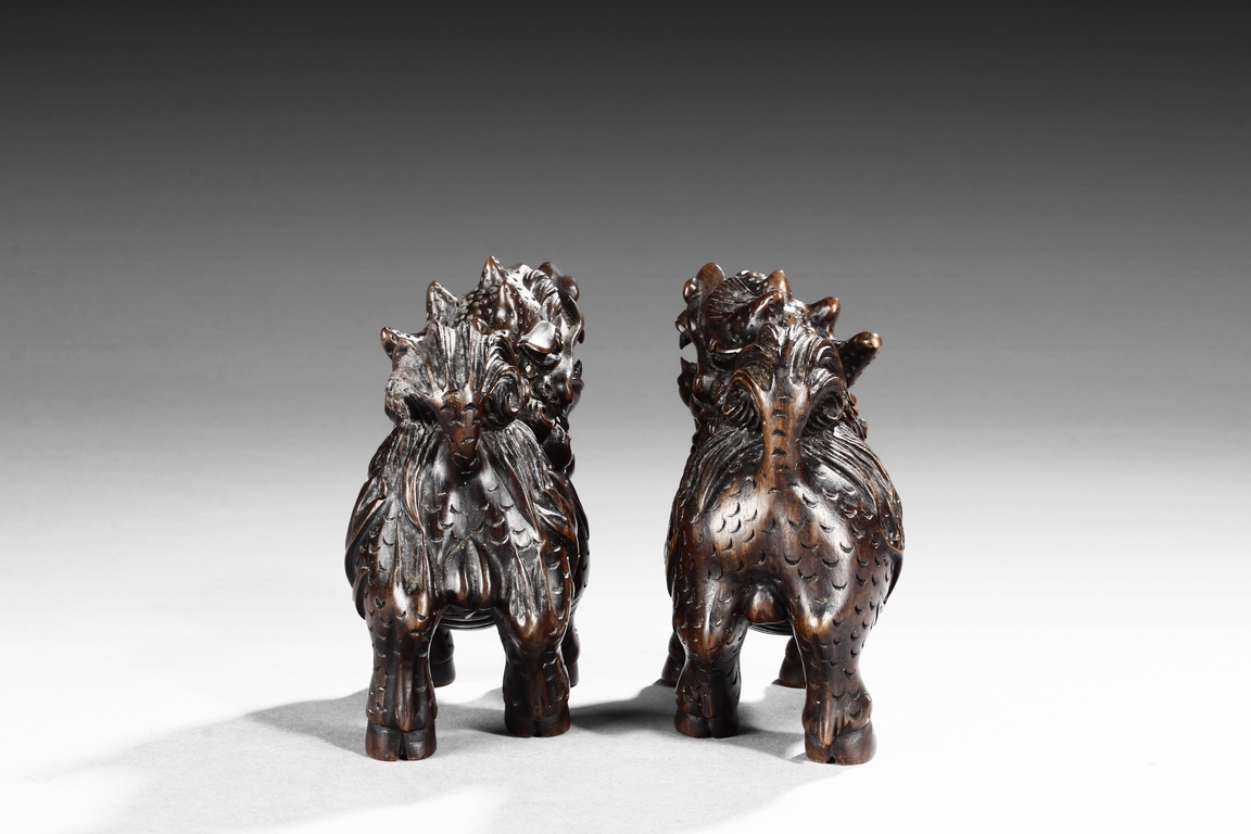 Each mythical beast shown standing foursquare, its head turned to the side with bulging eyes, broad nose, mouth wide open revealing the sharp teeth. Its mane and short curled tail highly detailed with incised lines, along with the scaled body. Qing dynasty period.
