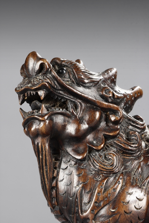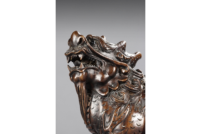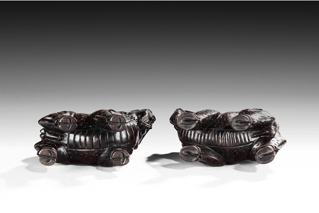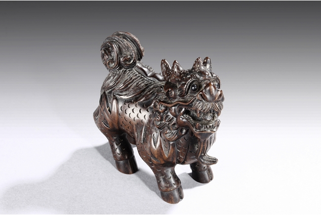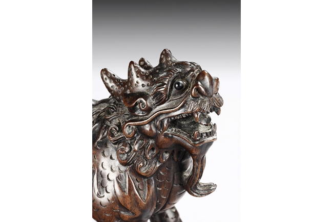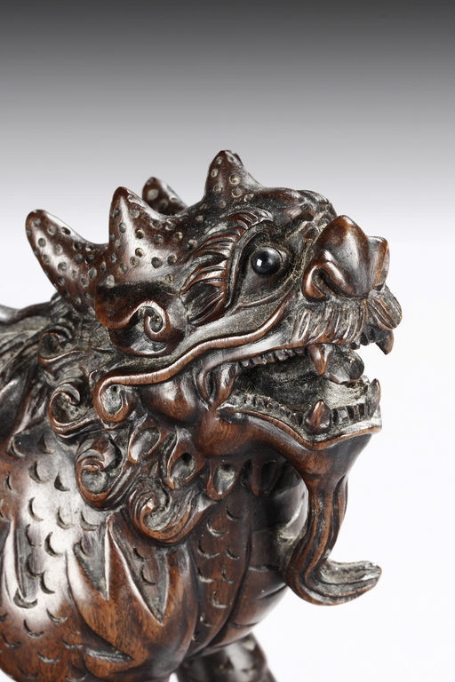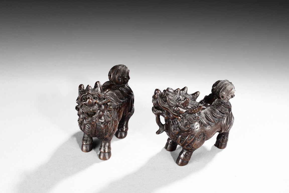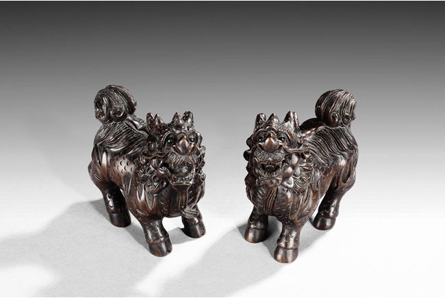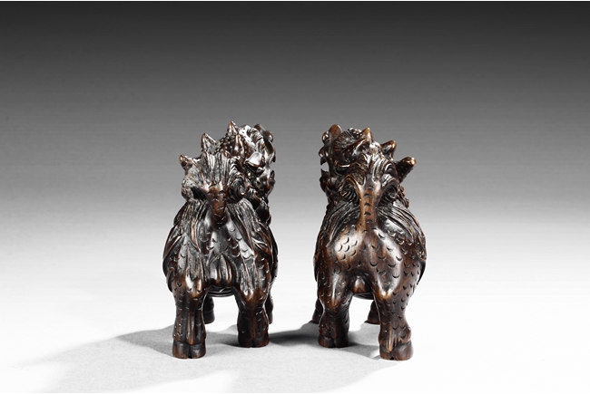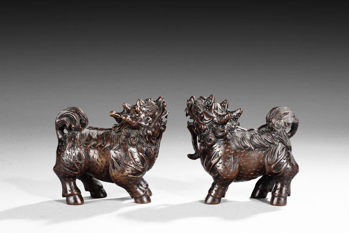 Each mythical beast shown standing foursquare, its head turned to the side with bulging eyes, broad nose, mouth wide open revealing the sharp teeth. Its mane and short curled tail highly detailed with incised lines, along with the scaled body. Qing dynasty period.