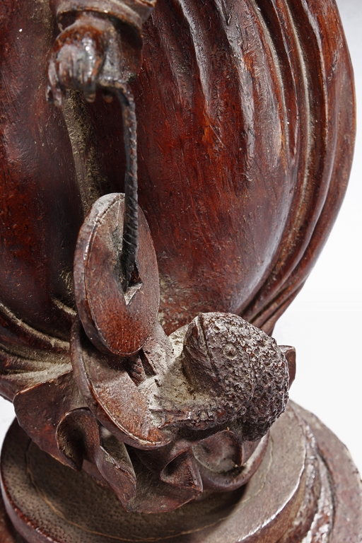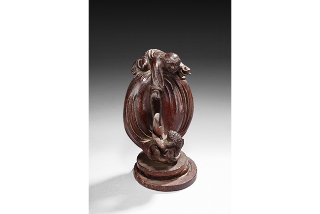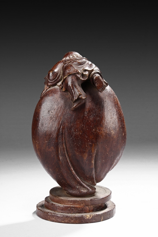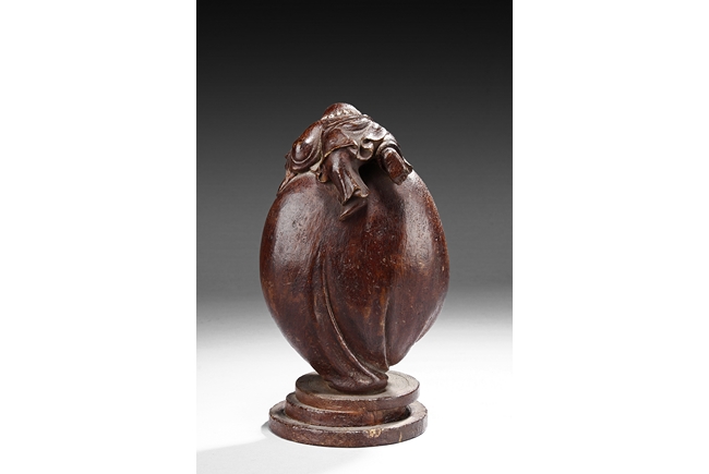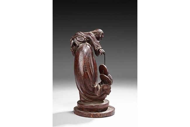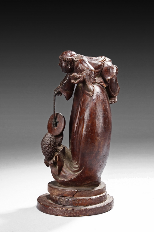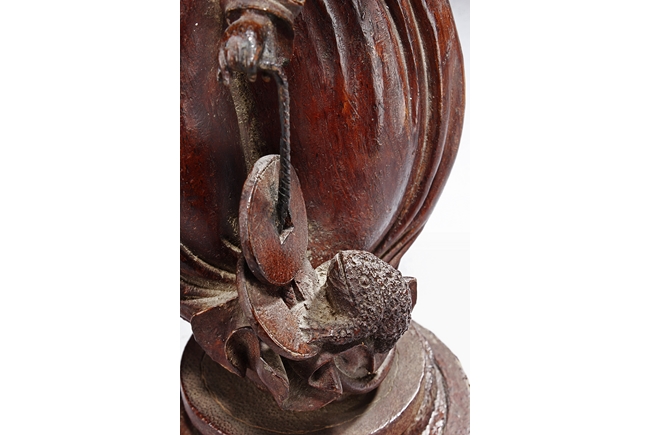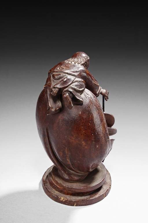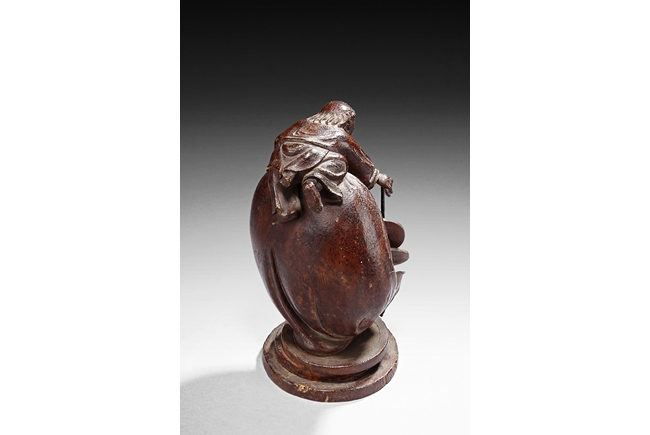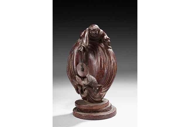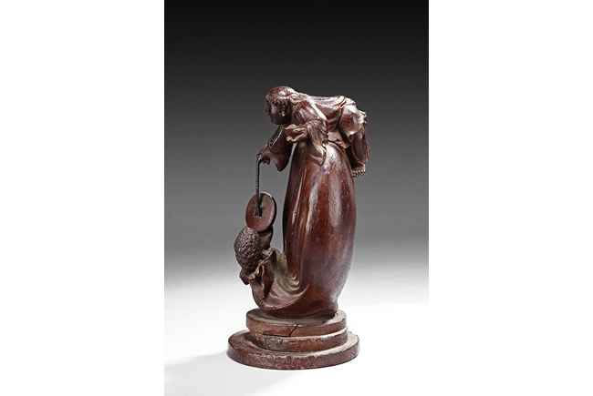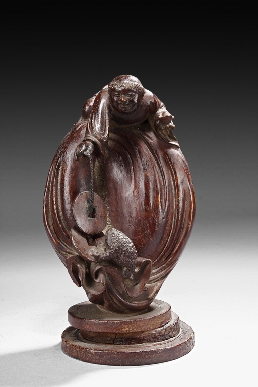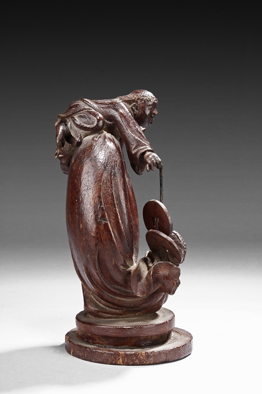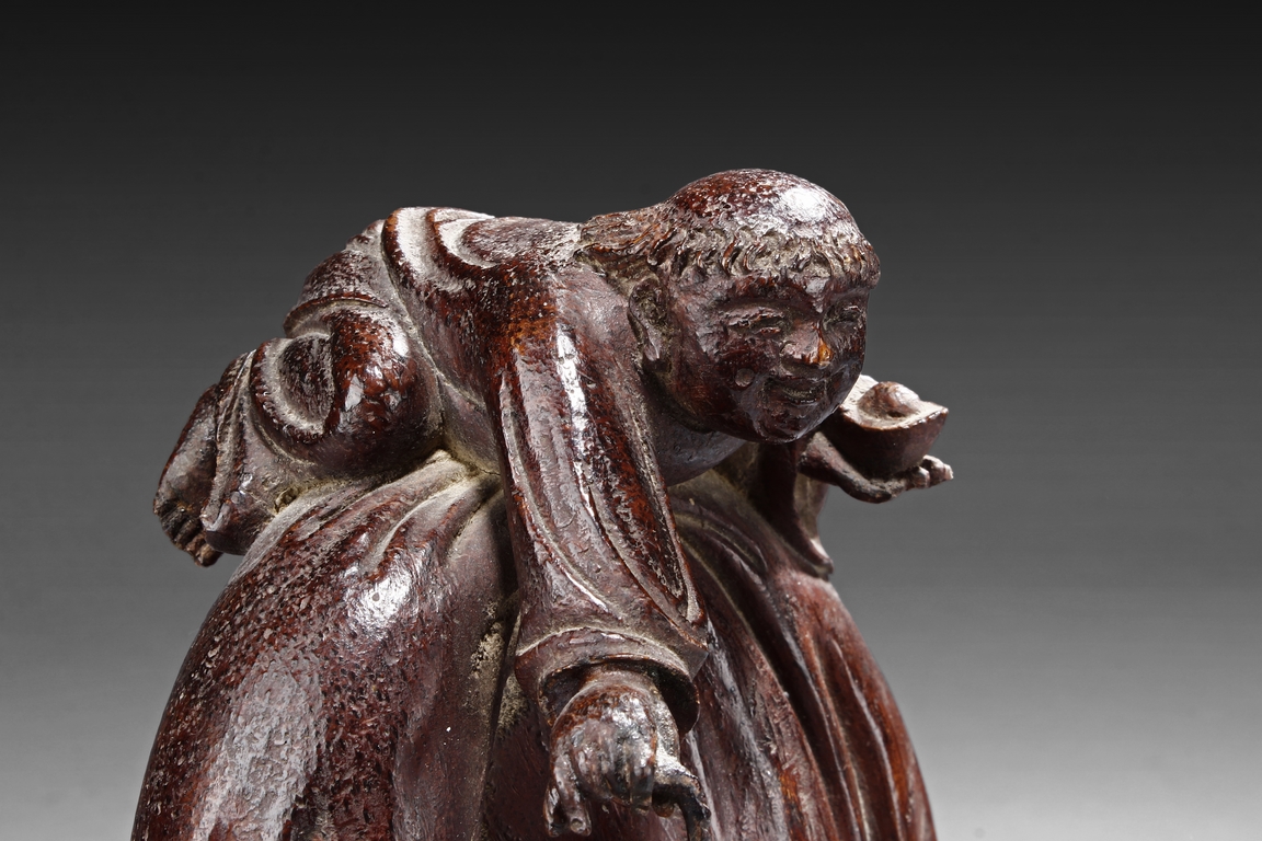 The bamboo figural group depicts the story of Liu Hai baiting the greedy golden toad with coins and gold, with Liu Hai situated on top of a stone, dangling a coin below towards the toad. The wood with natural brown color and grain. Qing Dynasty period.