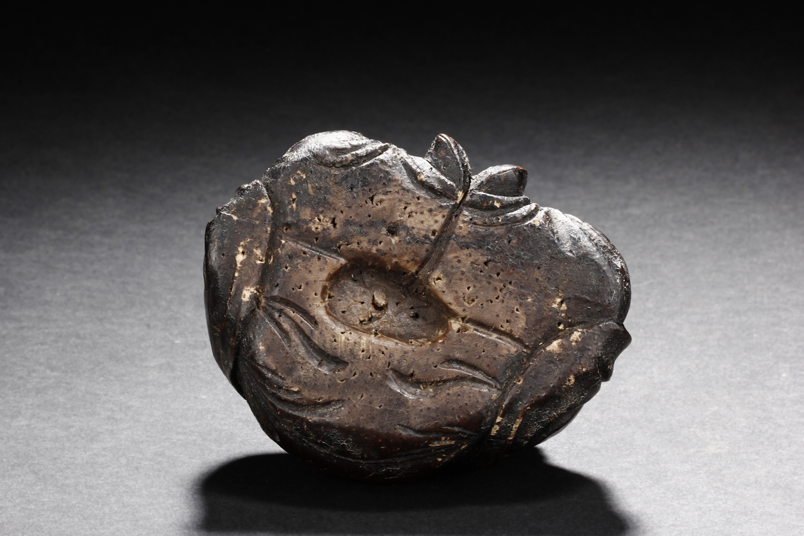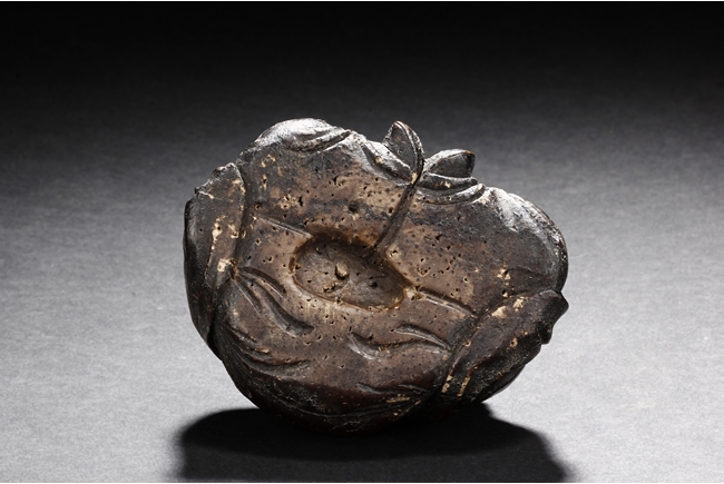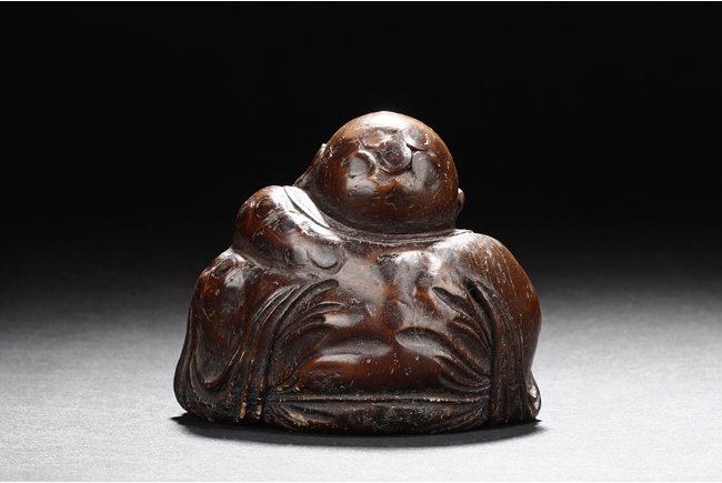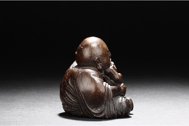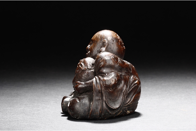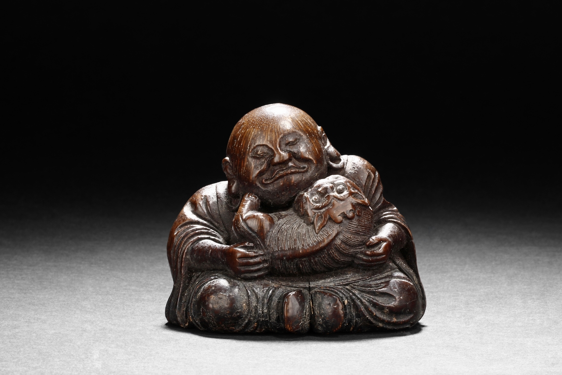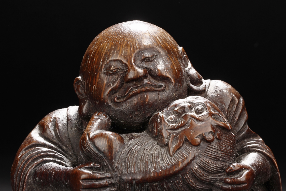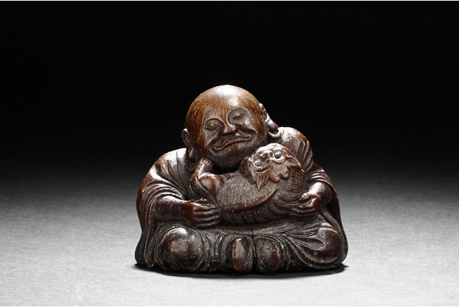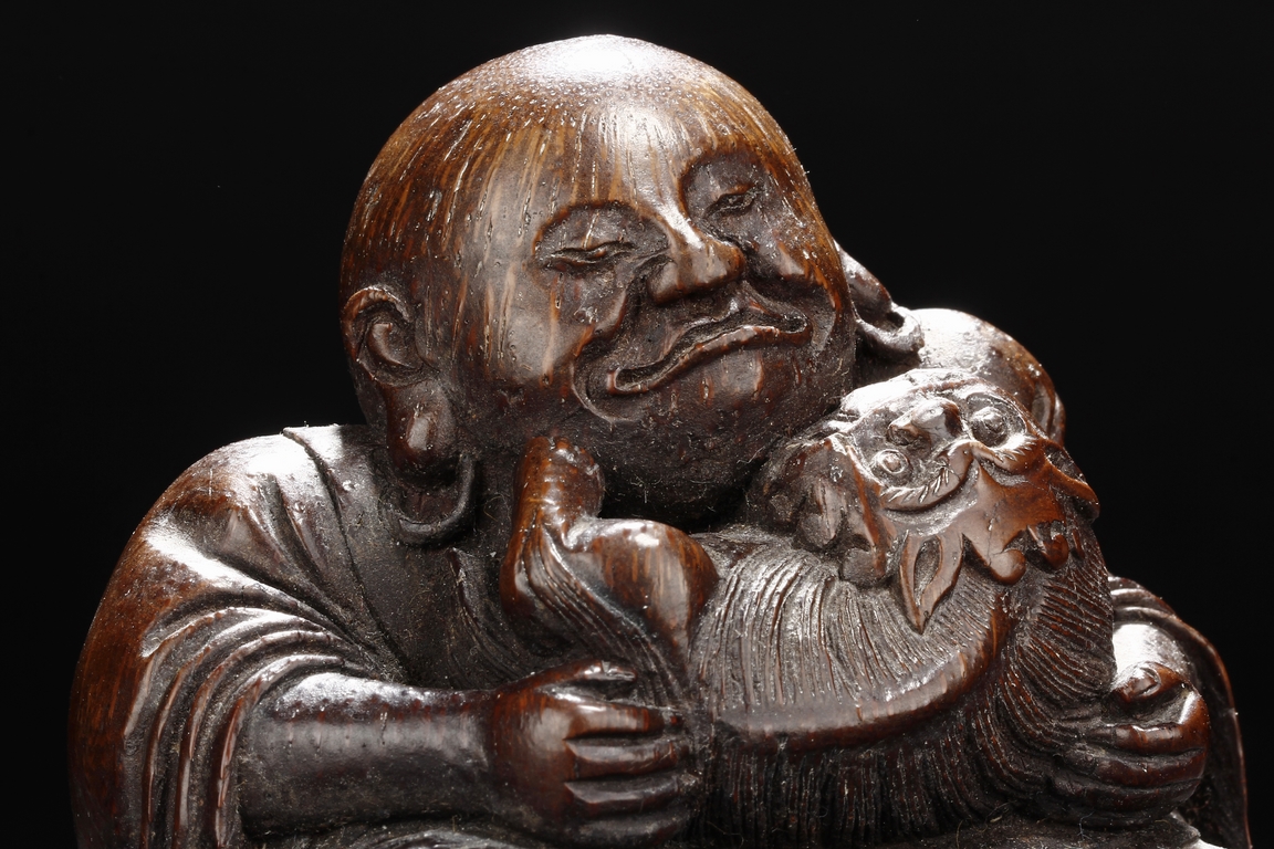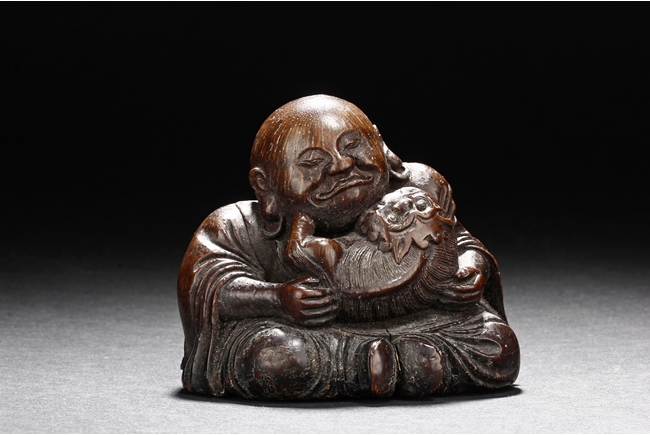 The bamboo carving depicts a Luohan seated with both feet bending inwards, both hands holding a lion cub, with serene expression, the cub looking upwards playfully, with one foot on the Luohan's chin. The carving retains the texture and grain of bamboo. Qing Dynasty period.