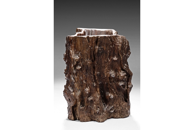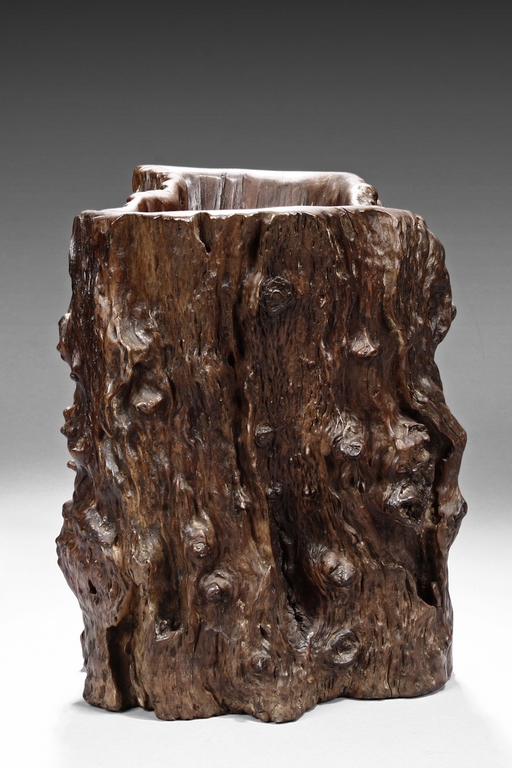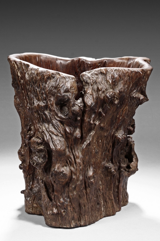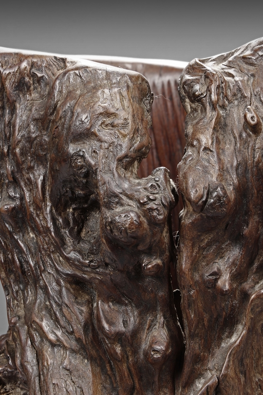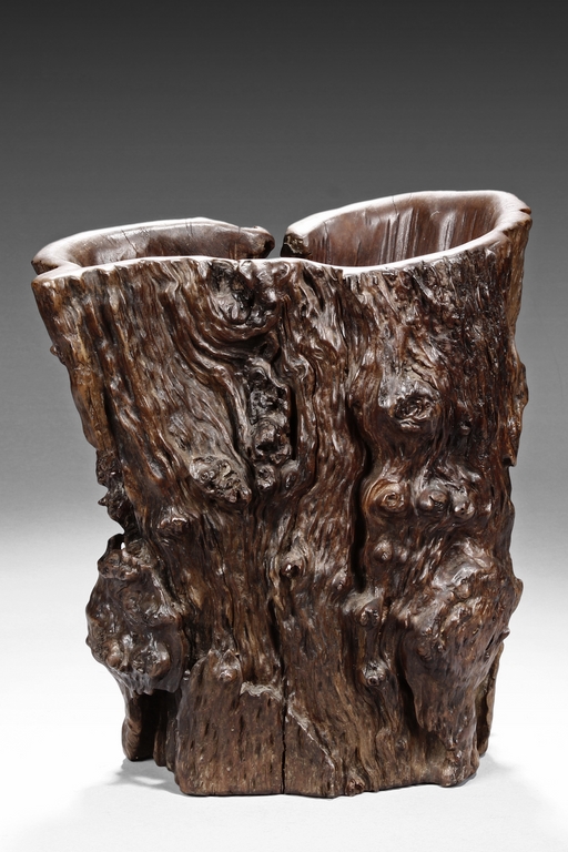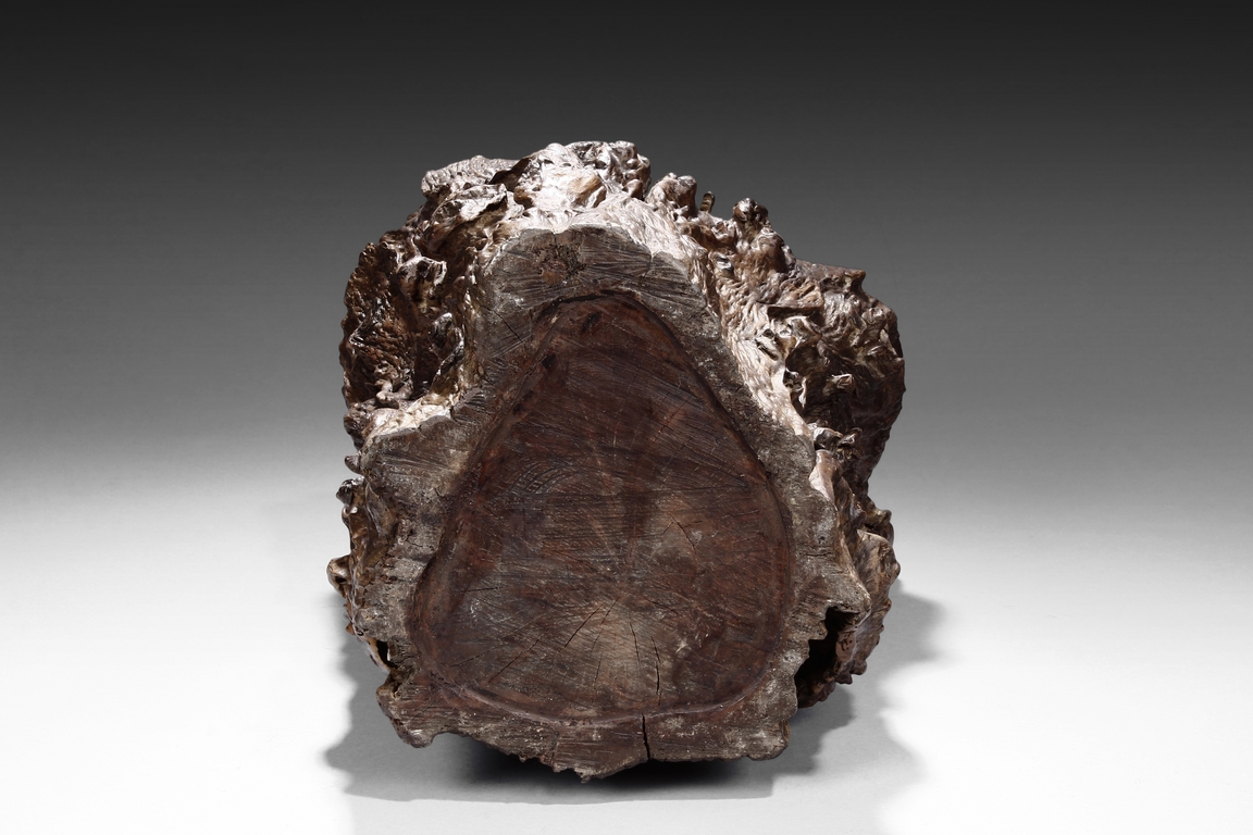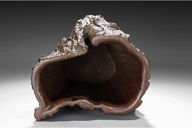 Of naturally irregular form as carved out of trunk, the carving is naturally formed reserving numerous knots and crevices around the exterior, the interior carved hollow, the wood is of yellowish brown tone.
