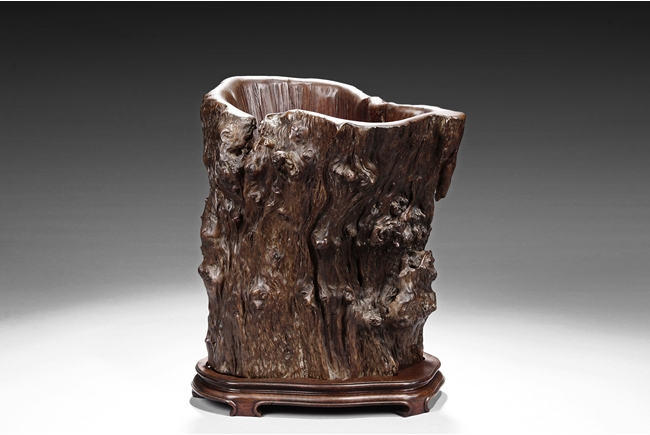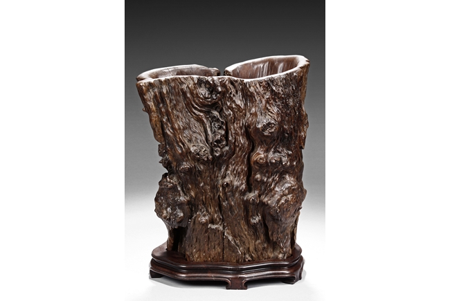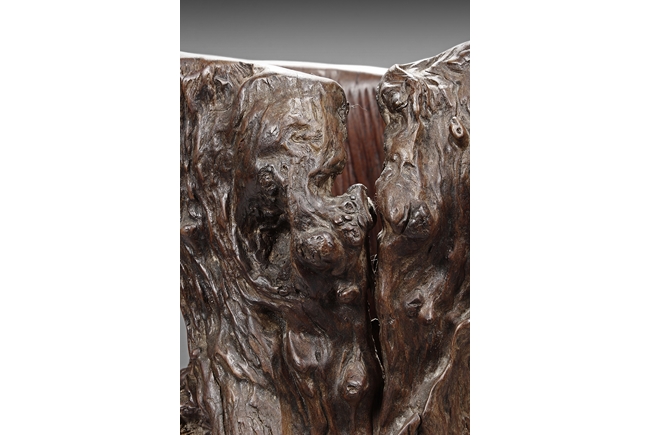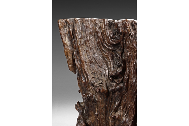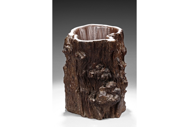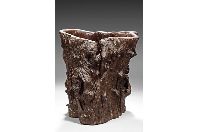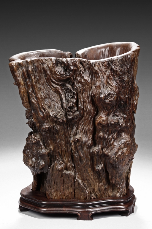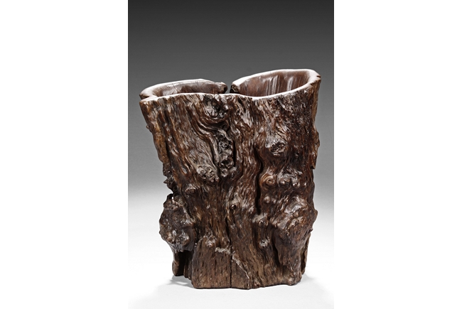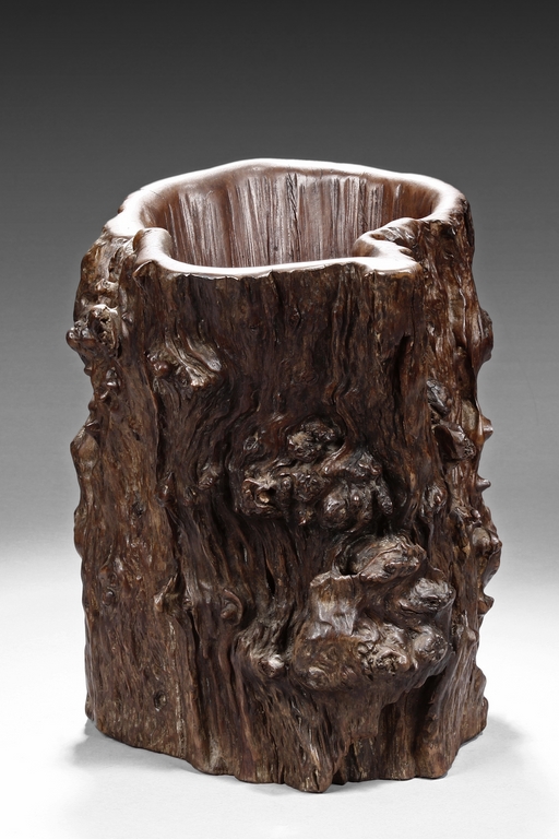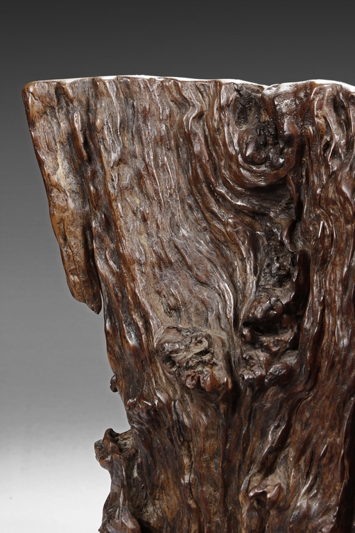 Of naturally irregular form as carved out of trunk, the carving is naturally formed reserving numerous knots and crevices around the exterior, the interior carved hollow, the wood is of yellowish brown tone.