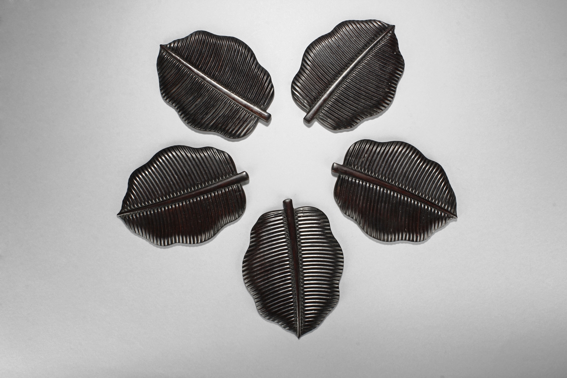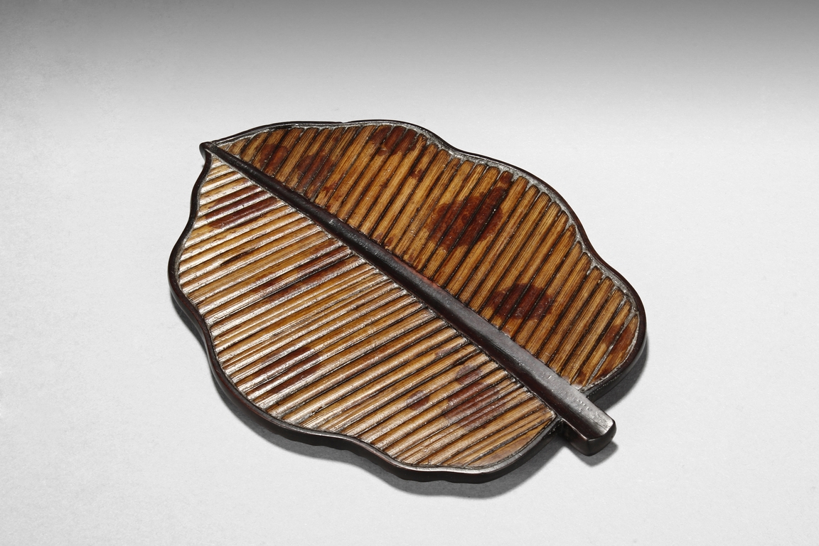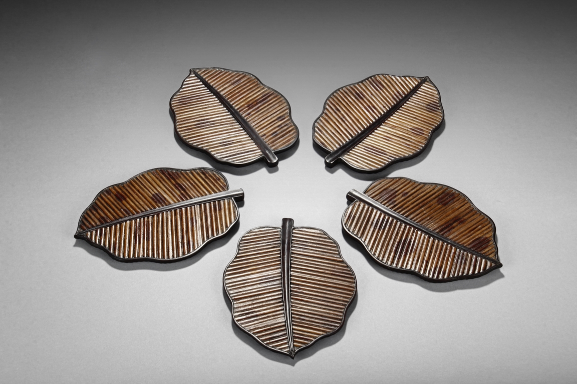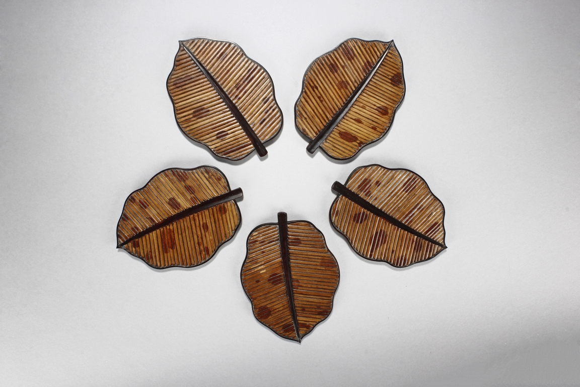 The set includes five leaf shaped saucers, the frames and bottom made from zitan wood, the interior made from mottled bamboo, in a design that retains the natural colors and spots. Republic period.