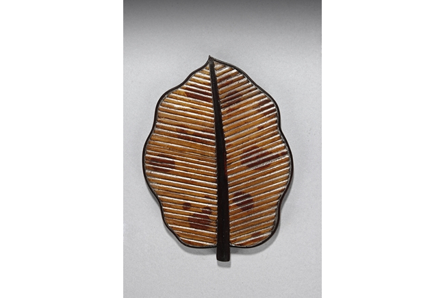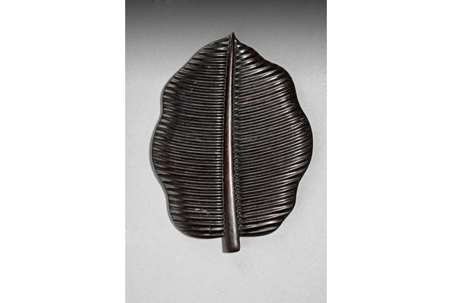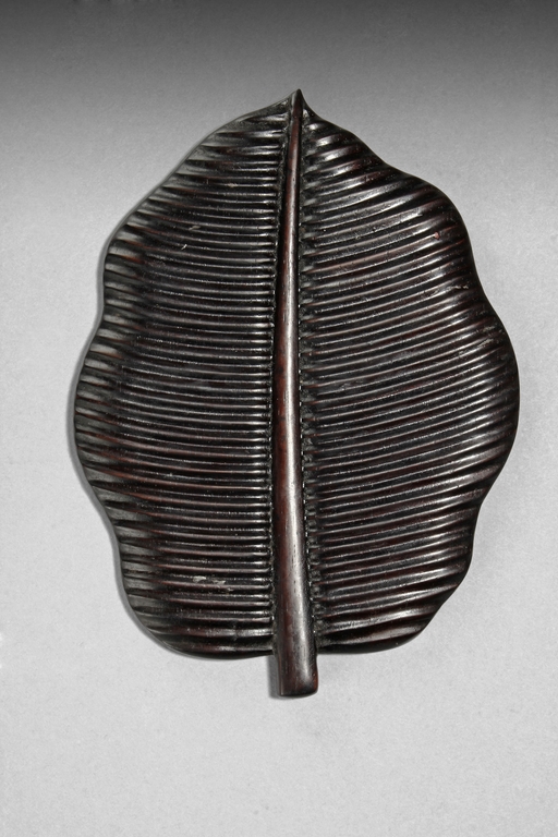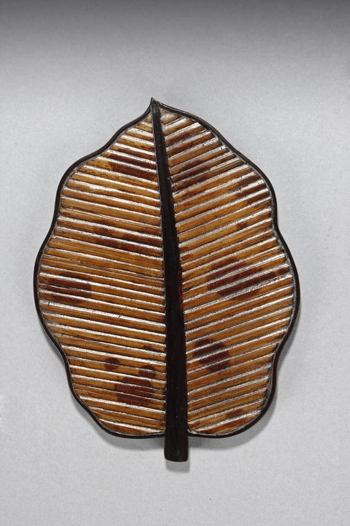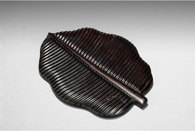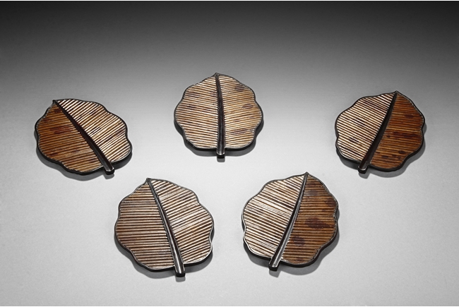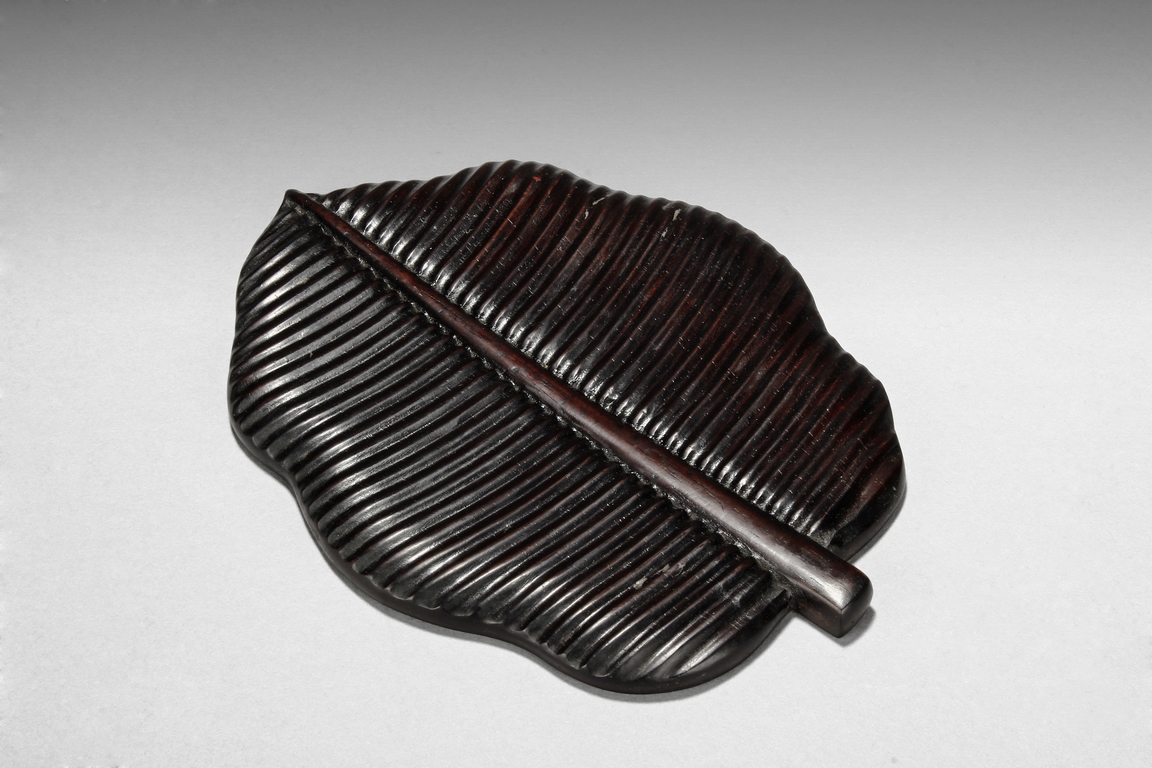 The set includes five leaf shaped saucers, the frames and bottom made from zitan wood, the interior made from mottled bamboo, in a design that retains the natural colors and spots. Republic period.