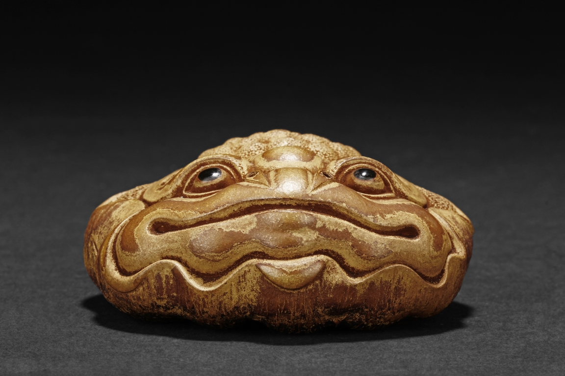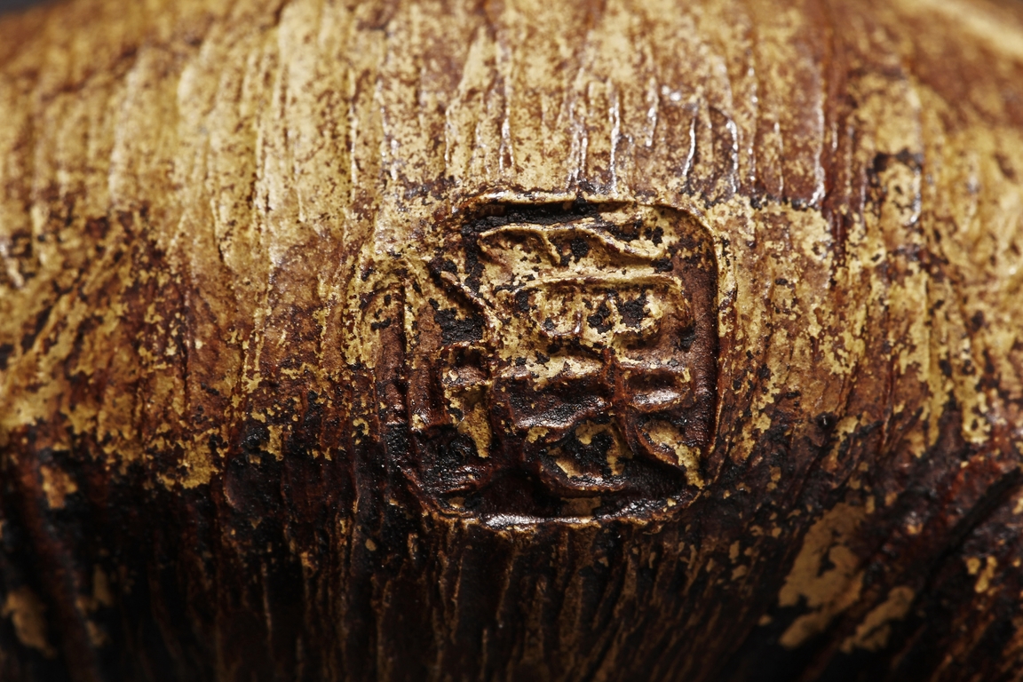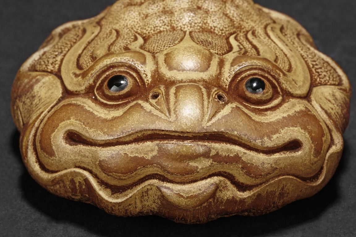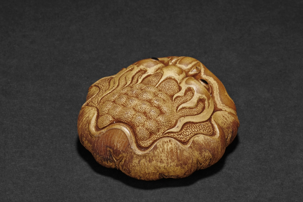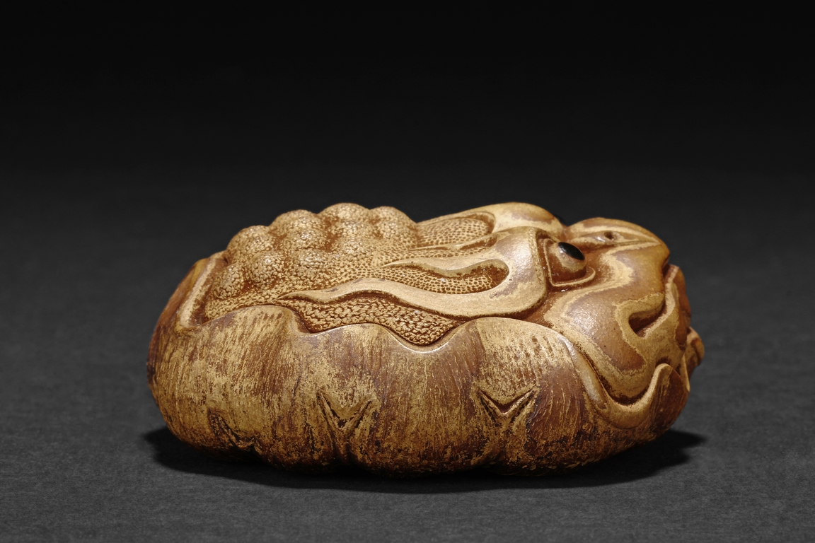 Detail carved from bamboo root, the figure depicts a mythical beast with bulging eyes, bumped back, and serene expression, the bottom with naturalistic bamboo root, an artist stamp on the side.