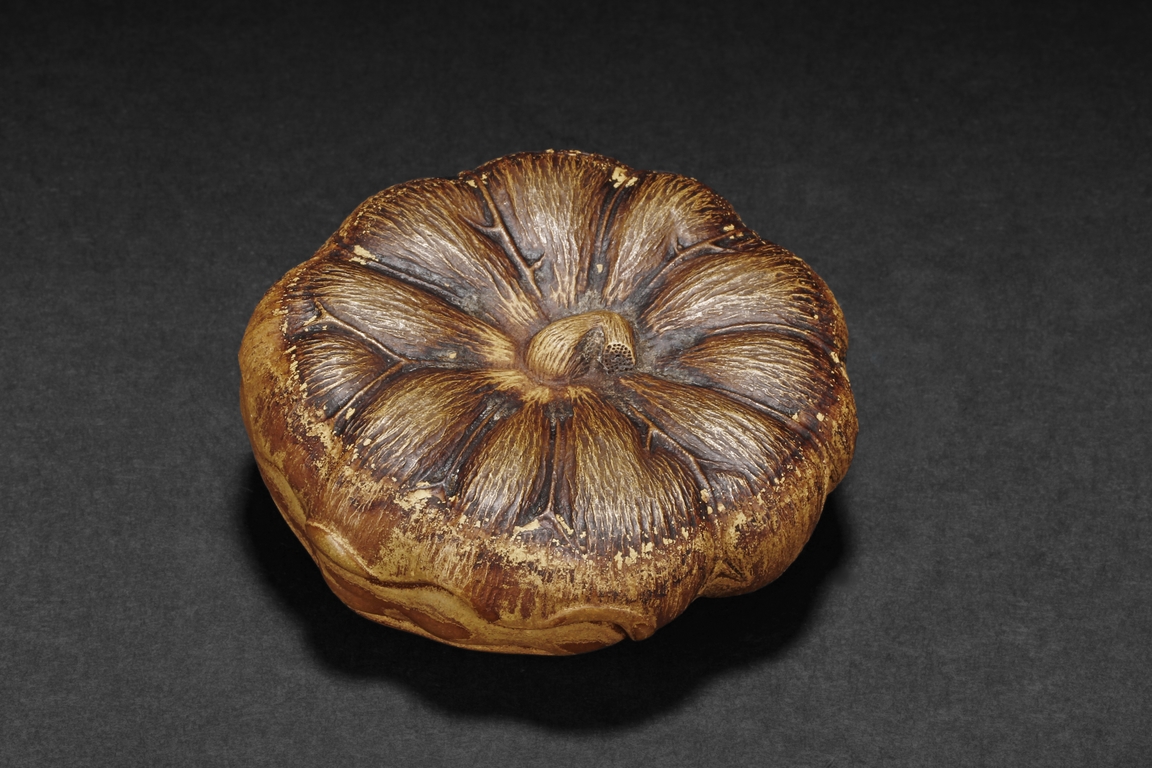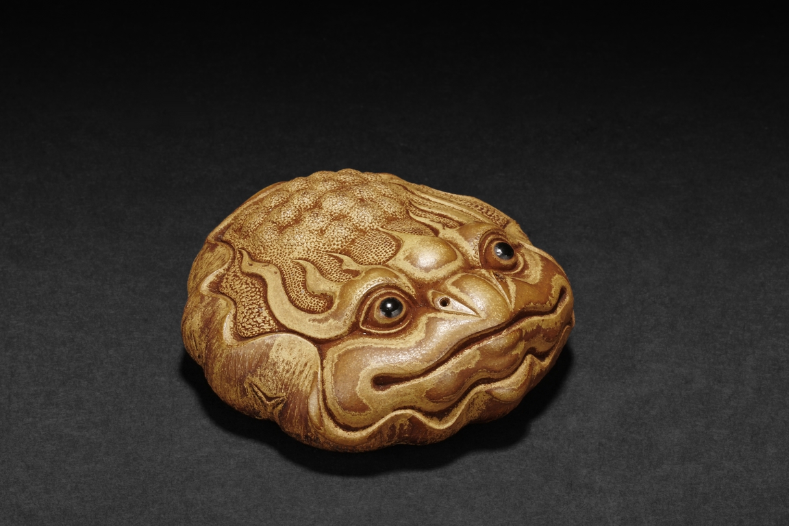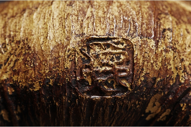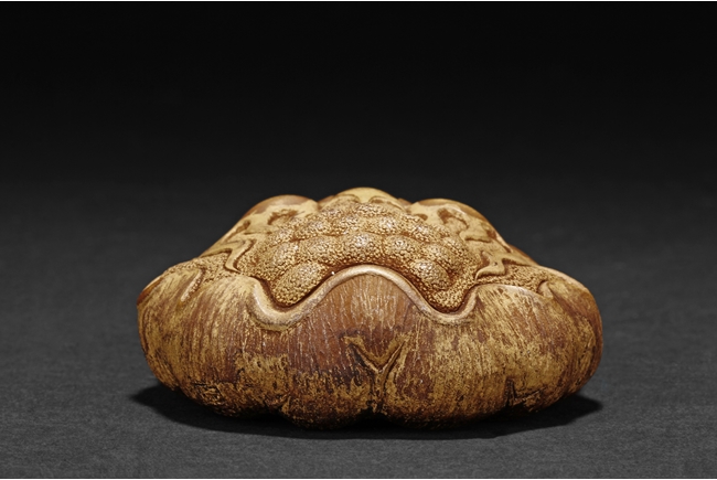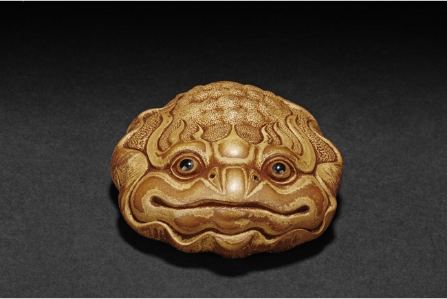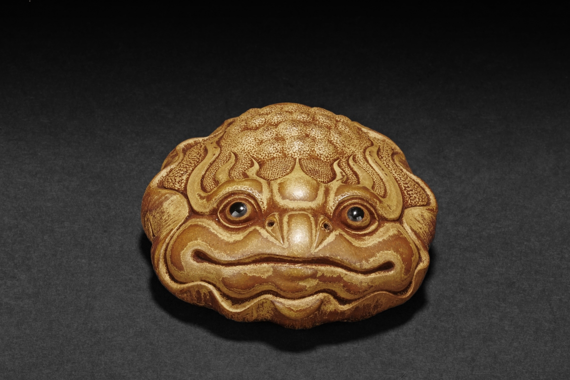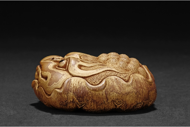 Detail carved from bamboo root, the figure depicts a mythical beast with bulging eyes, bumped back, and serene expression, the bottom with naturalistic bamboo root, an artist stamp on the side.