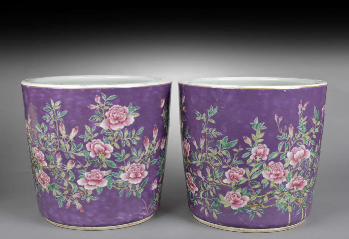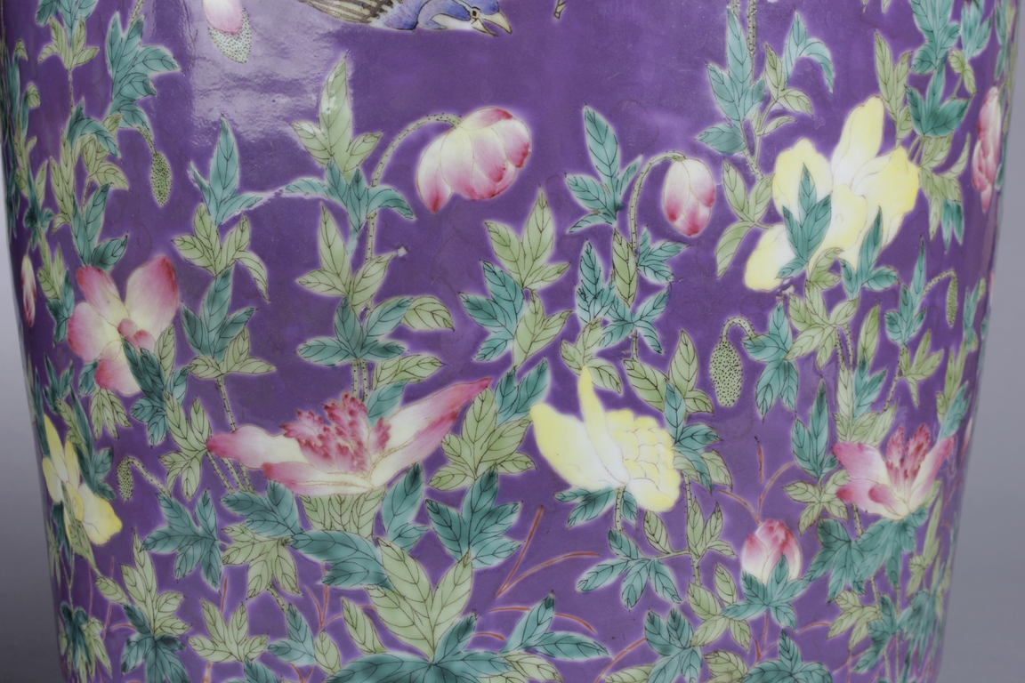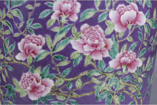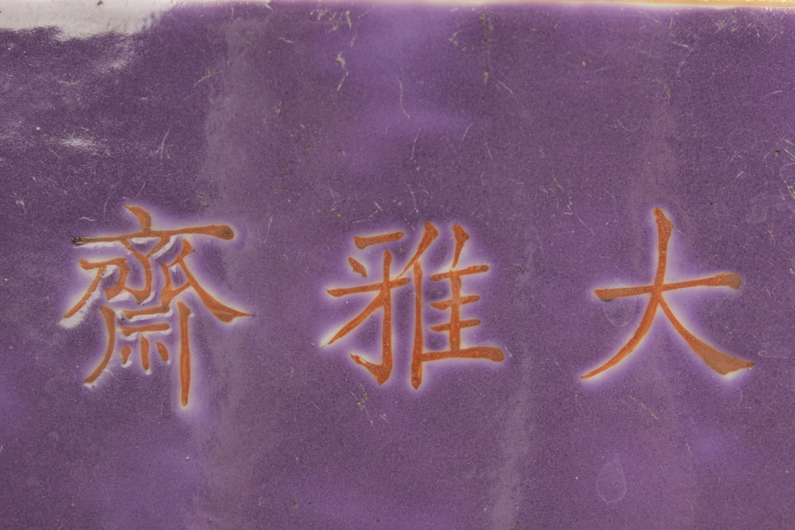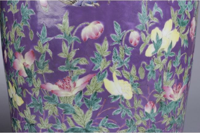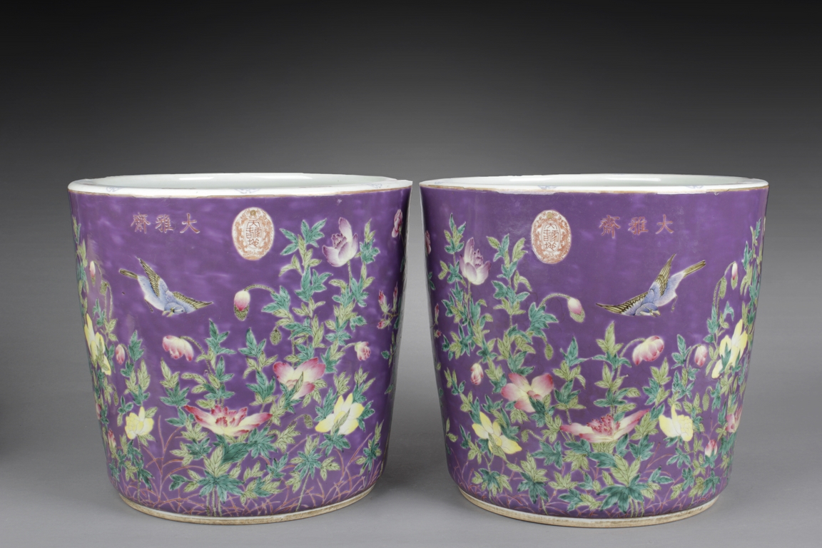 Of tapering cylindrical form, the planters exterior painted with magpie birds flying over blooming peony flowers, all over purple glaze ground, three character "Da Ya Zhai" and four character seal mark on the side, the lipped rim with alternating bat and Shou pattern, and the bottom unglazed. Late Qing Dynasty period.