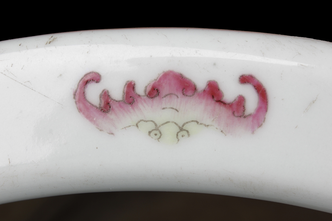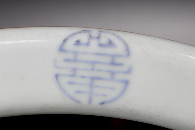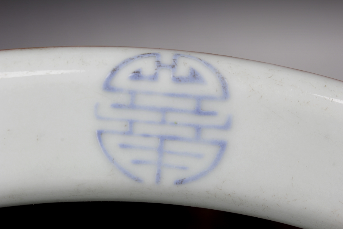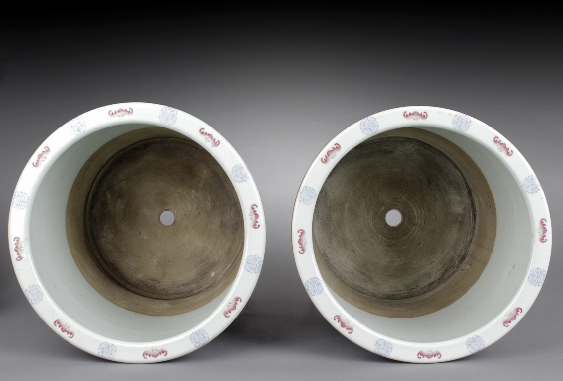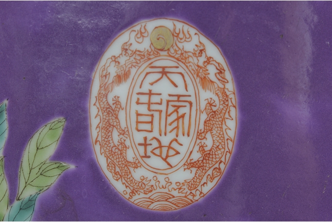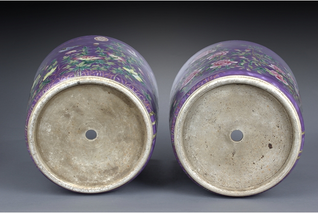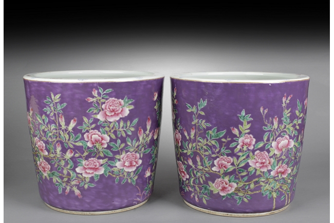 Of tapering cylindrical form, the planters exterior painted with magpie birds flying over blooming peony flowers, all over purple glaze ground, three character "Da Ya Zhai" and four character seal mark on the side, the lipped rim with alternating bat and Shou pattern, and the bottom unglazed. Late Qing Dynasty period.
