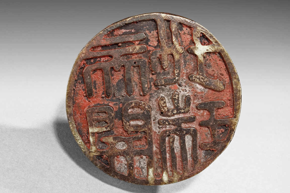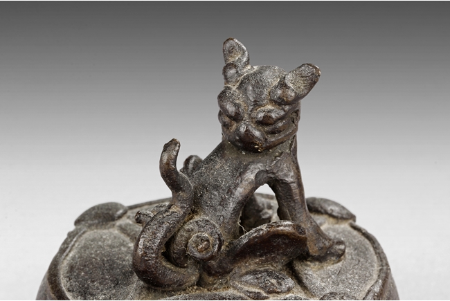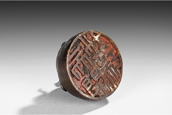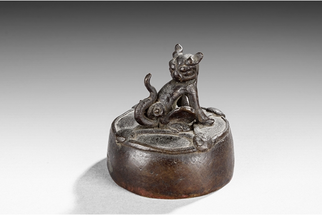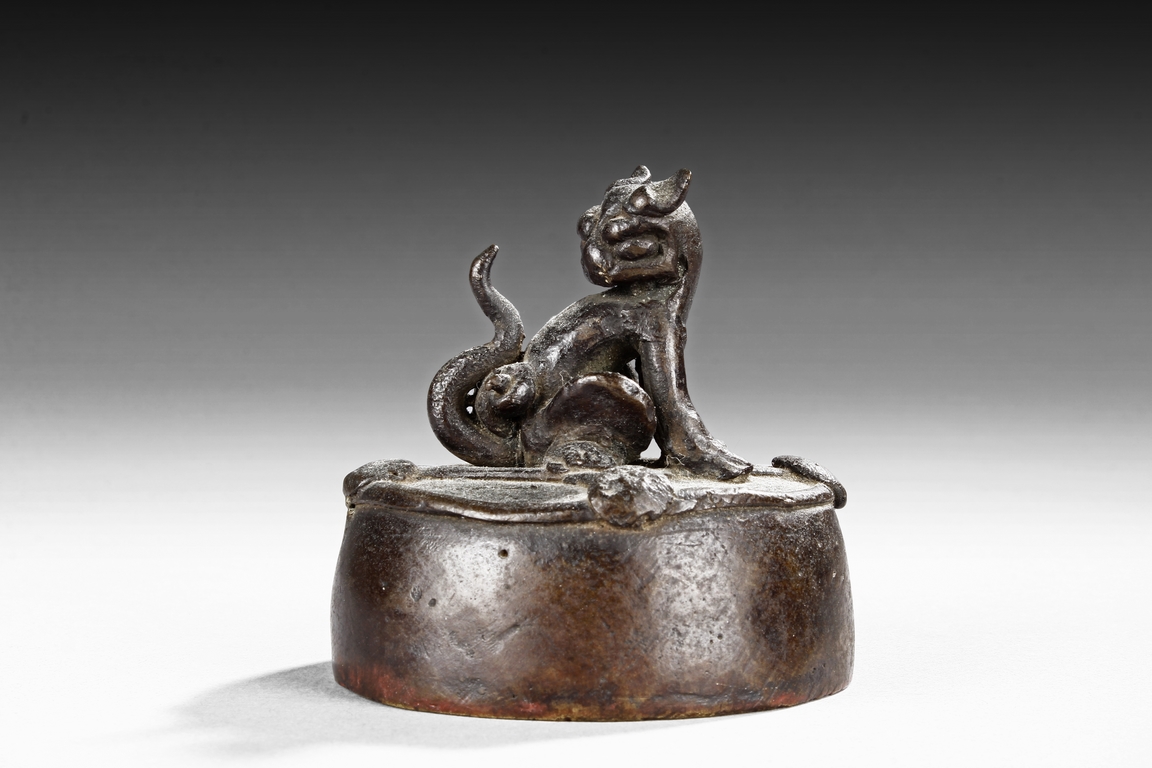 Of circular section, the bronze seal is mounted with a model of mythical beast with its head turning back, the tail curled upwards. The seal mark is cast at the bottom. Ming Dynasty period.