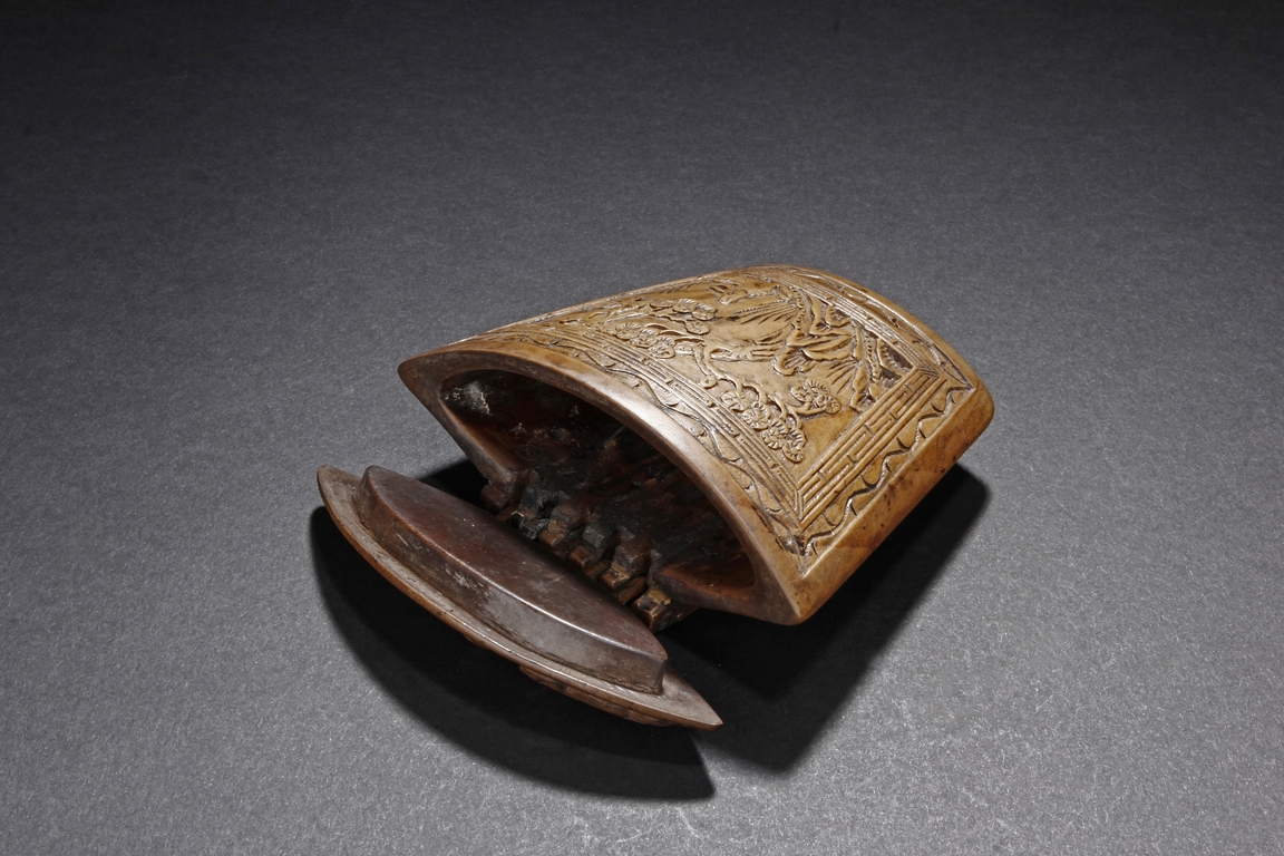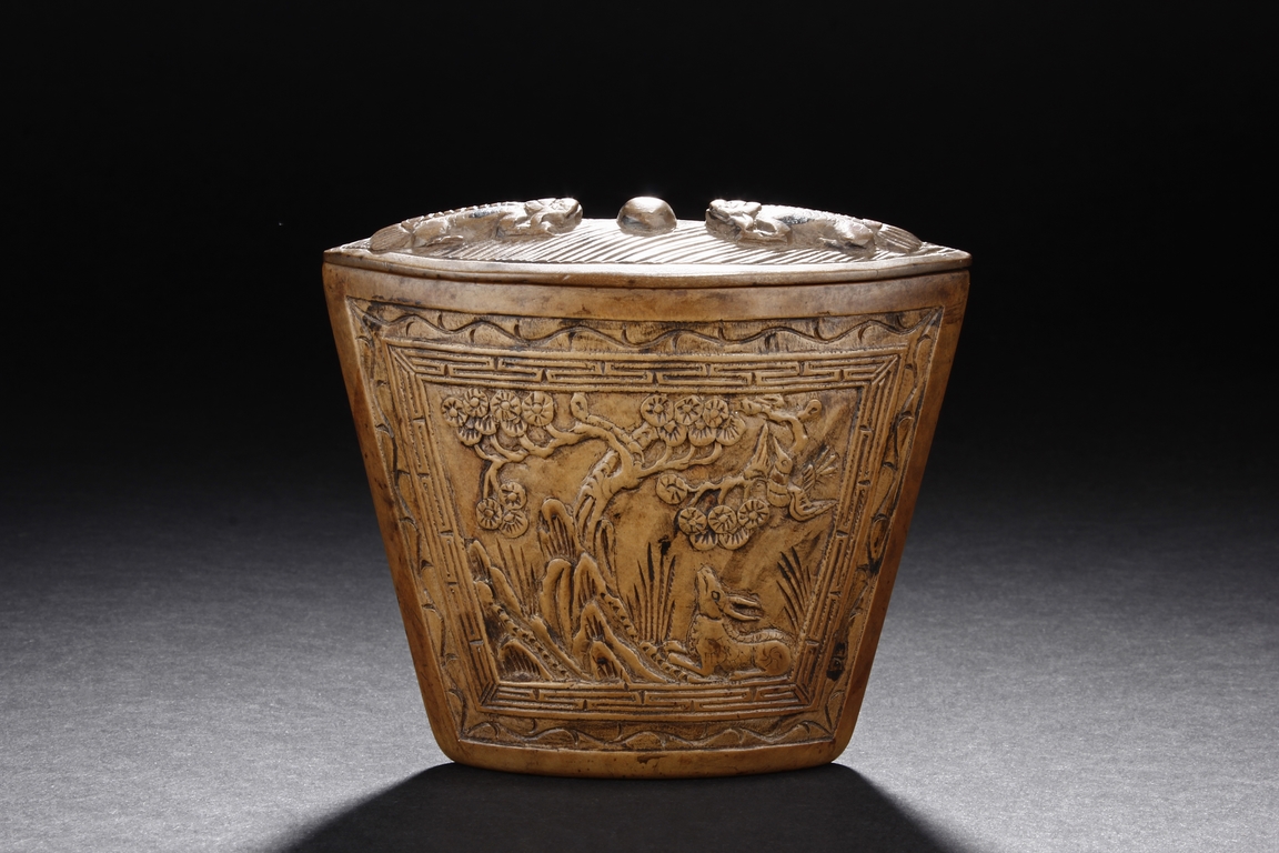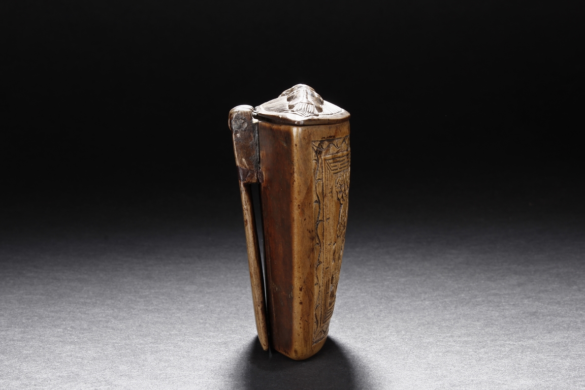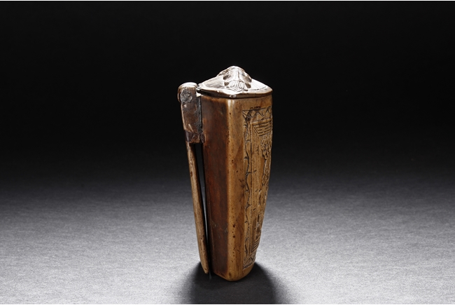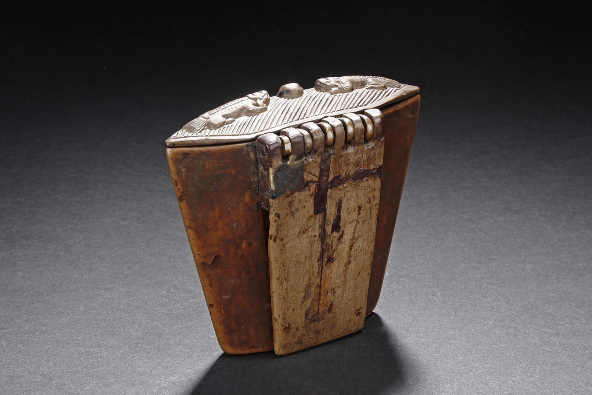 The container is of flattened trapezoid form, the front carved with a deer in a forest setting, looking upwards towards the pine trees, the top lid carved with two confronting mythical beasts with flaming pearl in the middle, the back with a wooden clip. The container was used for carrying tobacco.