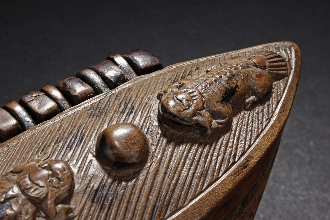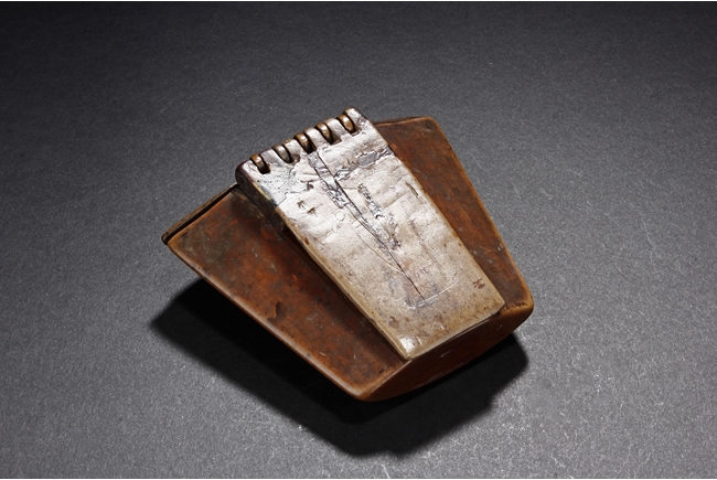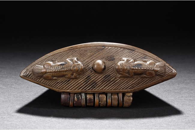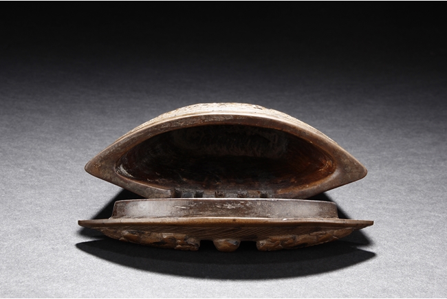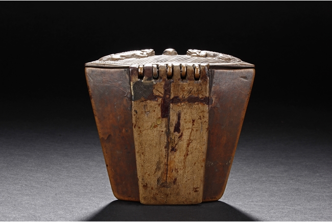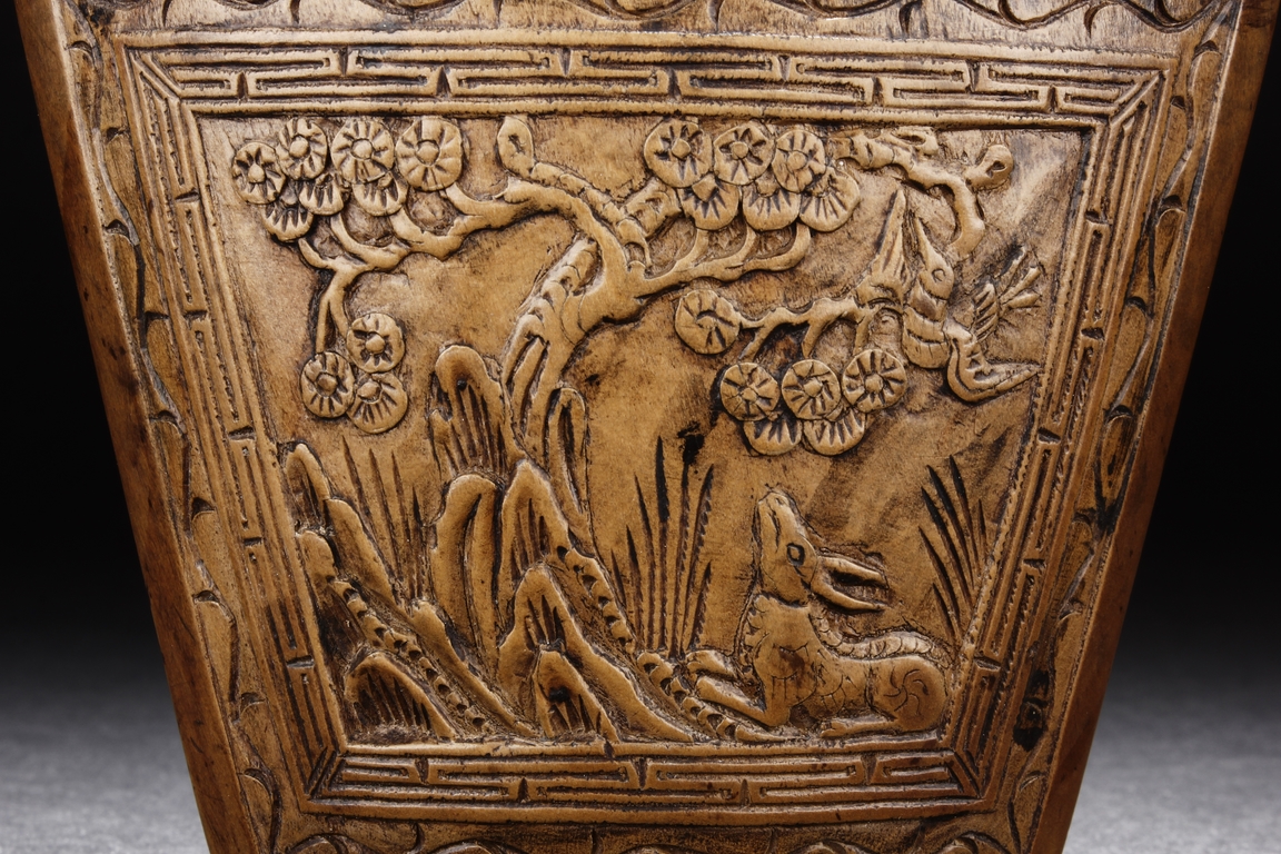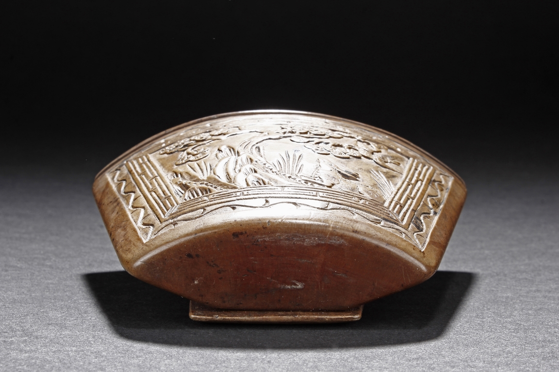 The container is of flattened trapezoid form, the front carved with a deer in a forest setting, looking upwards towards the pine trees, the top lid carved with two confronting mythical beasts with flaming pearl in the middle, the back with a wooden clip. The container was used for carrying tobacco.