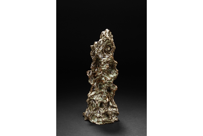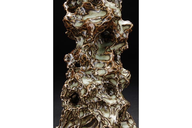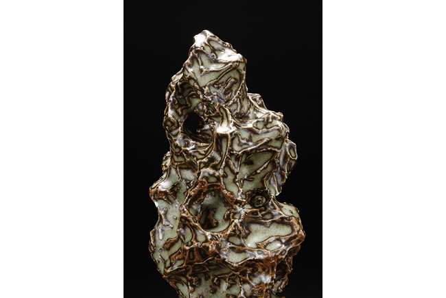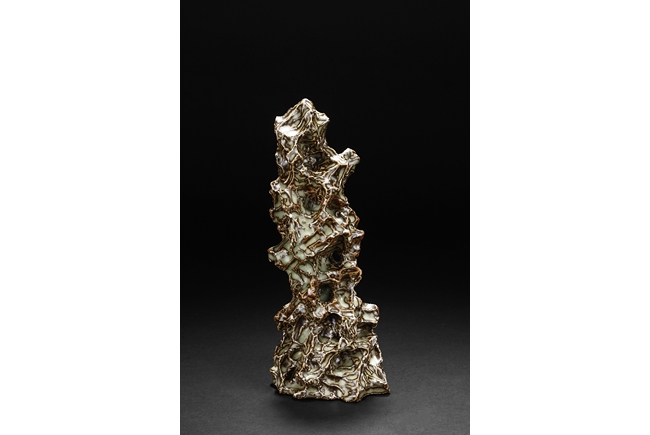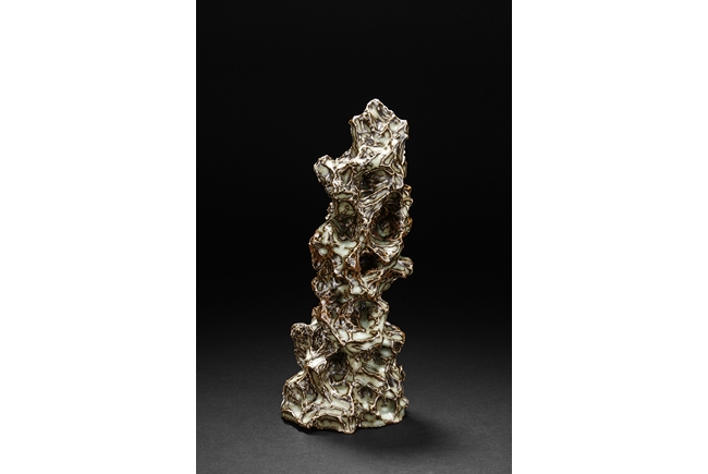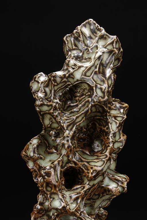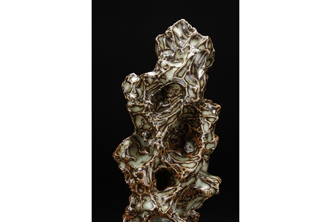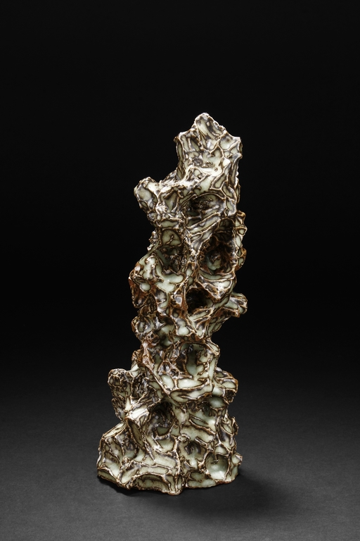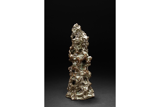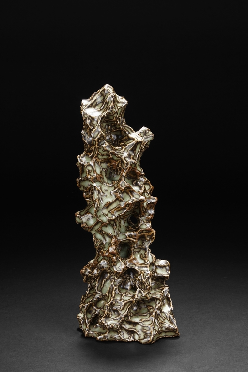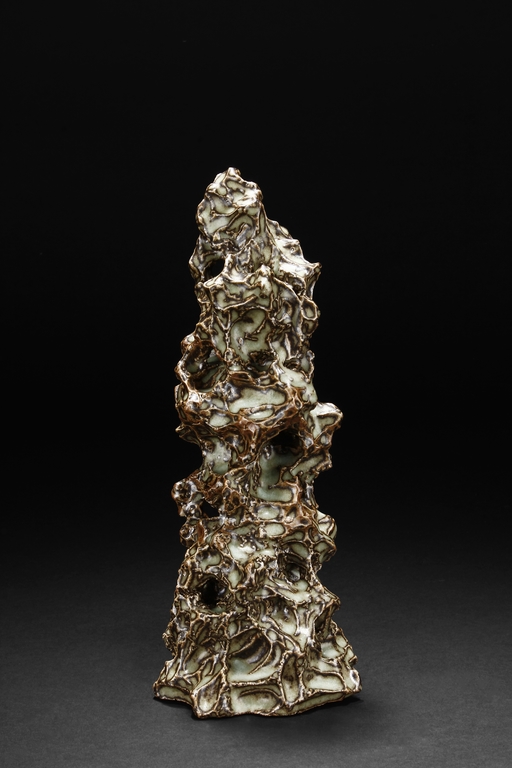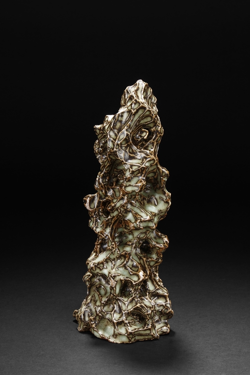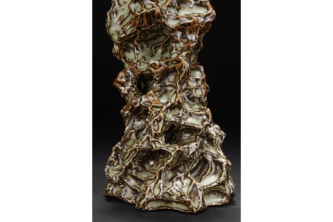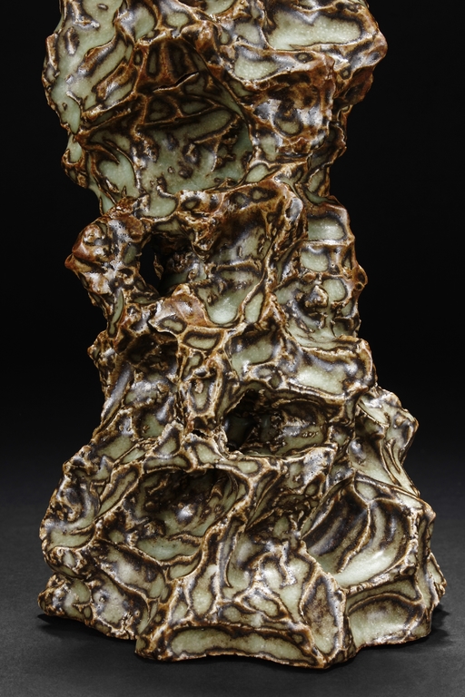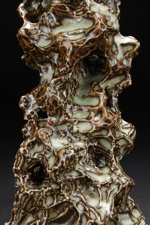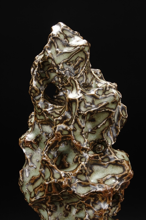 Made from porcelain, the ceramic figure depicts a naturalistic scholar viewing stone, with all edges highlighted in brown similar to tree branches, all on top of light teal ground, the bottom unglazed.