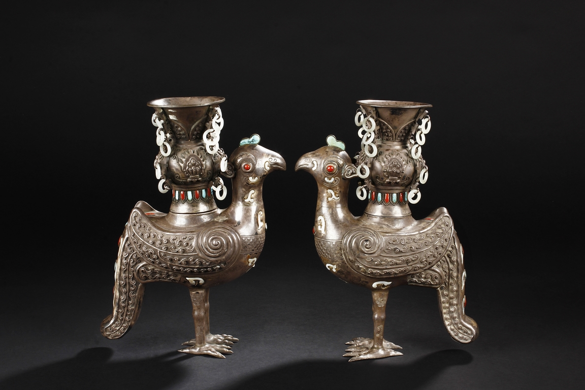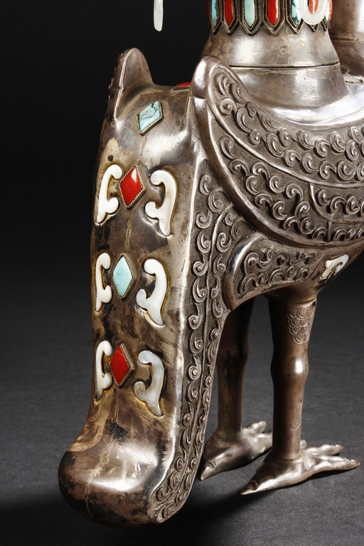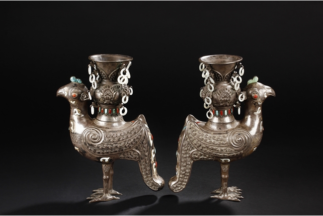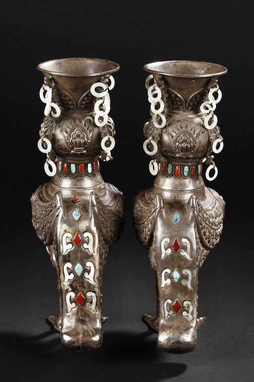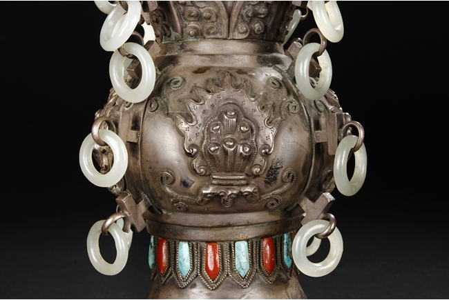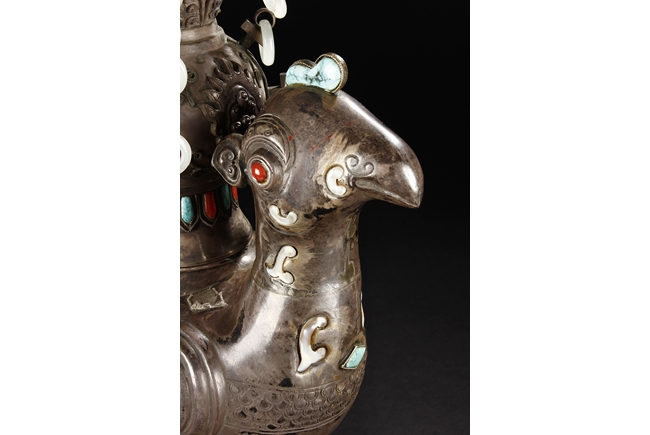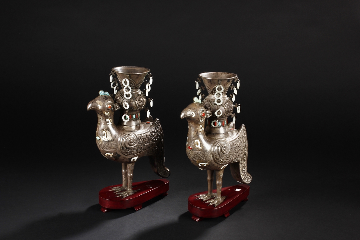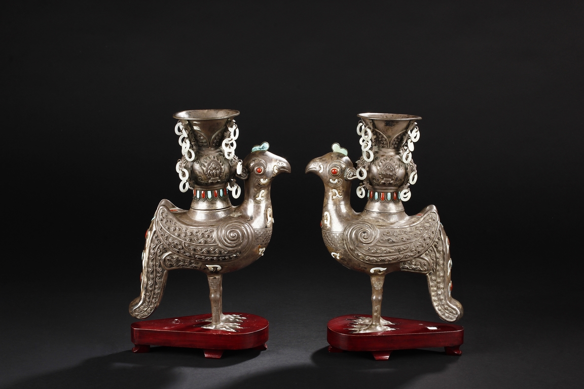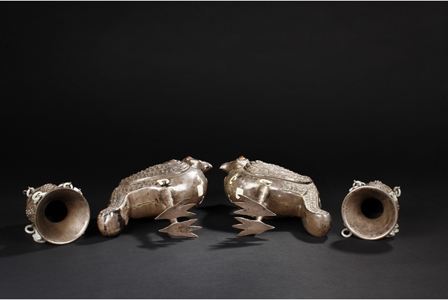 The silver phoenix is cast in pair and decorated with cloud motif in relief to represent the feathers. It is embellished with gems including turquoise and coral beads. Each phoenix carries a Zun-type vessel with numerous white glass rings hanging from the flanges and the body of the vessel cast with Buddhist emblem.