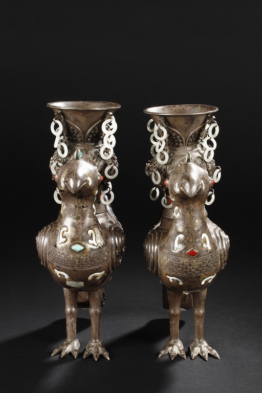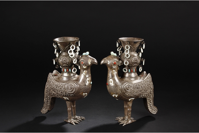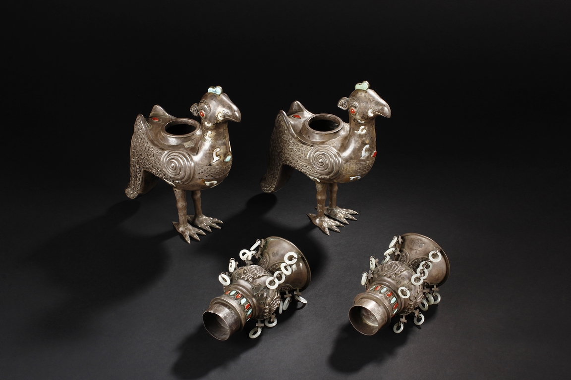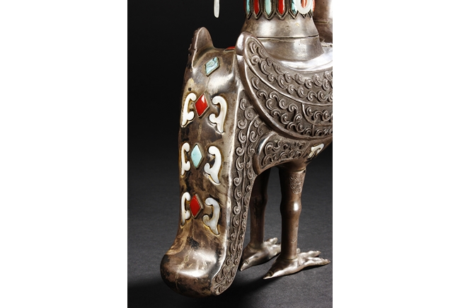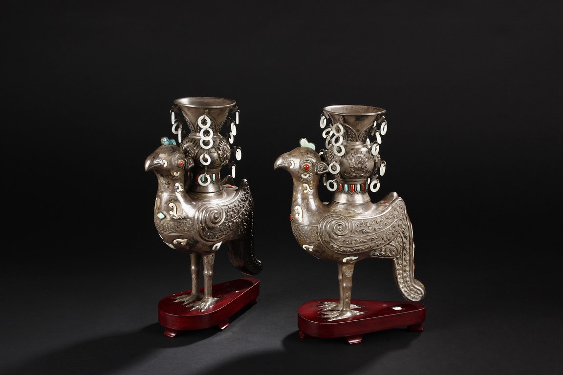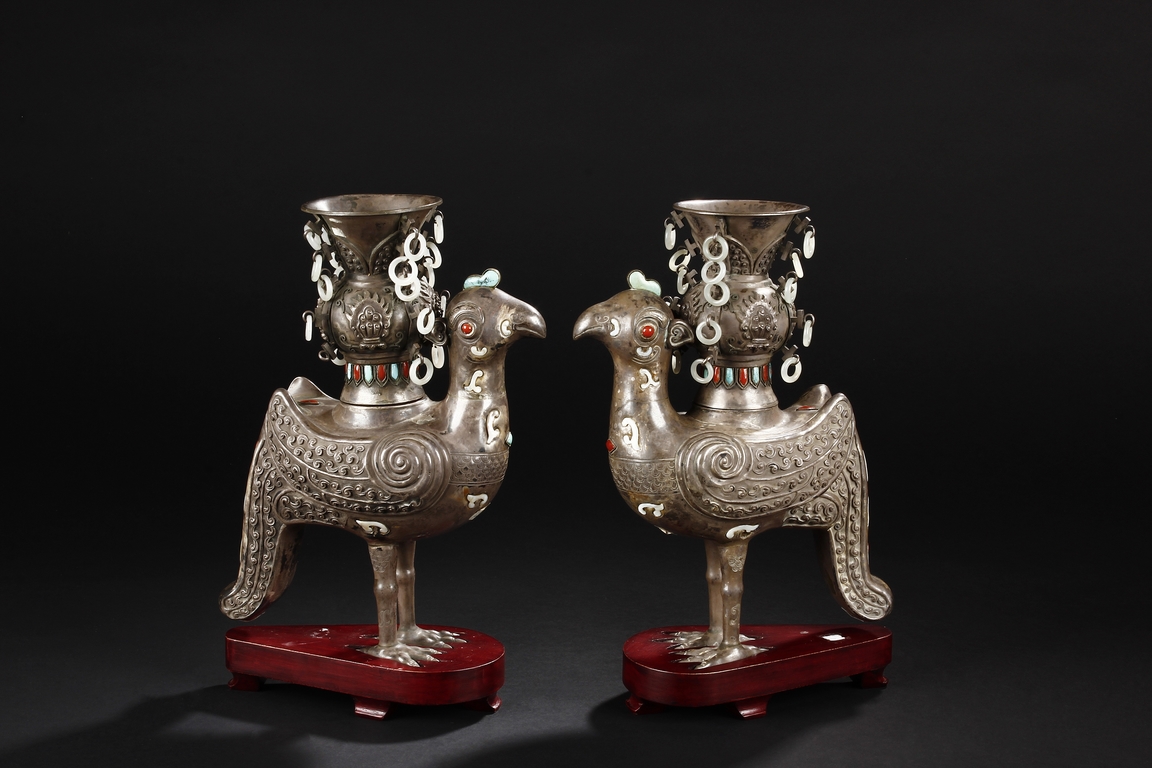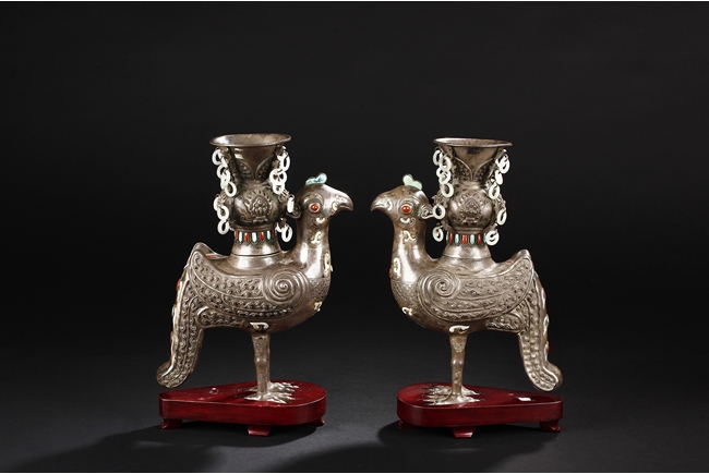 The silver phoenix is cast in pair and decorated with cloud motif in relief to represent the feathers. It is embellished with gems including turquoise and coral beads. Each phoenix carries a Zun-type vessel with numerous white glass rings hanging from the flanges and the body of the vessel cast with Buddhist emblem.