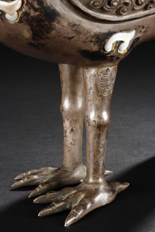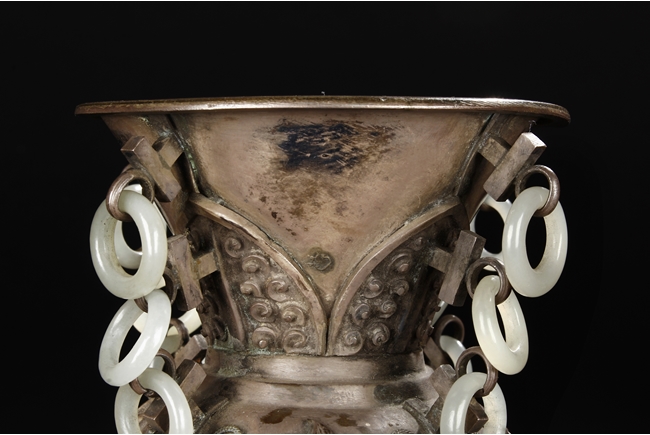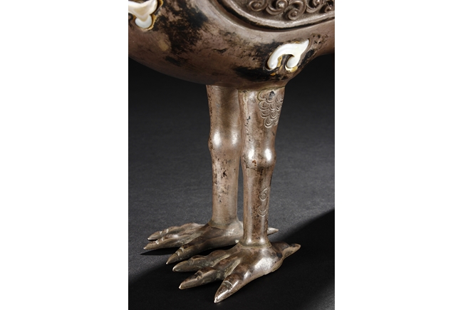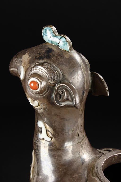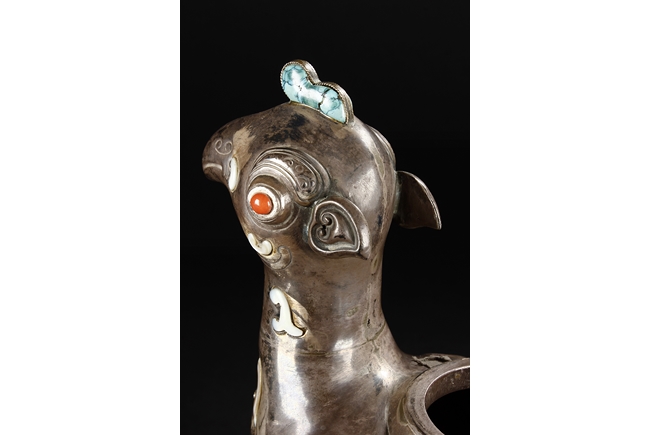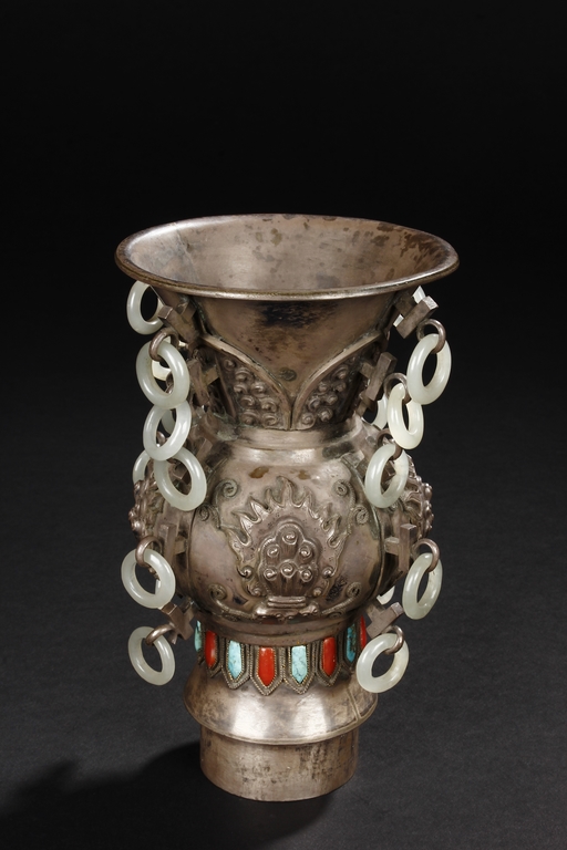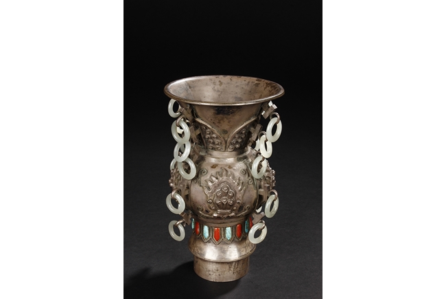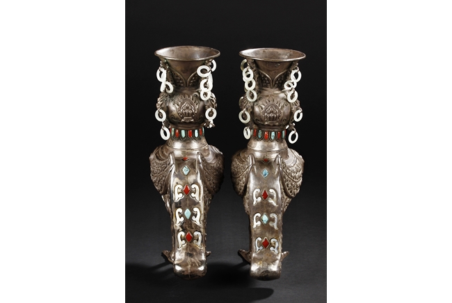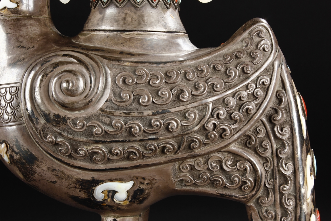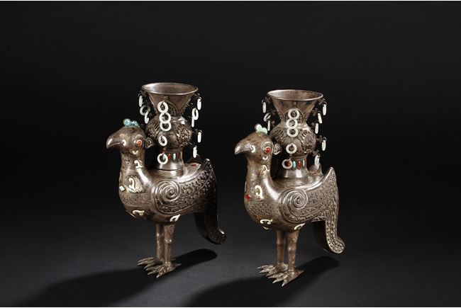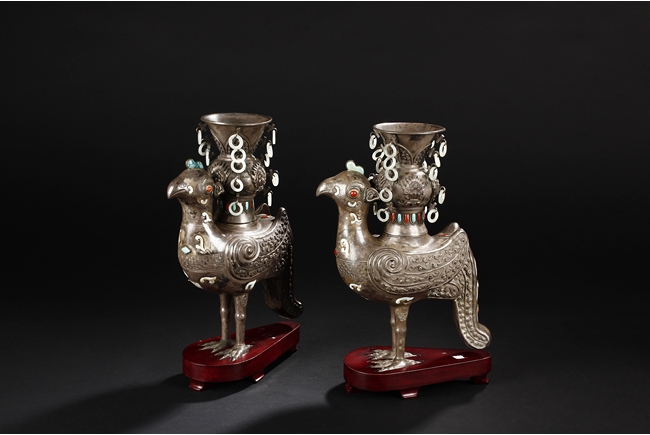 The silver phoenix is cast in pair and decorated with cloud motif in relief to represent the feathers. It is embellished with gems including turquoise and coral beads. Each phoenix carries a Zun-type vessel with numerous white glass rings hanging from the flanges and the body of the vessel cast with Buddhist emblem.