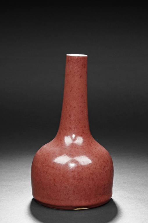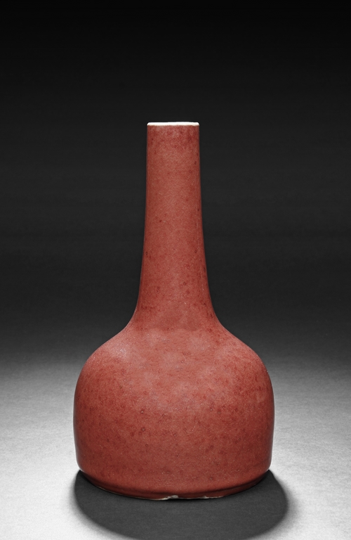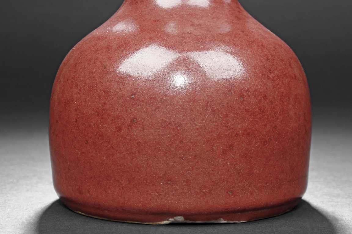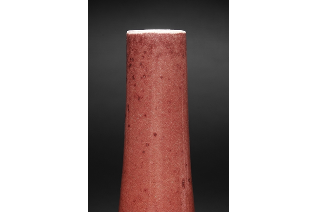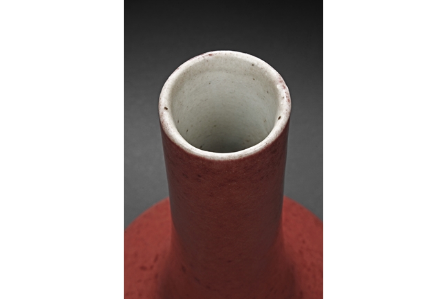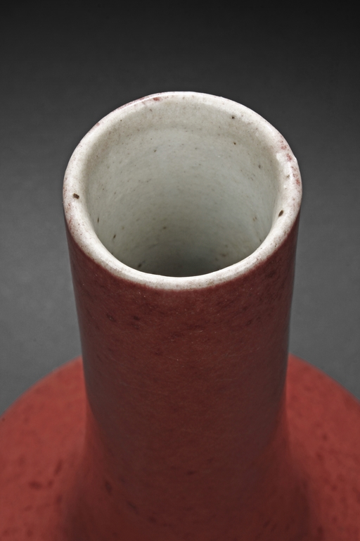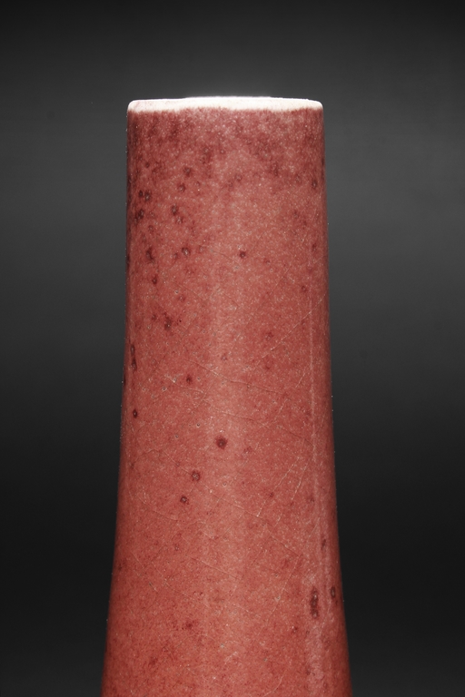 With a broad base and long cylindrical neck, the vase is covered overall in thick and deep red glaze and thinning to the rim in white glaze in interior and base. Qing Dynasty period.