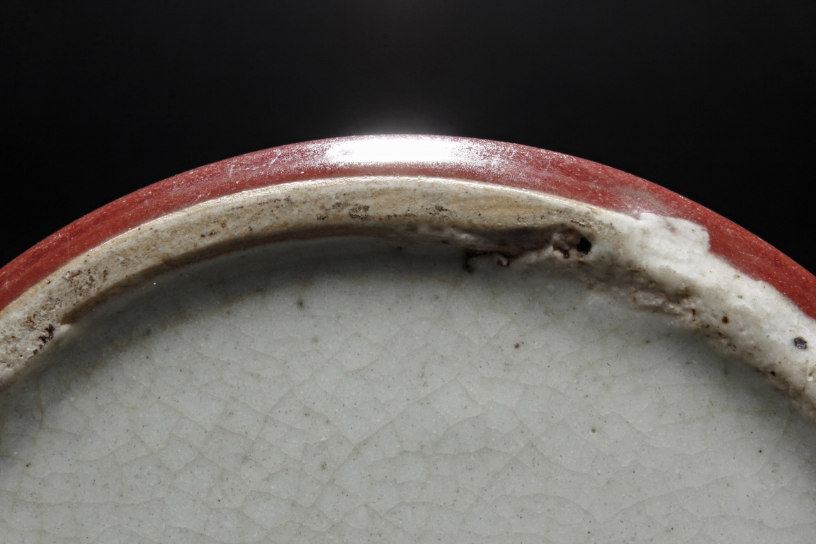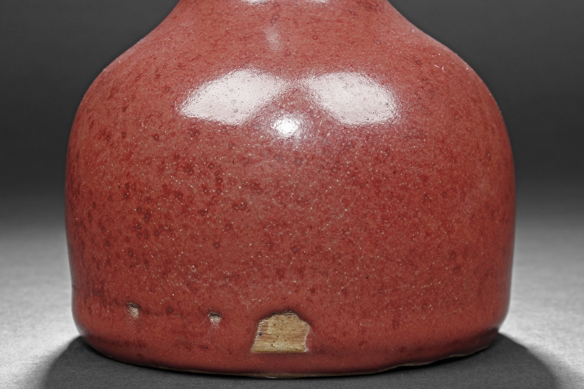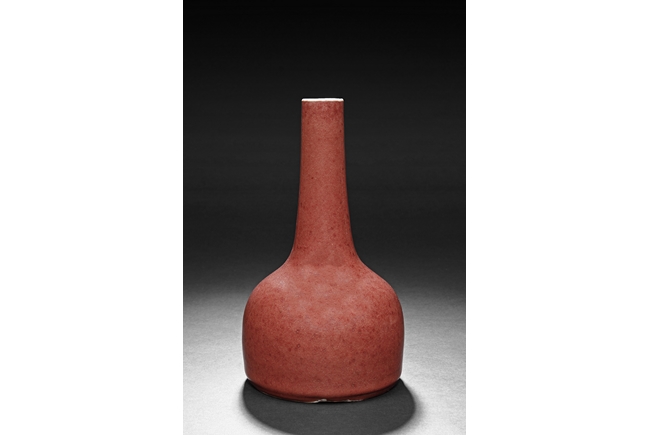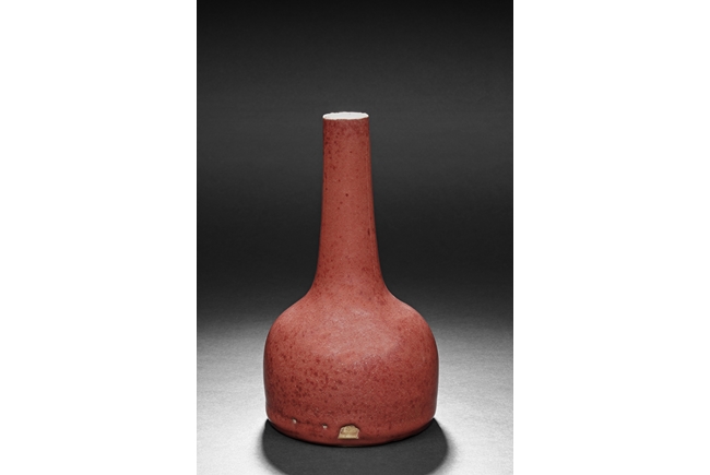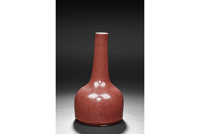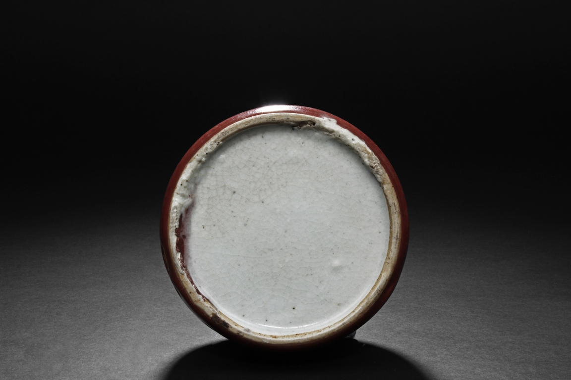 With a broad base and long cylindrical neck, the vase is covered overall in thick and deep red glaze and thinning to the rim in white glaze in interior and base. Qing Dynasty period.