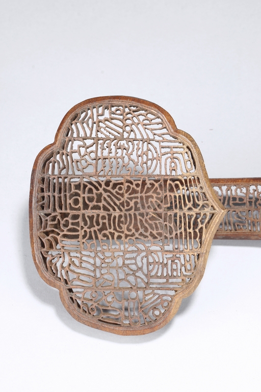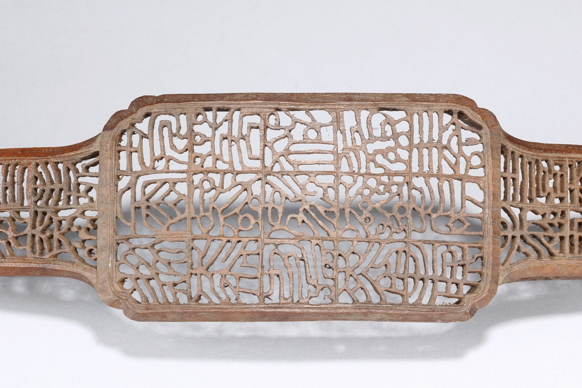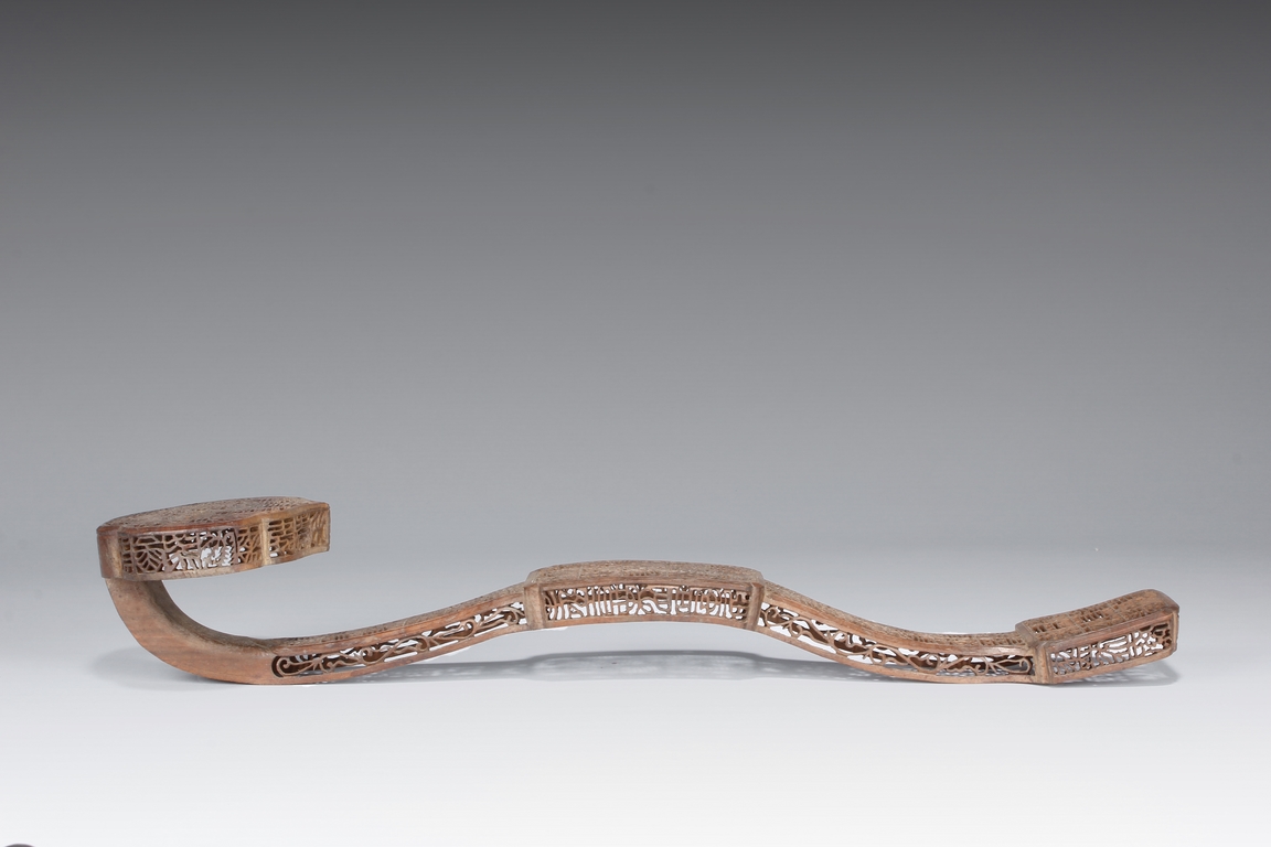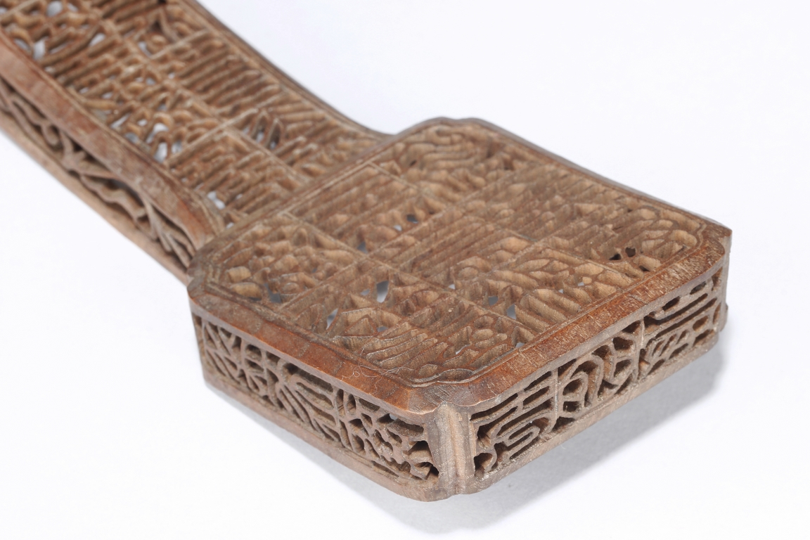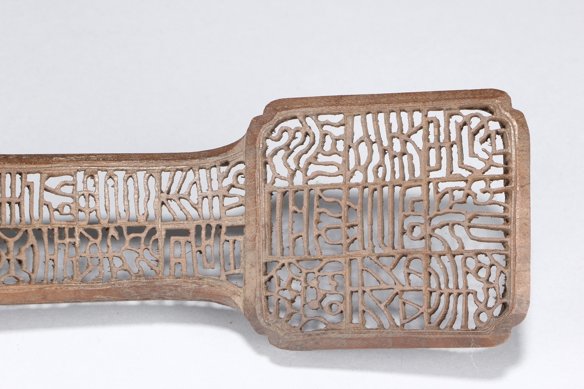 The ruyi-shaped head and the sides are carved and pierced in open work with intricate design in square sections. The arched handle, shaft, and tail are delicately carved with similar designs within the wood frames. Republic period.