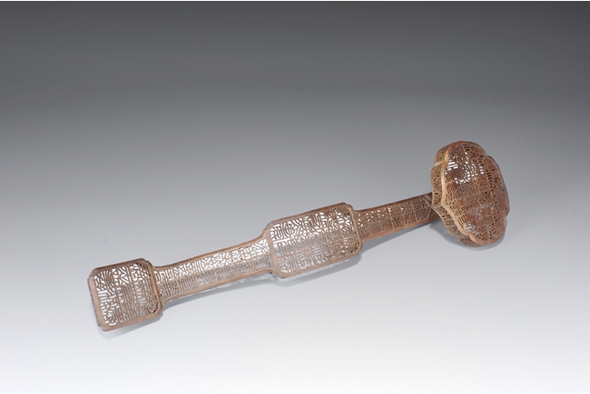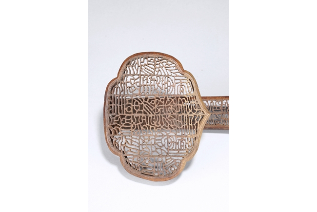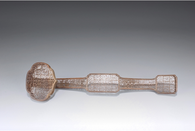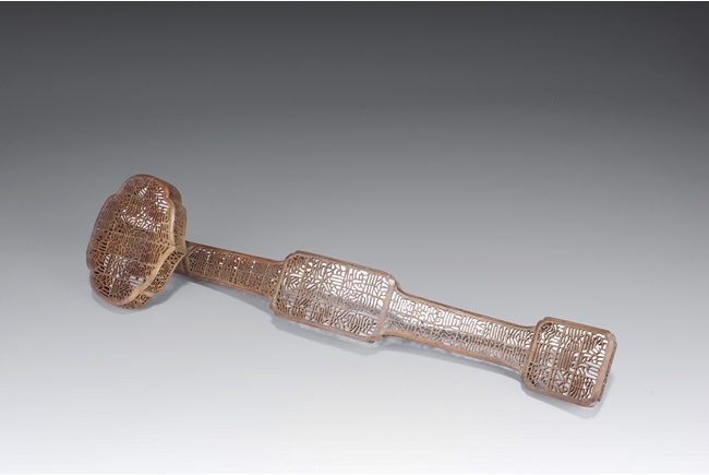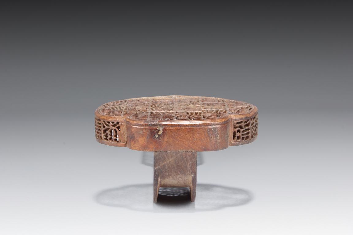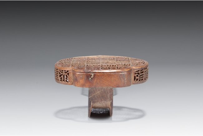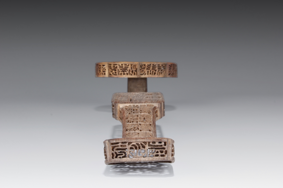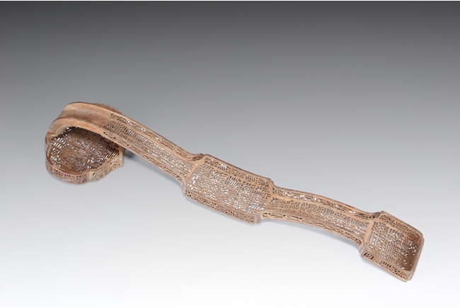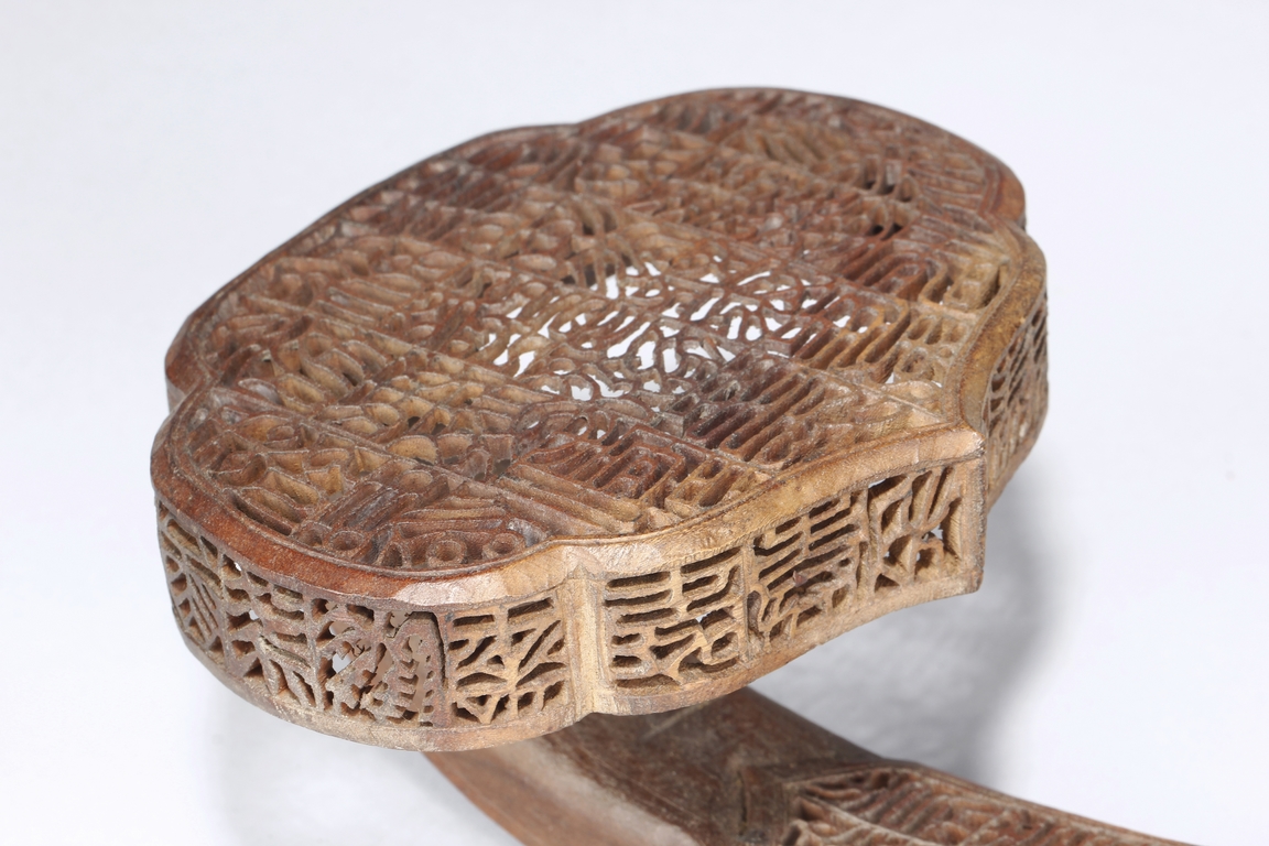 The ruyi-shaped head and the sides are carved and pierced in open work with intricate design in square sections. The arched handle, shaft, and tail are delicately carved with similar designs within the wood frames. Republic period.