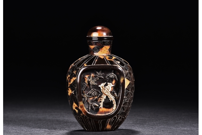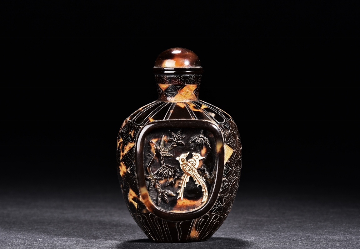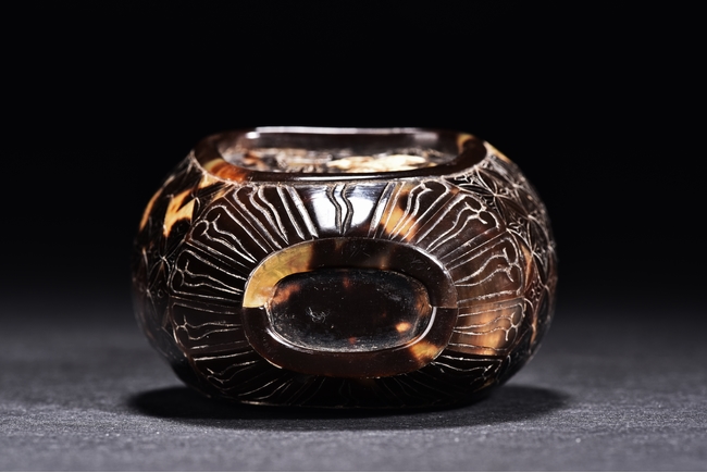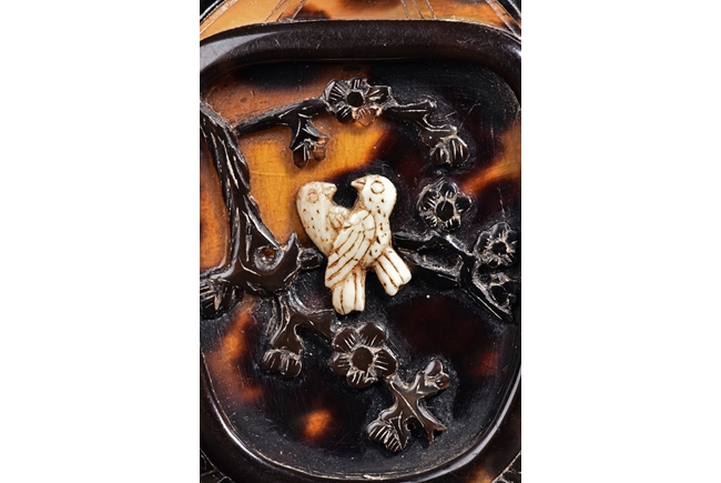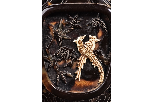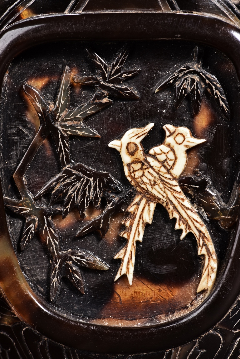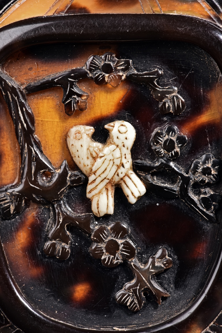 Of flattend ovoid form, the exterior carved in central medallion of two ivory birds on plum tree , and the reverse with two parrots on tree; the sides finely incised with repetitive flower motif. The material is of mottled black and caramel tone. Qing Dynasty Period.