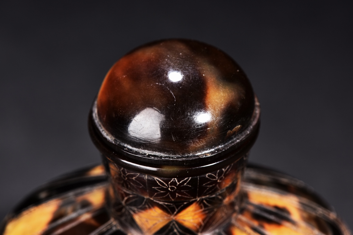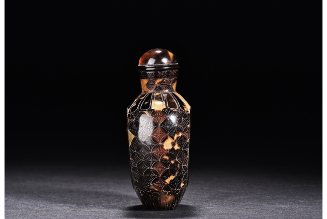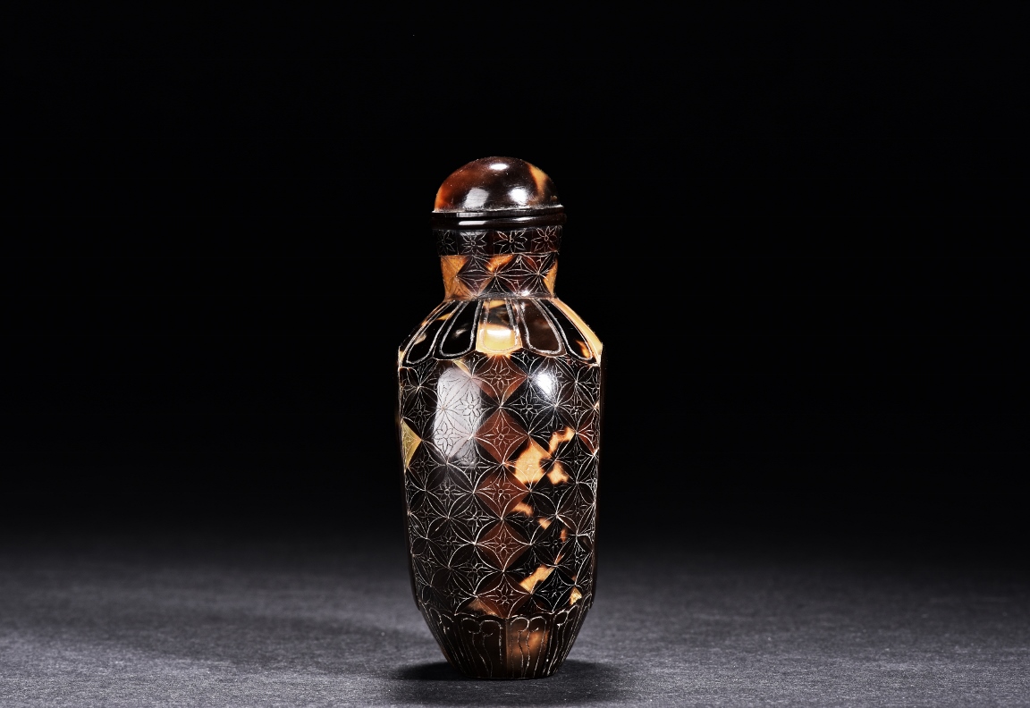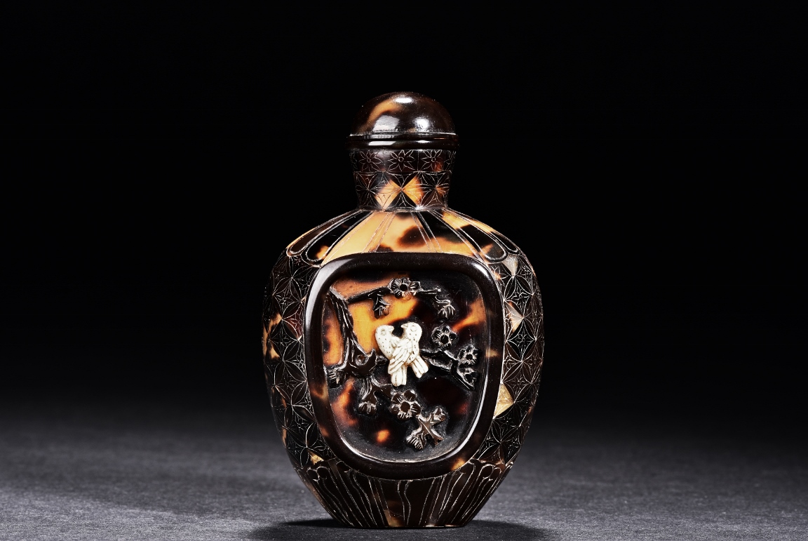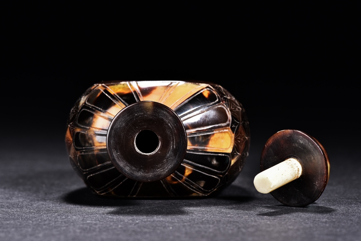 Of flattend ovoid form, the exterior carved in central medallion of two ivory birds on plum tree , and the reverse with two parrots on tree; the sides finely incised with repetitive flower motif. The material is of mottled black and caramel tone. Qing Dynasty Period.