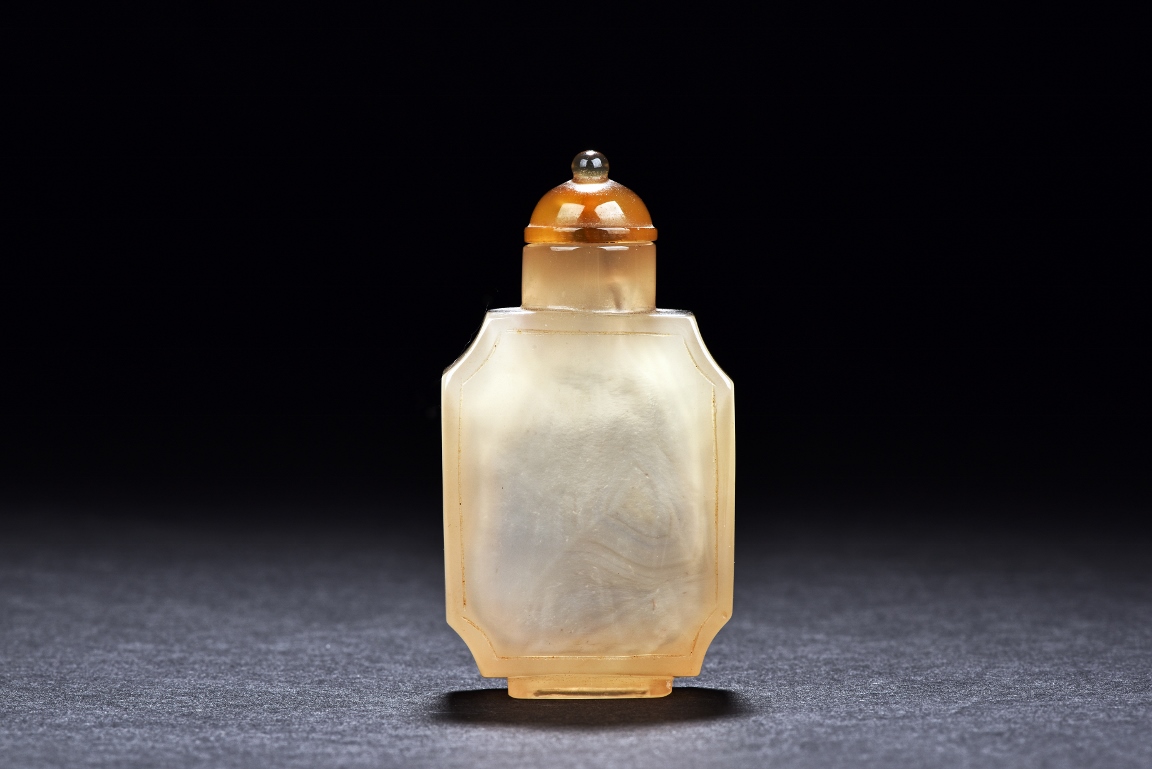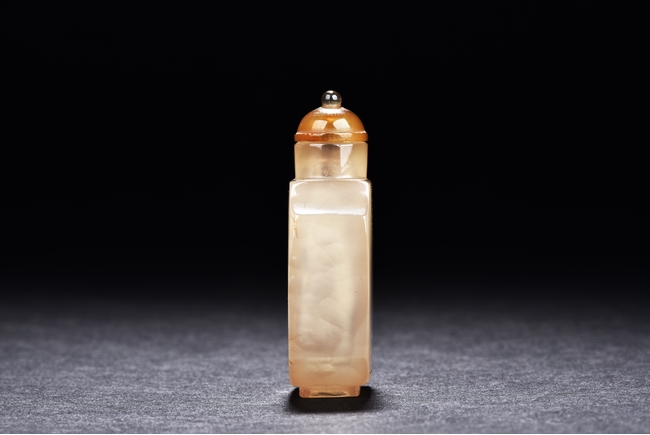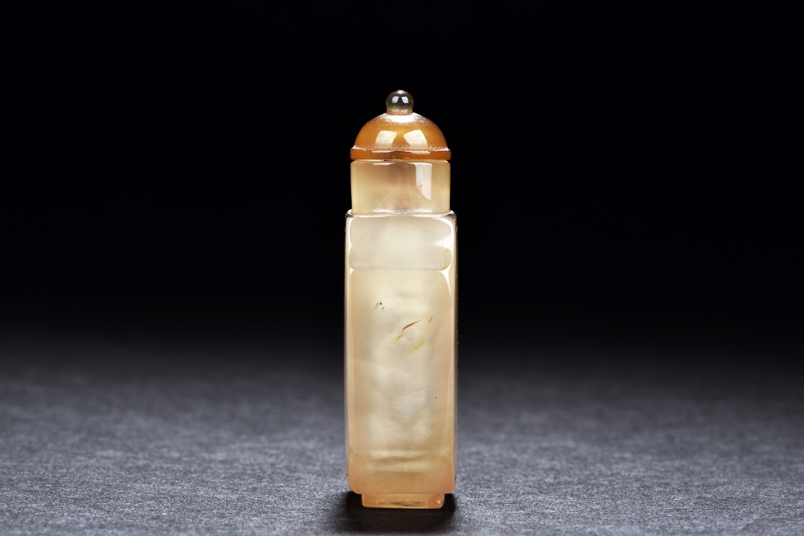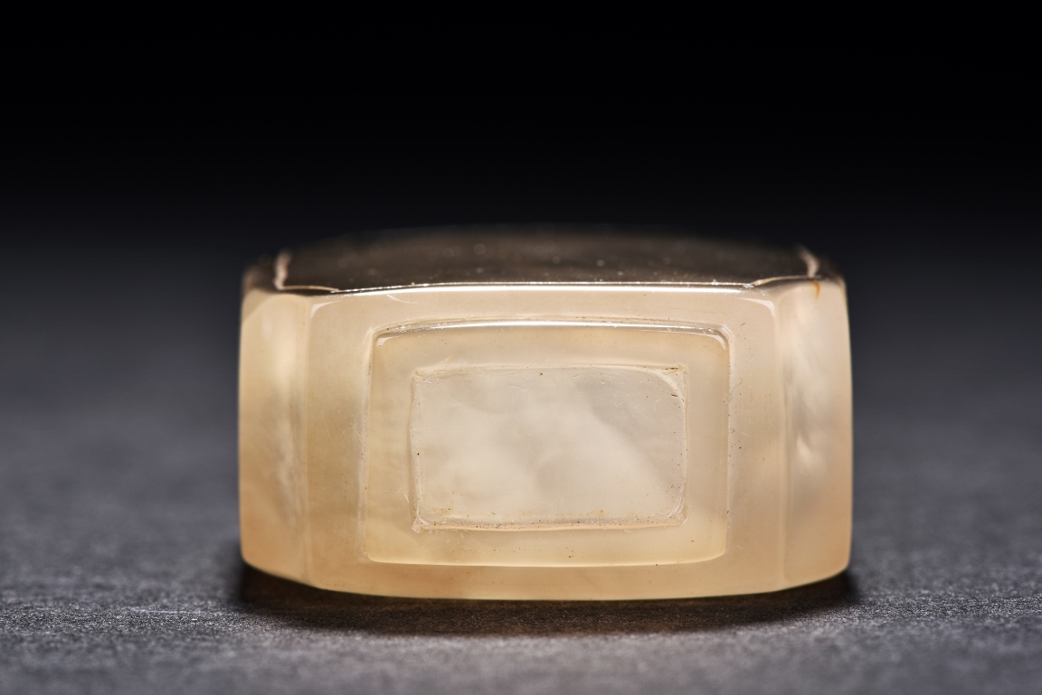 Of rectangular octagonal form and raised on a short foot ring, the stone is of translucent russet tone. Republic period.