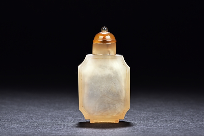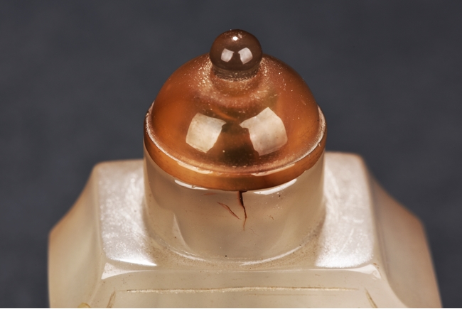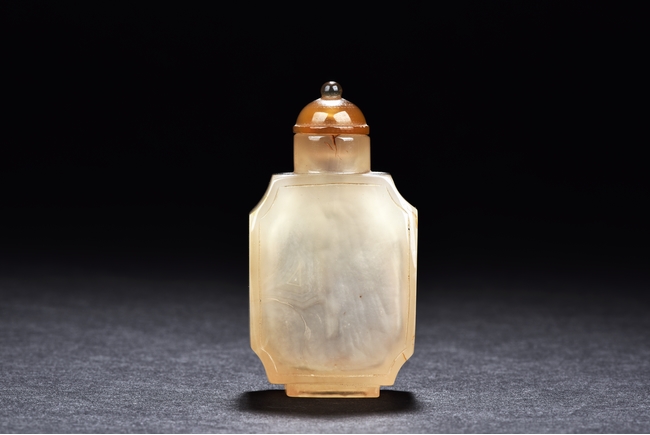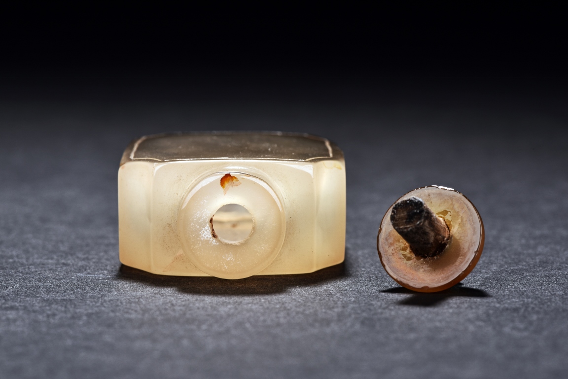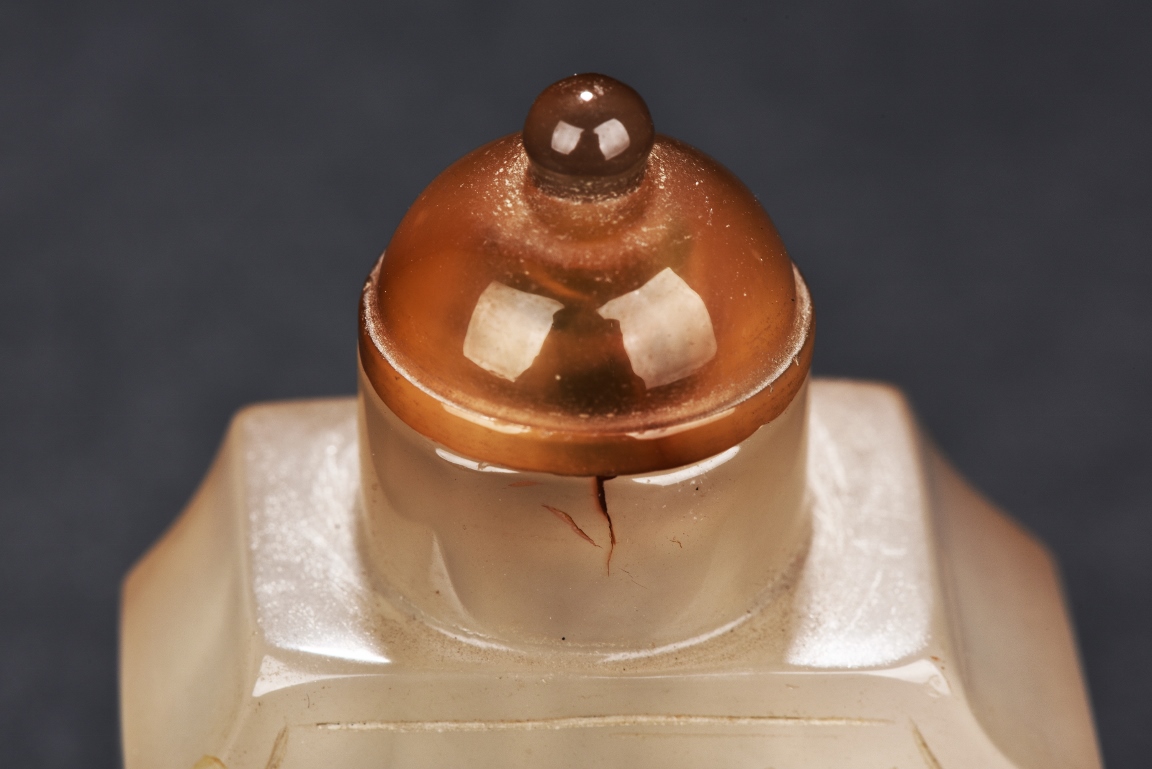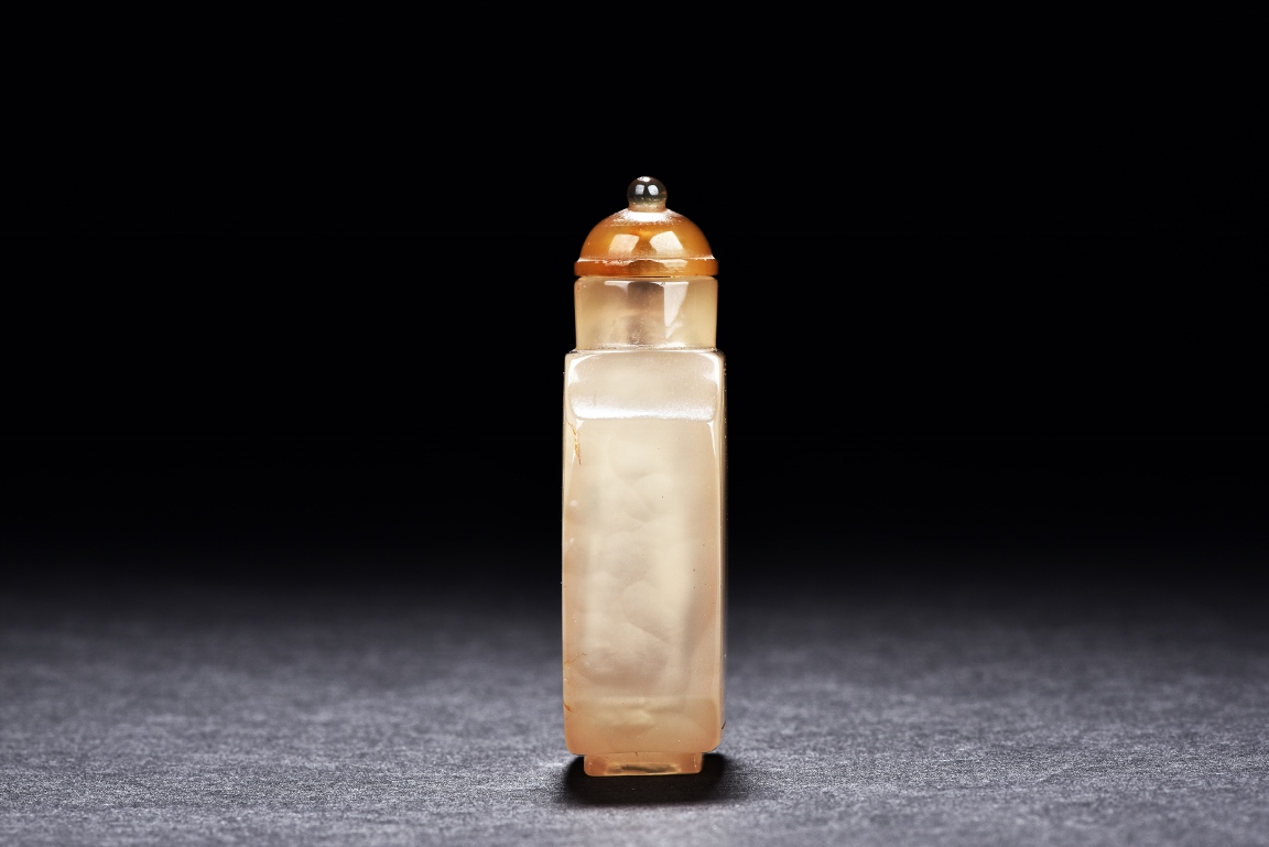 Of rectangular octagonal form and raised on a short foot ring, the stone is of translucent russet tone. Republic period.