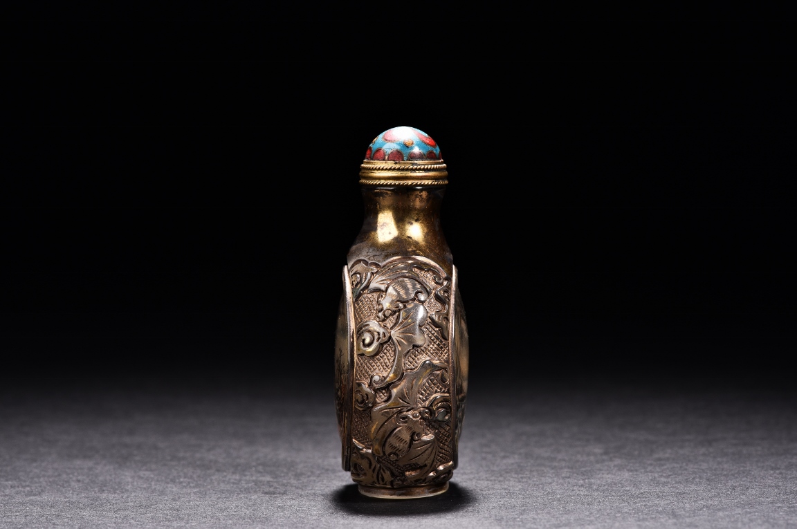 The snuff bottle is of flattened form, with a central medallion featuring an inside painted landscape on both sides, one with author's inscription 'Zhou Le Yuan', the sides finely carved with auspicious bats and clouds in relief; the body is gilt-painted. Qing Dynasty period.