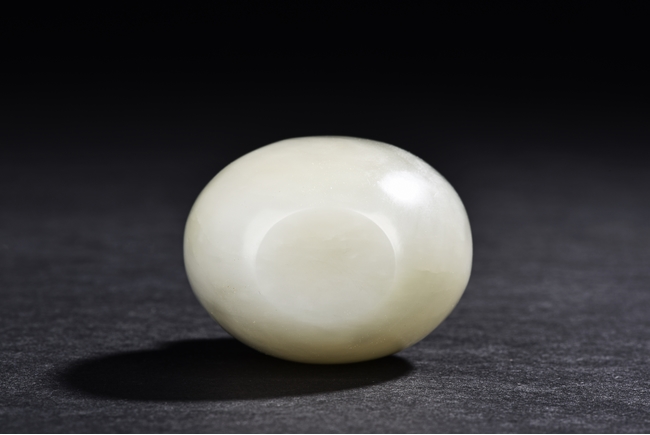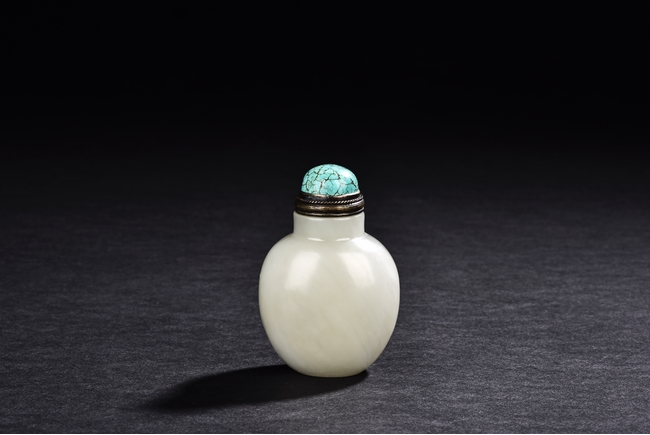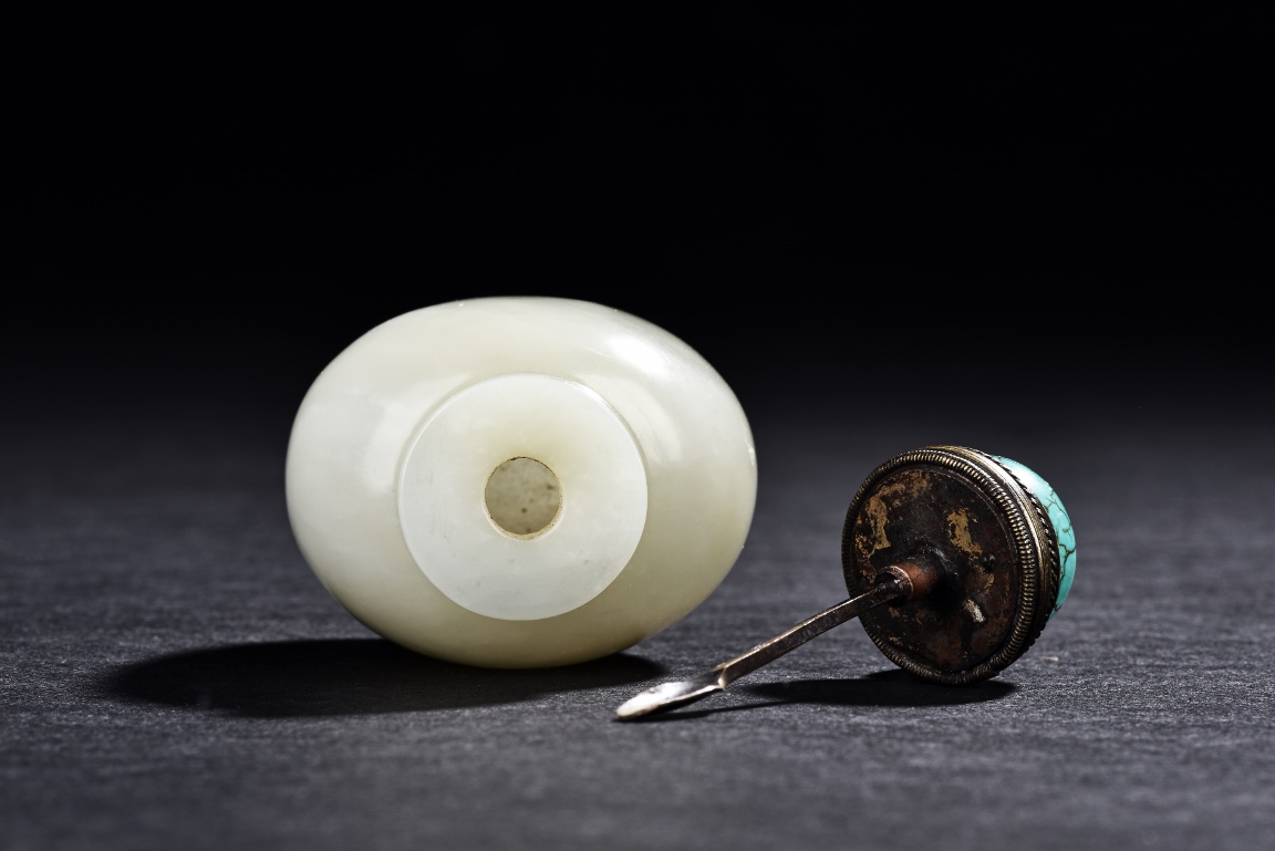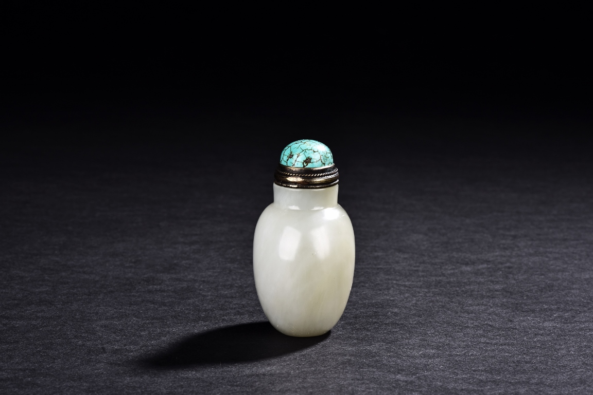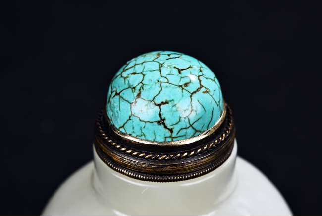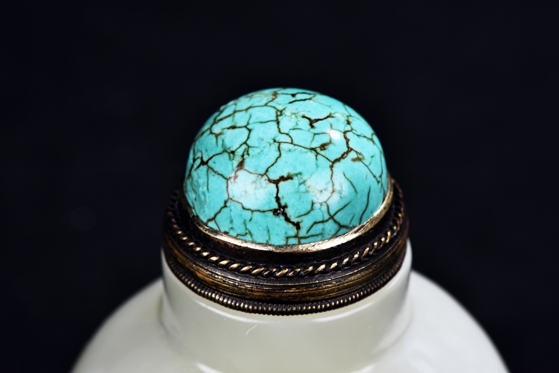 Of ovoid form, the snuff bottle has a straight neck, the matching stopper is of half globular turquoise bead with natural crackled texture. The stone is of even white tone. Republic period.