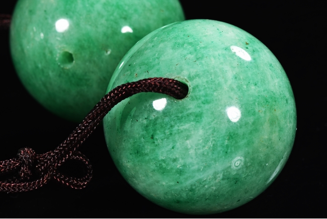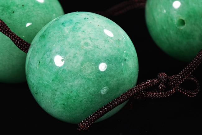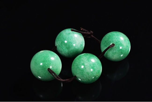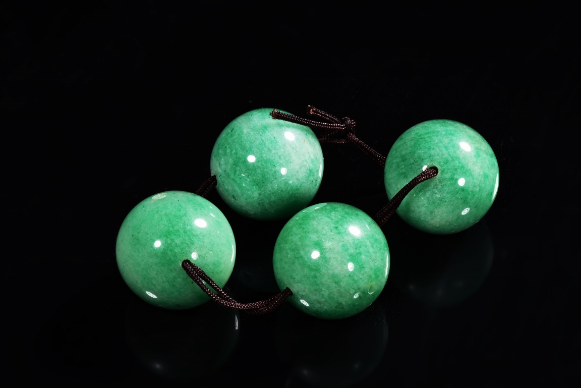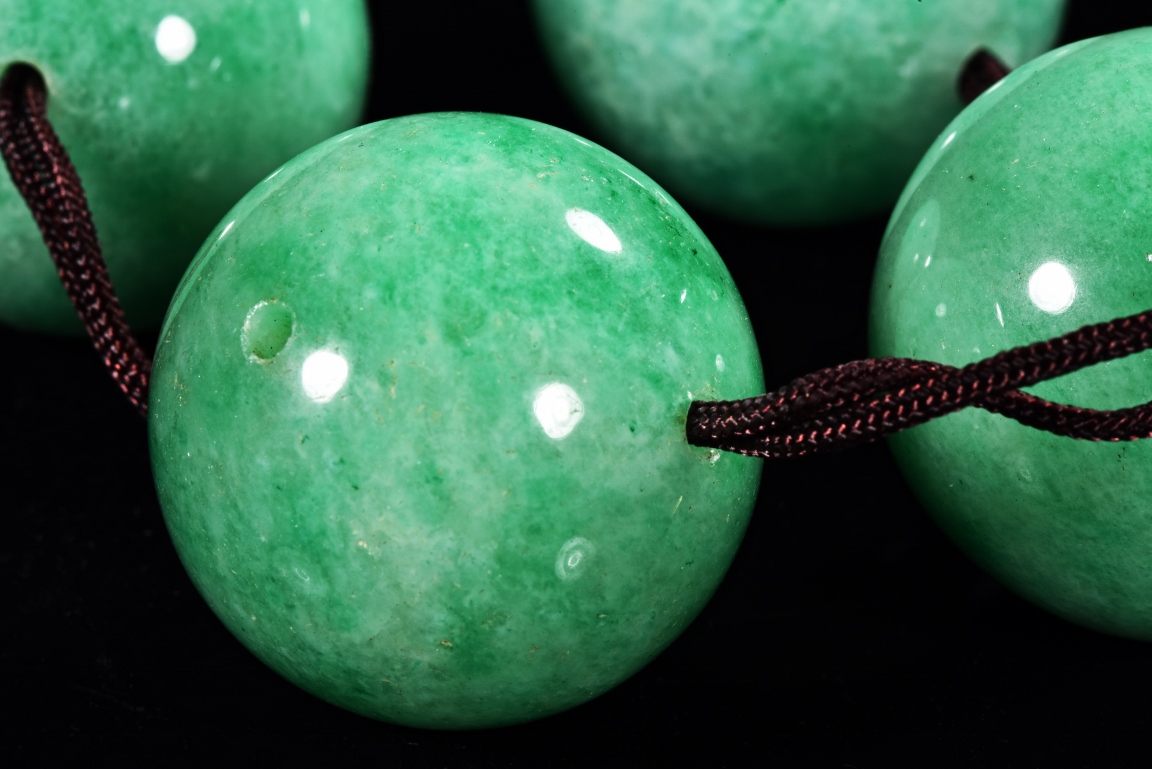 Comprising of four rounded beads (D: 1 1/8 in) connected by a string. The stone is of mottled green tone. Qing Dynasty period.