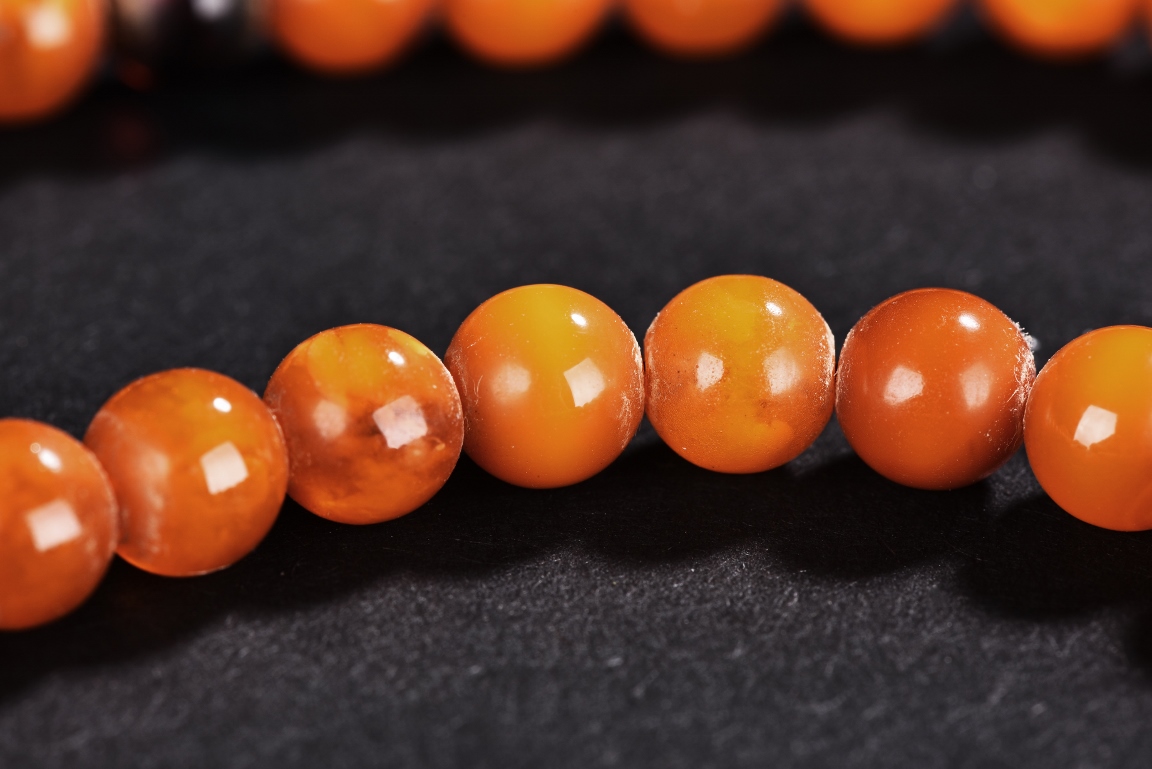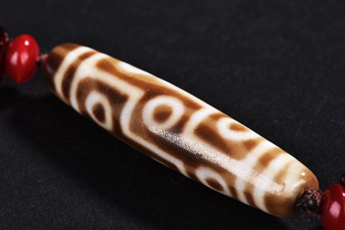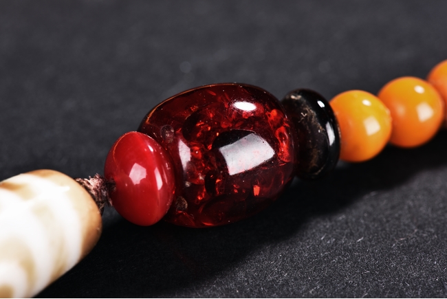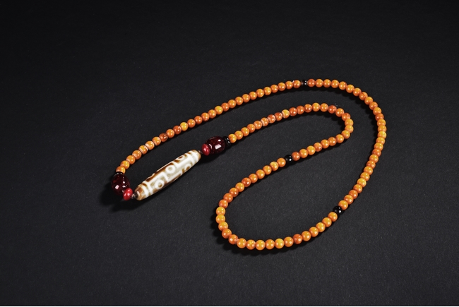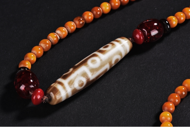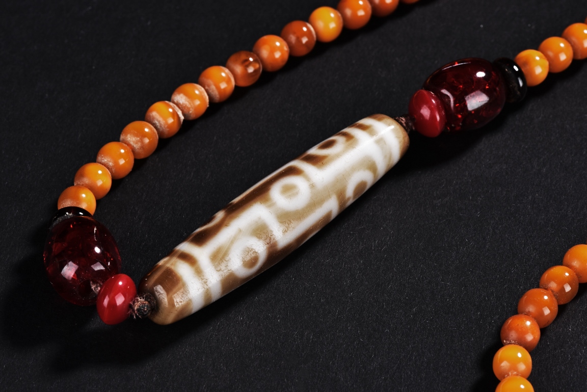 The necklace comprises of amber beads and a Dzi bead. Qing Dynasty period.