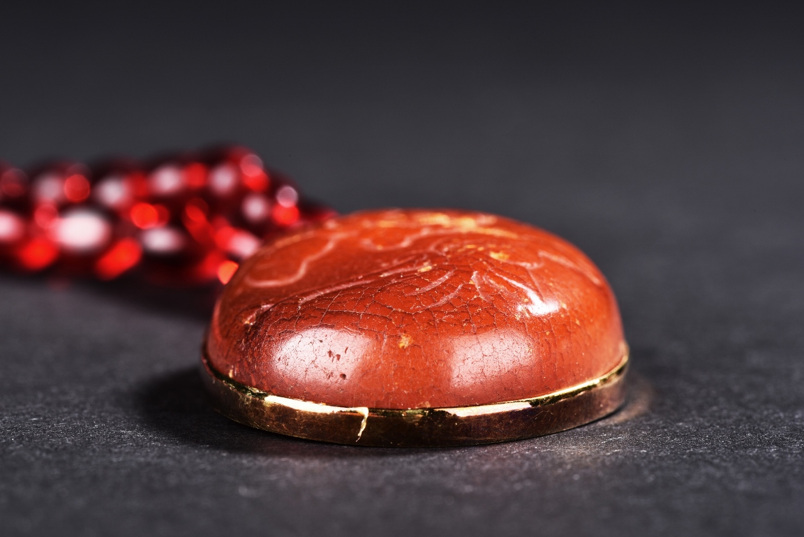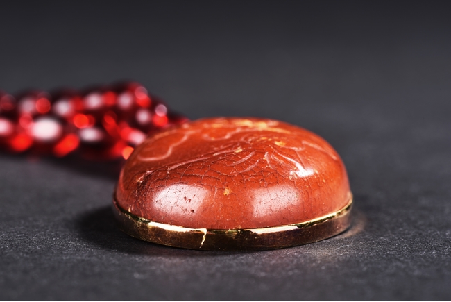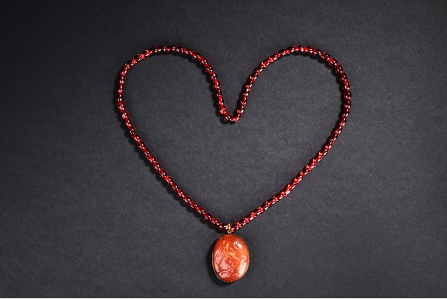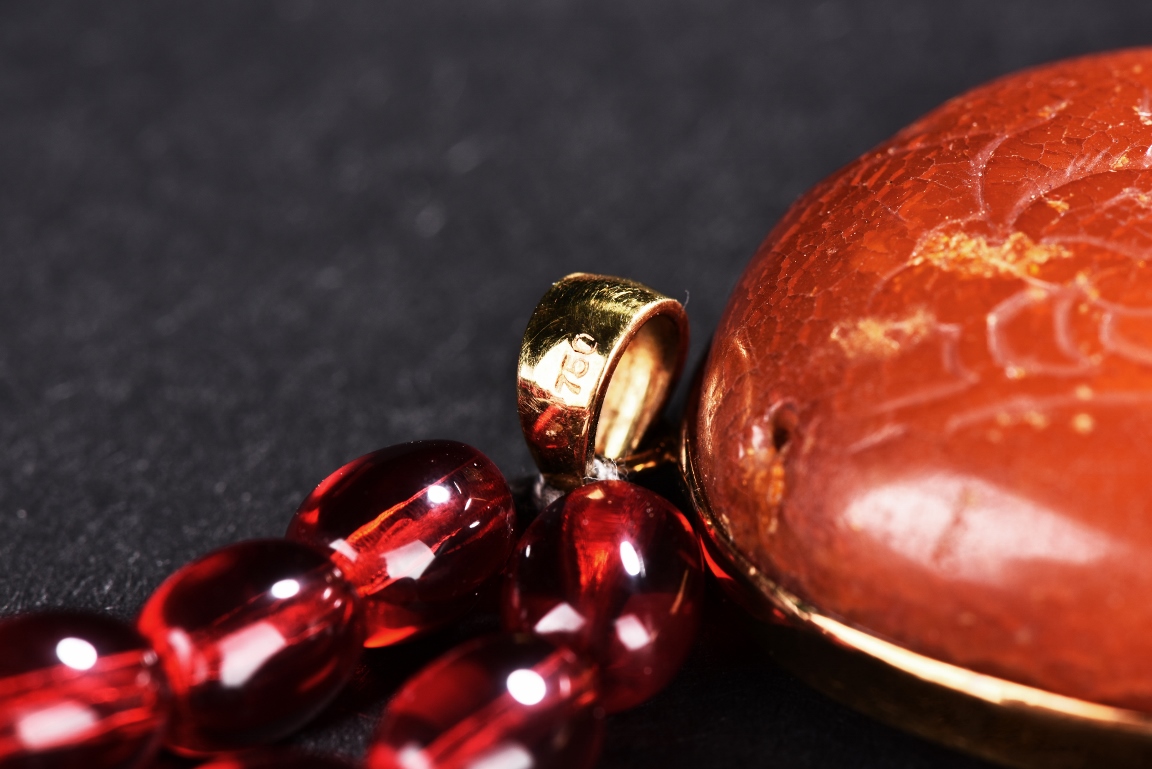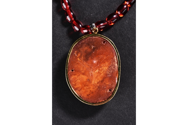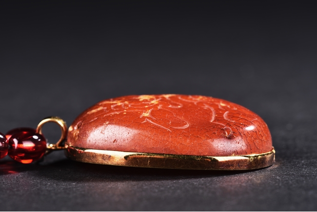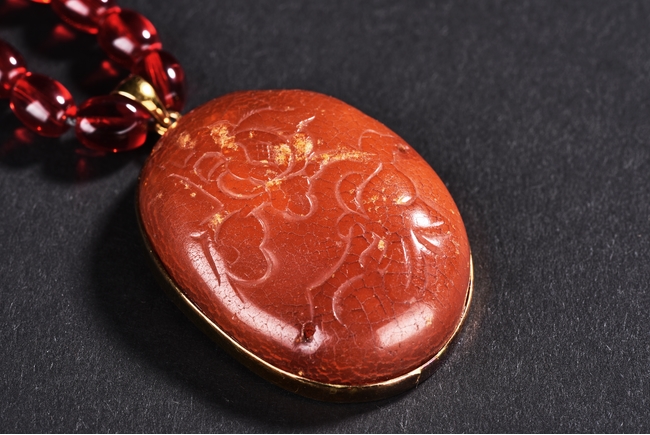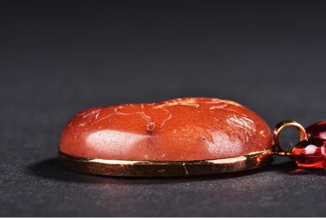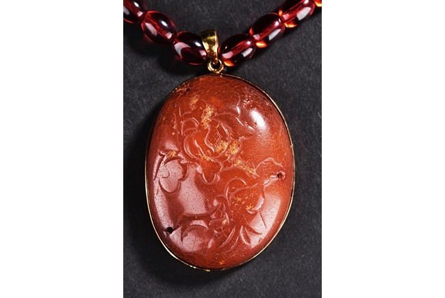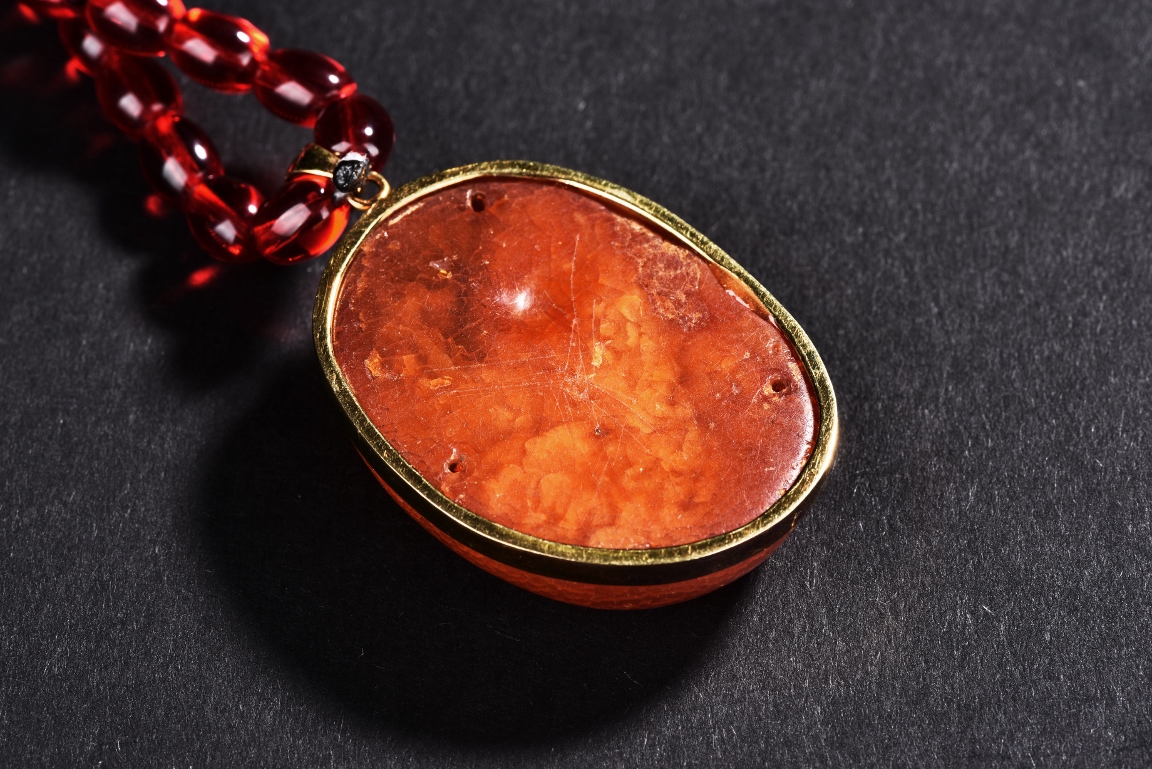 The necklace comprises of an ovoid shaped amber pendant with incised decoration, the tone is of opaque caramel tone mounted on metal. Qing Dynasty period.