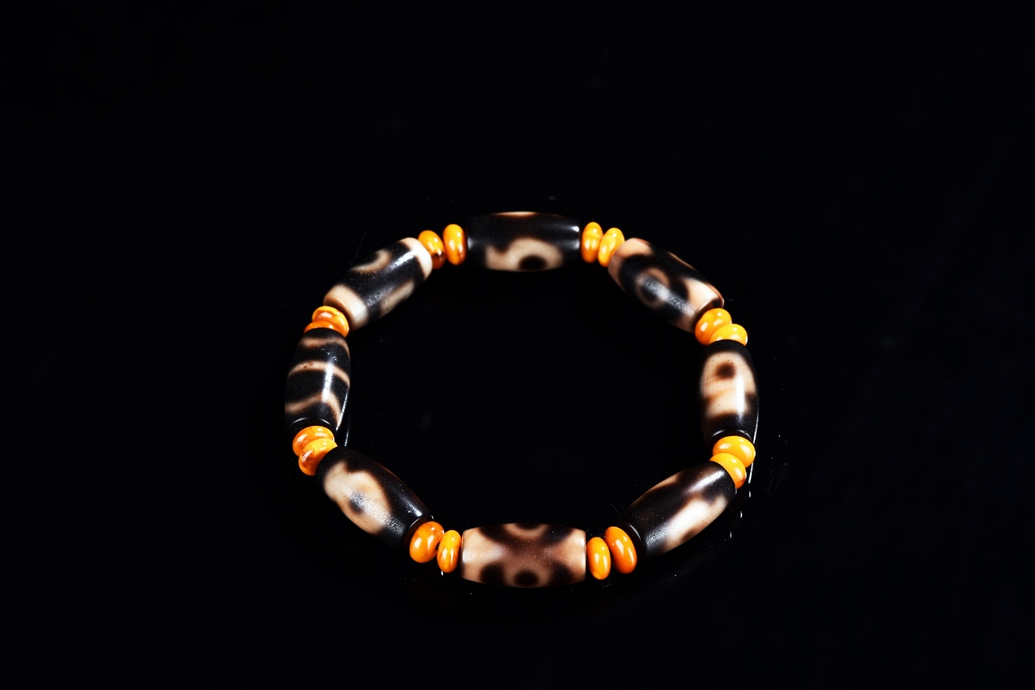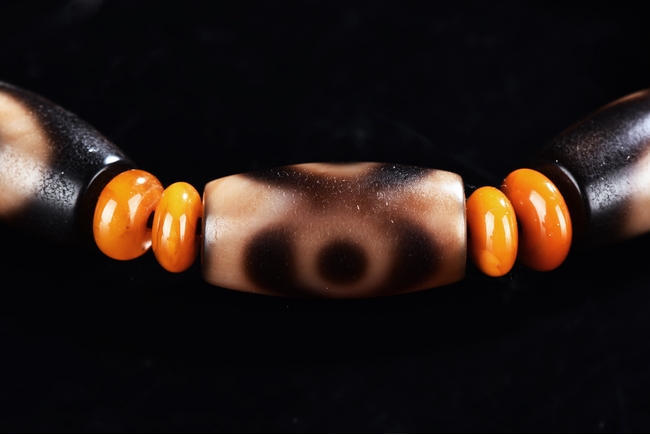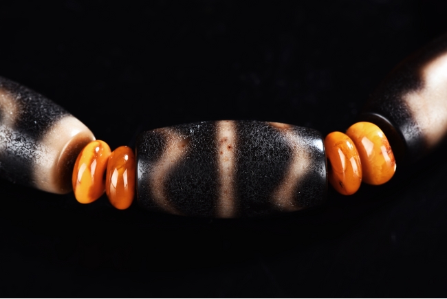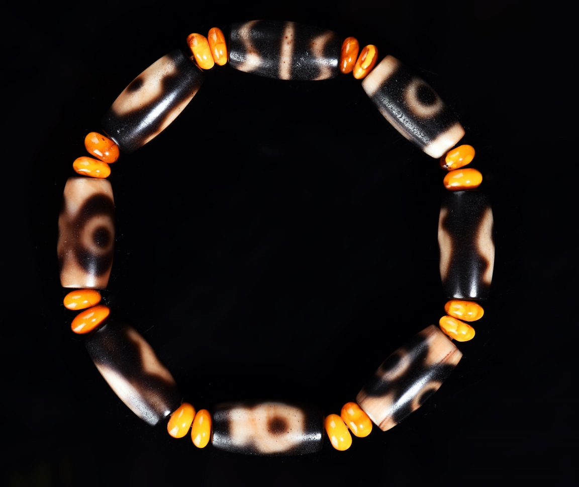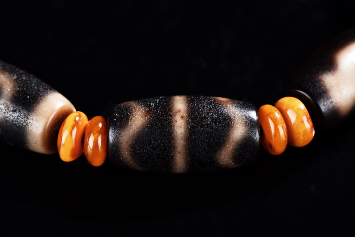 The bracelet comprises of eight Dzi beads, each divided by two amber beads. Han Dynasty period.