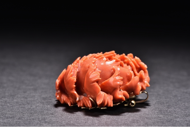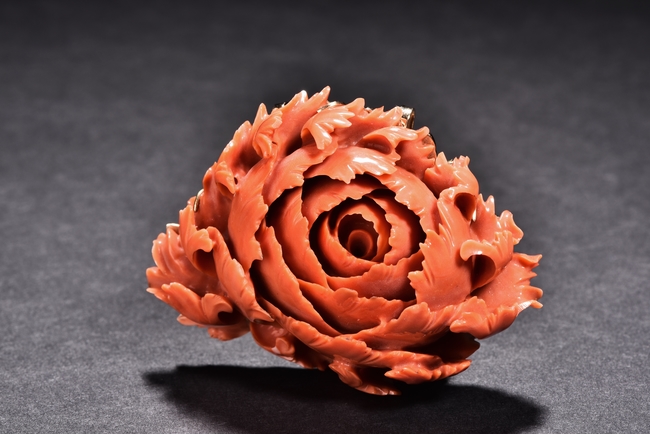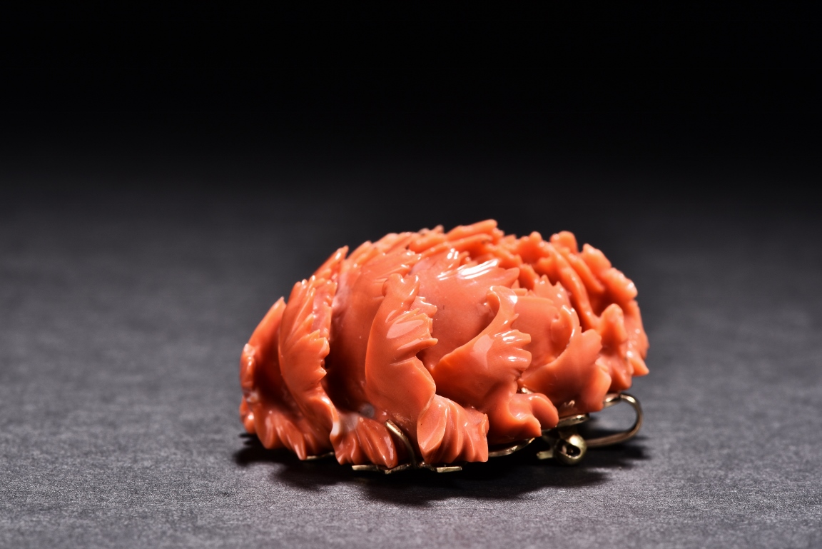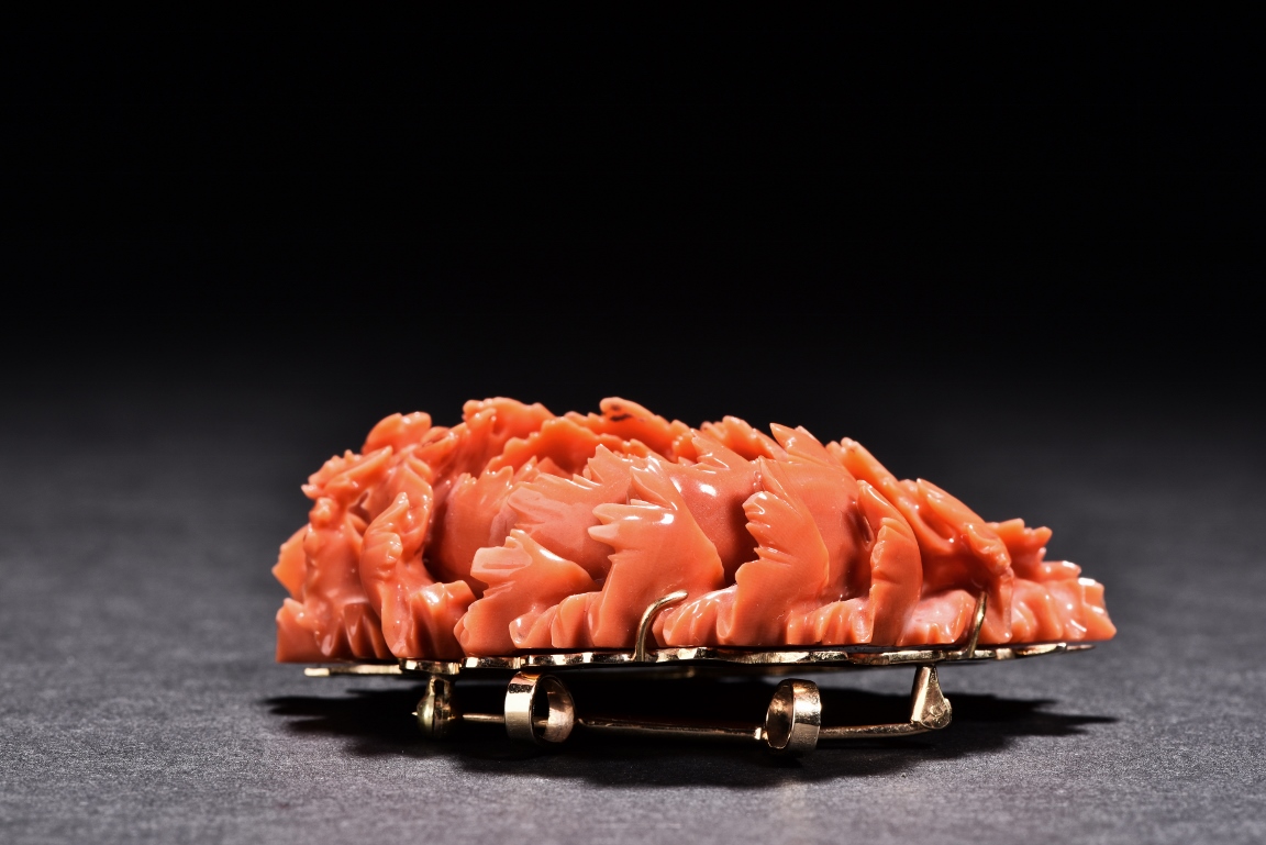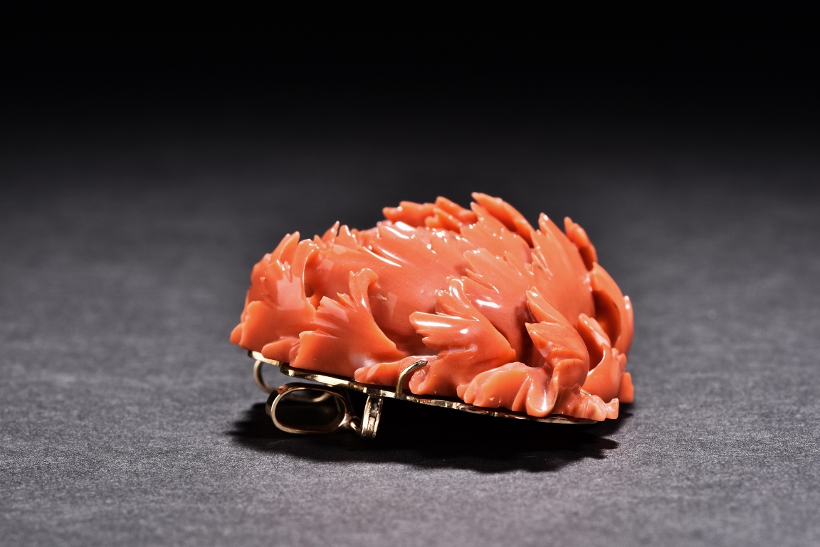 A CORAL CARVED PEONY BROOCH 十九世紀 珊瑚雕牡丹胸針