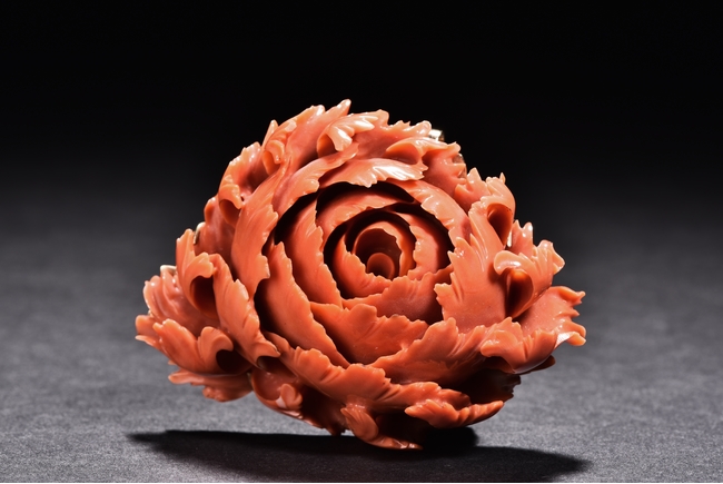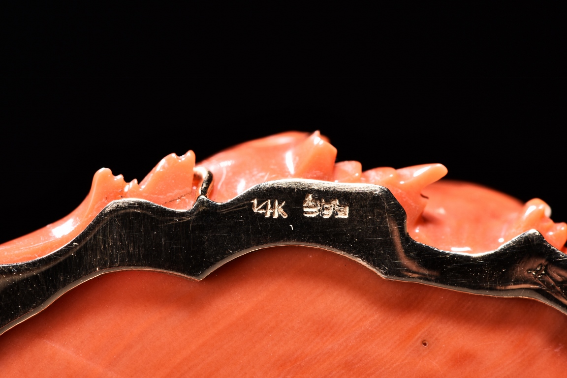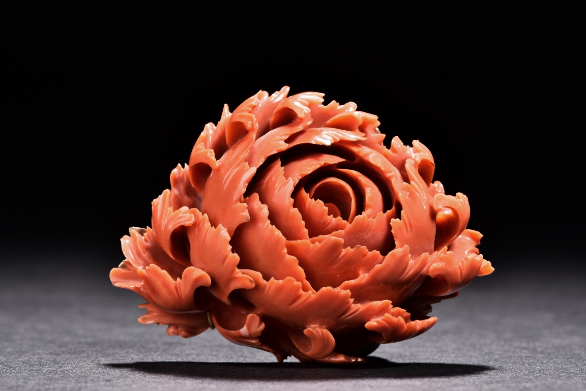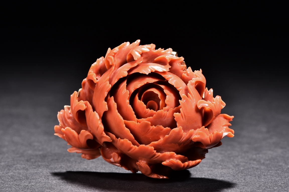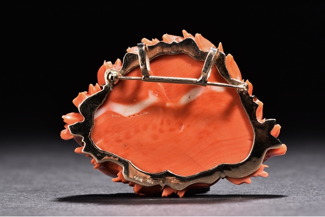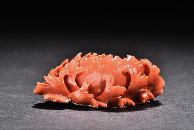 A CORAL CARVED PEONY BROOCH 十九世紀 珊瑚雕牡丹胸針